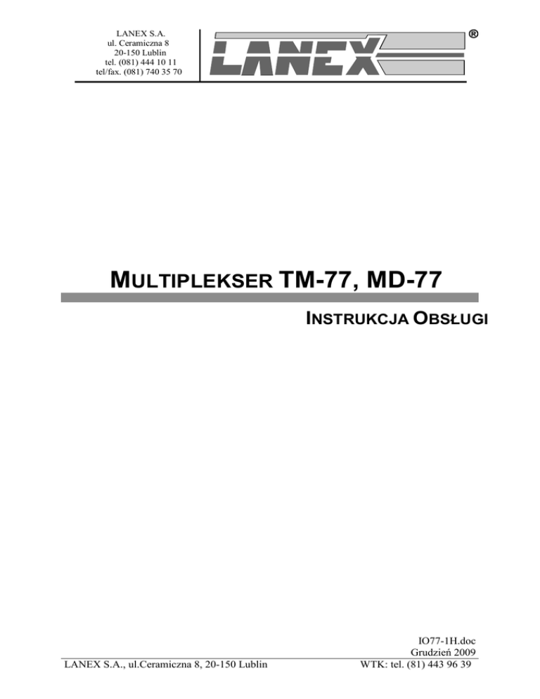 LANEX S.A. ul. Ceramiczna 8 20-150 Lublin tel. (081) 444 10 11 tel/fax. (081) 740 35 70 MULTIPLEKSER TM-77, MD-77 INSTRUKCJA OBSŁUGI LANEX S.A., ul.Ceramiczna 8, 20-150 Lublin IO77-1H.doc Grudzień 2009 WTK: tel. (81) 443 96 39 PLEZJOCHRONICZNY MULTIPLEKSER 4XE1/G.703 INSTRUKCJA OBSŁUGI Spis treści 1 OGÓLNA CHARAKTERYSTYKA ...................................................................................1 1.1 1.2 1.3 1.4 2 ZŁĄCZA I WSKAŹNIKI SYGNALIZACYJNE...............................................................5 2.1 2.2 2.3 3 WSTĘP ..............................................................................................................................5 MULTIPLEKSER TM-77 ....................................................................................................5 MULTIPLEKSER MD-77 (KARTA) .....................................................................................7 OPIS FUNKCJONALNY .....................................................................................................8 3.1 3.2 3.3 3.4 3.5 3.6 3.7 4 PRZEZNACZENIE ...............................................................................................................1 PODSTAWOWE CECHY URZĄDZENIA .................................................................................1 PRZYKŁADY ZASTOSOWAŃ...............................................................................................2 OZNACZANIE I WYKONANIE..............................................................................................3 UKŁADY DIAGNOSTYCZNE I SYGNALIZACYJNE .................................................................8 KANAŁY DODATKOWE......................................................................................................9 PĘTLE TESTOWE .............................................................................................................10 PRZENOSZENIE ZEGARA..................................................................................................10 DZIENNIK ZDARZEŃ........................................................................................................11 MONITOROWANE PARAMETRY JAKOŚCIOWE INTERFEJSU E1 G.703 ...............................12 MONITOROWANE PARAMETRY JAKOŚCIOWE INTERFEJSU OPTYCZNEGO E2 ....................13 INSTALACJA I OBSŁUGA ..............................................................................................14 4.1 WARUNKI PRACY ...........................................................................................................14 4.2 INSTALACJA ...................................................................................................................14 4.3 ZASILANIE ......................................................................................................................15 4.4 PODŁĄCZENIE SYGNAŁU LINIOWEGO E1/G.703..............................................................16 4.4.1 TM-77 i MD-77 .....................................................................................................16 4.5 POŁĄCZENIE Z TERMINALEM VT100 LUB KOMPUTEREM WYPOSAŻONYM W OPROGRAMOWANIE ZARZĄDZAJĄCE LANWIN.............................................................................17 4.6 DOŁĄCZANIE LINII ŚWIATŁOWODOWEJ ...........................................................................18 5 WSPÓŁPRACA Z TERMINALEM VT100.....................................................................20 5.1 PRZEZNACZENIE .............................................................................................................20 5.2 WYMAGANIA SPRZĘTOWE ..............................................................................................20 5.3 INSTALACJA I URUCHOMIENIE ........................................................................................21 5.4 ROZPOCZĘCIE PRACY Z TERMINALEM .............................................................................21 5.5 MENU GŁÓWNE ..............................................................................................................23 5.5.1 System....................................................................................................................24 5.5.2 Interfejsy-wybór ....................................................................................................25 5.5.2.1 Interfejsy-opcje..................................................................................................26 5.5.2.2 Konfiguracja......................................................................................................26 5.5.2.3 Rejestry 15 minutowe i 24 godzinne.................................................................28 5.5.3 Okresy czasowe .....................................................................................................29 5.5.4 Dziennik zdarzeń ...................................................................................................30 5.5.5 Monitorowanie ......................................................................................................30 5.5.6 Pętle.......................................................................................................................31 6 KONFIGURACJA URZĄDZEŃ PRZY UŻYCIU PROGRAMU LANWIN ...............32 6.1 KONFIGURACJA GLOBALNA ............................................................................................32 IO77-1H.doc I Grudzień 2009 PLEZJOCHRONICZNY MULTIPLEKSER 4XE1/G.703 INSTRUKCJA OBSŁUGI 6.1.1 Nazwa urządzenia .................................................................................................33 6.1.2 Ustawianie daty i czasu.........................................................................................33 6.1.3 Informacje dodatkowe ...........................................................................................33 6.2 AKTYWNOŚĆ KANAŁÓW .................................................................................................34 6.3 STAT