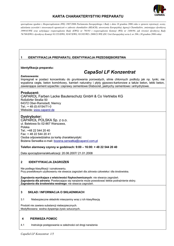 KARTA CHARAKTERYSTYKI PREPARATU sporządzona zgodnie z Rozporządzeniem (WE) 1907/2006 Parlamentu Europejskiego i Rady z dnia 18 grudnia 2006 roku w sprawie rejestracji, oceny, udzielania zezwoleń i stosowanych ograniczeń w zakresie chemikaliów (REACH), utworzenia Europejskiej Agencji Chemikaliów, zmieniające dyrektywę 1999/45/WE oraz uchylające rozporządzenie Rady (EWG) nr 793/93 i rozporządzenie Komisji (WE) nr 1488/94, jak również dyrektywę Rady 76/769/EWG i dyrektywy Komisji 91/155/EWG, 93/67/EWG, 93/105/WE i 2000/21/WE (DU Unii Europejskiej seria L nr 396 z 30 grudnia 2006 roku) 1 IDENTYFIKACJA PREPARATU, IDENTYFIKACJA PRZEDSIĘBIORSTWA Identyfikacja preparatu: CapaSol LF Konzentrat Zastosowanie: Impregnat w postaci koncentratu do gruntowania porowatych, silnie chłonnych podłoży jak np. tynki, nie wypalona cegła, beton komórkowy, kamień naturalny i płyty gipsowo-kartonowe a także beton, lekki beton, zawierające cement szpachle i zaprawy cementowe Disbocret, jastrychy cementowe i anhydrytowe. Producent: CAPAROL Farben Lacke Bautenschutz GmbH & Co Vertriebs KG Roßdörfer Straße 50 64372 Ober-Ramstadt, Niemcy Tel.: + 48 (0) 6154/71-0 Webside: www.caparol.de Dystrybutor: CAPAROL POLSKA Sp. z o.o. ul. Baletowa 5c 02-867 Warszawa, Polska Tel.: +48 22 544 20 40 Fax: + 48 22 544 20 41 Osoba odpowiedzialna za kartę charakterystyki: Bożena Serwatka e-mail: [email protected] Telefon alarmowy czynny w godzinach: 9:00 – 16:00: + 48 22 544 20 40 Data sporządzenia/aktualizacji: 20.06.2007/ 21.01.2008 2 IDENTYFIKACJA ZAGROŻEŃ Nie podlega klasyfikacji i oznakowaniu. Przy prawidłowym użytkowaniu nie stwarza zagrożeń dla zdrowia człowieka i dla środowiska. Zagrożenia wynikające z właściwości fizykochemicznych: nie stwarza zagrożeń. Zagrożenia dla zdrowia: Powtarzające się narażenie może powodować lekkie podrażnienie skóry. Zagrożenia dla środowiska wodnego: nie stwarza zagrożeń. 3 3.1 SKŁAD / INFORMACJA O SKŁADNIKACH Niebezpieczne składniki mieszaniny wraz z ich klasyfikacją Produkt nie zawiera substancji niebezpiecznych. Modyfikowana wodna dyspersja żywic sztucznych. 4 4.1 PIERWSZA POMOC Instrukcje postępowania w zależności od drogi narażenia CapaSol LF Konzentrat 1/5 KARTA CHARAKTERYSTYKI PREPARATU sporządzona zgodnie z Rozporządzeniem (WE) 1907/2006 Parlamentu Europejskiego i Rady z dnia 18 grudnia 2006 roku w sprawie rejestracji, oceny, udzielania zezwoleń i stosowanych ograniczeń w zakresie chemikaliów (REACH), utworzenia Europejskiej Agencji Chemikaliów, zmieniające dyrektywę 1999/45/WE oraz uchylające rozporządzenie Rady (EWG) nr 793/93 i rozporządzenie Komisji (WE) nr 1488/94, jak również dyrektywę Rady 76/769/EWG i dyrektywy Komisji 91/155/EWG, 93/67/EWG, 93/105/WE i 2000/21/WE (DU Unii Europejskiej seria L nr 396 z 30 grudnia 2006 roku) Wdychanie: Kontakt z oczami: Kontakt ze skórą: Połknięcie: Ogólne zalecenia: Wskazówki dla lekarza: 5 5.1 5.2 5.3 5.4 6 6.1 6.2 6.3 7 7.1 7.2 8 8.1 Wynieść poszkodowanego z miejsca narażenia, ułożyć w wygodnej pozycji półleżącej lub siedzącej, zapewnić spokój, chronić przed utratą ciepła. Jeżeli wystąpią zaburzenia oddychania, podawać tlen do oddychania. Jeżeli objawy nie ustępują, wezwać lekarza. Natychmiast płukać dużą ilością letniej wody, najlepiej bieżącej, przez co najmniej 15 min. Usunąć szkła kontaktowe. Unikać silnego strumienia wody ze względu na ryzyko mechanicznego uszkodzenia rogówki. Jeżeli podrażnienie nie ustępuje, należy skonsultować się z lekarzem-okulistą. Obficie zmywać letnią, bieżącą wodą. Zdjąć zanieczyszczoną odzież. Jeśli podrażnienie nie ustępuje, zasięgnąć porady lekarza. Jeżeli nastąpi połknięcie, nie powodować wymiotów. Jeżeli poszkodowany jest przytomny podać do wypicia dużą ilość wody. Skonsultować się z lekarzem. Powinny być przestrzegane zwykłe środki ostrożności jak przy pracy z chemikaliami. Jeżeli wystąpią jakiekolwiek niepokojące objawy, wezwać lekarza. Stosować leczenie objawowe POSTĘPOWANIE W PRZYPADKU POŻARU Zalecane środki gaśnicze Piana odporna na działanie alkoholu, dwutlenek węgla, proszki gaśnicze, woda – prądy rozproszone. Pojemniki nie objęte pożarem, narażone na działanie ognia, chłodzić rozproszonym strumieniem wody. Zabronione środki gaśnicze Zwarty strumień wody. Niebezpieczne produkty rozkładu W czasie pożaru mogą powstawać tlenki węgla (CO i CO2). Specjalistyczny sprzęt przeciwpożarowy Zakładać gazoszczelną odzież ochronną i aparaty oddechowe niezależne od powietrza z otoczenia. Zbiorniki narażone na działanie ognia chłodzić wodą z bezpiecznej odległości. Wodę gaśniczą zbierać osobno, nie wylewać do kanalizacji. POSTĘPOWANIE W PRZYPADKU NIEZAMIERZONEGO UWOLNIENIA DO ŚRODOWISKA Zagrożenia dla zdrowia i środki ochrony ludzi Środki ostrożności: Zlikwidować wyciek – zamknąć dopływ cieczy, uszczelnić, uszkodzone opakowanie umieścić w opakowaniu zastępczym. Zapewnić odpowiednią wentylację. Nakładać odzież ochronną i rękawice. Nie wdychać oparów. Zagrożenia dla środowiska i środki ochrony środowiska Zabezpieczyć przed wprowadzeniem do miejskiego systemu wodno-kanalizacyjnego i cieków wodnych. Metody unieszkodliwiania, zbierania i oczyszczania środowiska Rozlany produkt zaabsorbować w chemicznie obojętny materiał wiążący (piasek, ziemia okrzemkowa), przenieść do szczelnie zamykanych pojemników. Przekazać do utylizacji. Zanieczyszczoną powierzchnię spłukać dużą ilością wody. POSTĘPOWANIE Z PREPARATEM I JEGO MAGAZYNOWANIE Postępowanie z preparatem - środki ostrożności Stosować tylko w dobrze wentylowanych pomieszczeniach. Wskazane jest podejmowanie środków ostrożności, aby podczas pracy z produktem unikać kontaktu ze skórą i oczami. Wprowadzić zakaz jedzenia, picia i palenia. Myć ręce podczas przerw i po zakończonej pracy. Zanieczyszczone 