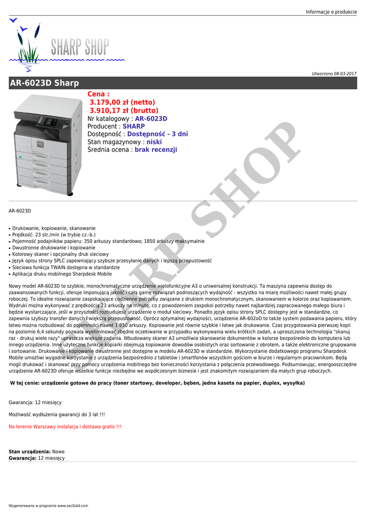Informacje o produkcie Utworzono 08-03-2017 AR-6023D Sharp SH O Nr katalogowy : AR-6023D Producent : SHARP Dostępność : Dostępność - 3 dni Stan magazynowy : niski Średnia ocena : brak recenzji P Cena : 3.179,00 zł (netto) 3.910,17 zł (brutto) AR-6023D ● ● ● ● ● ● AR ● Drukowanie, kopiowanie, skanowanie Prędkość: 23 str./min (w trybie cz.-b.) Pojemność podajników papieru: 350 arkuszy standardowo; 1850 arkuszy maksymalnie Dwustronne drukowanie i kopiowanie Kolorowy skaner i opcjonalny druk sieciowy Język opisu strony SPLC zapewniający szybsze przesyłanie danych i lepszą przepustowość Sieciowa funkcja TWAIN dostępna w standardzie Aplikacja druku mobilnego Sharpdesk Mobile P ● SH Nowy model AR-6023D to szybkie, monochromatyczne urządzenie wielofunkcyjne A3 o uniwersalnej konstrukcji. Ta maszyna zapewnia dostęp do zaawansowanych funkcji, oferuje imponującą jakość i całą gamę rozwiązań podnoszących wydajność - wszystko na miarę możliwości nawet małej grupy roboczej. To idealne rozwiązanie zaspokajające codzienne potrzeby związane z drukiem monochromatycznym, skanowaniem w kolorze oraz kopiowaniem. Wydruki można wykonywać z prędkością 23 arkuszy na minutę, co z powodzeniem zaspokoi potrzeby nawet najbardziej zapracowanego małego biura i będzie wystarczające, jeśli w przyszłości rozbudujesz urządzenie o moduł sieciowy. Ponadto język opisu strony SPLC dostępny jest w standardzie, co zapewnia szybszy transfer danych i większą przepustowość. Oprócz optymalnej wydajności, urządzenie AR-602oD to także system podawania papieru, który łatwo można rozbudować do pojemności nawet 1 850 arkuszy. Kopiowanie jest równie szybkie i łatwe jak drukowanie. Czas przygotowania pierwszej kopii na poziomie 6,4 sekundy pozwala wyeliminować zbędne oczekiwanie w przypadku wykonywania wielu krótkich zadań, a uproszczona technologia "skanuj raz - drukuj wiele razy" upraszcza większe zadania. Wbudowany skaner A3 umożliwia skanowanie dokumentów w kolorze bezpośrednio do komputera lub innego urządzenia. Inne użyteczne funkcje kopiarki obejmują kopiowanie dowodów osobistych oraz sortowanie z obrotem, a także elektroniczne grupowanie i sortowanie. Drukowanie i kopiowanie dwustronne jest dostępne w modelu AR-6023D w standardzie. Wykorzystanie dodatkowego programu Sharpdesk Mobile umożliwi wygodne korzystanie z urządzenia bezpośrednio z tabletów i smartfonów wszystkim gościom w biurze i regularnym pracownikom. Będą mogli drukować i skanować przy pomocy urządzenia mobilnego bez konieczności korzystania z połączenia przewodowego. Podsumowując, energooszczędne urządzenie AR-6023D oferuje wszelkie funkcje niezbędne we współczesnym biznesie i jest znakomitym rozwiązaniem dla małych grup roboczych. W tej cenie: urządzenie gotowe do pracy (toner startowy, developer, bęben, jedna kaseta na papier, duplex, wysyłka) Gwarancja: 12 miesięcy Możliwość wydłużenia gwarancji do 3 lat !!! Na terenie Warszawy instalacja i dostawa gratis !!! Stan urządzenia: Nowe Gwarancja: 12 miesięcy Wygenerowano w programie www.oscGold.com
