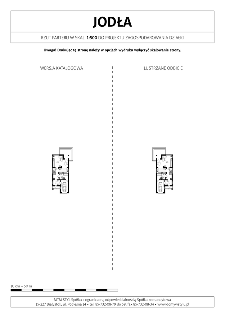 JODŁA RZUT PARTERU W SKALI 1:500 DO PROJEKTU ZAGOSPODAROWANIA DZIAŁKI Uwaga! Drukując tę stronę należy w opcjach wydruku wyłączyć skalowanie strony. WERSJA KATALOGOWA LUSTRZANE ODBICIE 10 cm = 50 m MTM STYL Spółka z ograniczoną odpowiedzialnością Spółka komandytowa 15-227 Białystok, ul. Podleśna 14 • tel. 85-732-08-79 do 59, fax 85-732-08-34 • www.domywstylu.pl