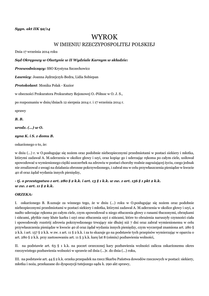 Sygn. akt IIK 92/14 WYROK W IMIENIU RZECZYPOSPOLITEJ POLSKIEJ Dnia 17 września 2014 roku Sąd Okręgowy w Olsztynie w II Wydziale Karnym w składzie: Przewodniczący: SSO Krystyna Szczechowicz Ławnicy: Joanna Jędrzejczyk-Bedra, Lidia Sobiepan Protokolant: Monika Polak - Kuzior w obecności Prokuratora Prokuratury Rejonowej O.-Północ w O. J. S., po rozpoznaniu w dniu/dniach 12 sierpnia 2014 r. i 17 września 2014 r. sprawy B. B. urodz. (...) w O. syna K. i S. z domu B. oskarżonego o to, że: w dniu (...) r. w O.posługując się nożem oraz podobnie niebezpiecznymi przedmiotami w postaci siekiery i młotka, którymi zadawał A. M.uderzenia w okolice głowy i szyi, oraz kopiąc go i uderzając rękoma po całym ciele, usiłował spowodować u wymienionego ciężki uszczerbek na zdrowiu w postaci choroby realnie zagrażającej życiu, czego jednak nie zrealizował z uwagi na działania obronne pokrzywdzonego, i zabrał mu w celu przywłaszczenia pieniądze w kwocie 40 zł oraz żądał wydania innych pieniędzy, - tj. o przestępstwo z art. 280 § 2 k.k. i art. 13 § 1 k.k. w zw. z art. 156 § 1 pkt 2 k.k. w zw. z art. 11 § 2 k.k. ORZEKA: I. oskarżonego B. B.uznaje za winnego tego, że w dniu (...) roku w O.posługując się nożem oraz podobnie niebezpiecznymi przedmiotami w postaci siekiery i młotka, którymi zadawał A. M.uderzenia w okolice głowy i szyi, a nadto uderzając rękoma po całym ciele, czym spowodował u niego stłuczenia głowy z ranami tłuczonymi, obrzękami i sińcami, płytkie rany kłute karku i szyi oraz stłuczenia szyi z sińcami, które to obrażenia naruszyły czynności ciała i spowodowały rozstrój zdrowia pokrzywdzonego trwający nie dłużej niż 7 dni oraz zabrał wymienionemu w celu przywłaszczenia pieniądze w kwocie 40 zł oraz żądał wydania innych pieniędzy, czym wyczerpał znamiona art. 280 § 2 k.k. i art. 157 § 2 k.k. w zw. z art. 11 § 2 k.k. i za to skazuje go na podstawie tych przepisów wymierzając w oparciu o art. 280 § 2 k.k. przy zastosowaniu art. 11 § 3 k.k. karę lat 8 (ośmiu) pozbawienia wolności, II. na podstawie art. 63 § 1 k.k. na poczet orzeczonej kary pozbawienia wolności zalicza oskarżonemu okres rzeczywistego pozbawienia wolności w sprawie od dnia (...)r. do dnia (...) roku, III. na podstawie art. 44 § 2 k.k. orzeka przepadek na rzecz Skarbu Państwa dowodów rzeczowych w postaci: siekiery, młotka i noża, przekazane do dyspozycji tutejszego sądu k. 290 akt sprawy, IV. na podstawie art. 230 § 2 k.p.k. nakazuje zwrócić oskarżonemu następujące dowody rzeczowe: kawałek trzonka młotka, kurtkę koloru brązowego typu kożuch, buty sznurowane koloru czarnego, koszulę rozpinaną - krótki rękaw, koszulę t-shirt koloru białego, koszulę t-shirt koloru granatowego, spodnie koloru granatowego, kalesony koloru czarnego przekazane do dyspozycji tutejszego sądu k. 290 akt sprawy, V. zasądza od Skarbu Państwa na rzecz adw. R. A. kwotę 720 (siedemset dwadzieścia) zł powiększone o należny podatek VAT w stawce 23 %, tytułem wynagrodzenia za obronę oskarżonego wykonywaną z urzędu w postępowaniu sądowym, VI. na podstawie art. 624 § 1 k.p.k. zwalnia oskarżonego od zapłaty na rzecz Skarbu Państwa kosztów sądowych. Sygn. akt II K 92/14 UZASADNIENIE Oskarżony B. B.ma obecnie (...)lat, jest (...), zamieszkuje sam przy ul. (...)w O.. Posiada wykształcenie (...), nie ma wyuczonego zawodu. Wymieniony przed zatrzymaniem nie pracował, utrzymywał się z zasiłku otrzymywanego z MOPS w wysokości 270 zł oraz z pieniędzy uzyskiwanych ze sprzedaży zbieranego złomu. B. B.jest uzależniony od alkoholu. Przed zatrzymaniem i osadzeniem często spędzał czas na spożywaniu wspólnie z kolegami alkoholu w mieszkaniu. (dowód: wywiad kuratora k. 230-231, dane osobopoznawcze k. 272) Pokrzywdzony A. M., zamieszkuje u (...)w miejscowości Z.przy ul. (...). Przed dniem inkryminowanego zdarzenia pracował dorywczo w budownictwie w W.. W dniu (...)roku jadąc do matki do miejscowości Z., około godz. (...)dotarł do O., gdzie miał mieć przesiadkę. Na dworcu PKP-PKS zaczął spożywać alkohol w postaci piwa, które kupił w sklepie (...)położonym nieopodal dworca. Całą noc spędził na dworcu pijąc alkohol. W dniu (...)roku około godz. (...)na dworcu PKS podszedł do niego oskarżony prosząc o pieniądze na alkohol. Pokrzywdzony dał mu 2 zł. B. B.udał się do sklepu, gdzie kupił piwo, po czym wrócił do pokrzywdzonego i wypił je przy nim. Następnie zaproponował pokrzywdzonemu, że mogą pójść do jego mieszkania i tam dalej spożywać alkohol. A. M.przystał na złożoną propozycję. Po drodze wymienieni udali się do sklepu (...)przy ul. (...), gdzie pokrzywdzony kupił jedną butelkę wódki cytrynowej oraz 6 piw w butelkach 0,5 litra marki C. (...)lub T.. Następnie wymienieni udali się do mieszkania B. B.znajdującego się przy ul. (...)w O.. W mieszkaniu spożyli zakupiony przez A. M.alkohol. Po czym, pokrzywdzony siedząc na fotelu, zasnął. Około godz. (...) rano dnia (...)roku obudził się i poczuł jak oskarżony przeszukuje jego kieszenie. Spostrzegł, iż oskarżony trzyma w ręku pieniądze w kwocie 40 zł (w banknotach 1 × 20 zł, i 2 × 10 zł), które wyciągnął z przedniej kieszeni jeansów pokrzywdzonego. A. M.krzyknął do niego aby ten mu je oddał i próbował odebrać mu pieniądze. Wtedy oskarżony wziął leżący na podłodze koło lóżka młotek i zaczął pokrzywdzonego nim uderzać po głowie. Uderzył go co najmniej 2 razy. Pokrzywdzony z powodu uderzeń w głowę poczuł się zamroczony i usiadł w fotelu. Następnie oskarżony wziął do ręki nóż i przykłożył jego ostrze do szyi pokrzywdzonego, raniąc go kilkukrotnie. Przykładając nóż oskarżony żądał wydania reszty posiadanych przez pokrzywdzonego pieniędzy. Oskarżony następnie wziął siekierę i obuchem zadał parę ciosów pokrzywdzonemu w górną cześć pleców oraz szyi. Uderza