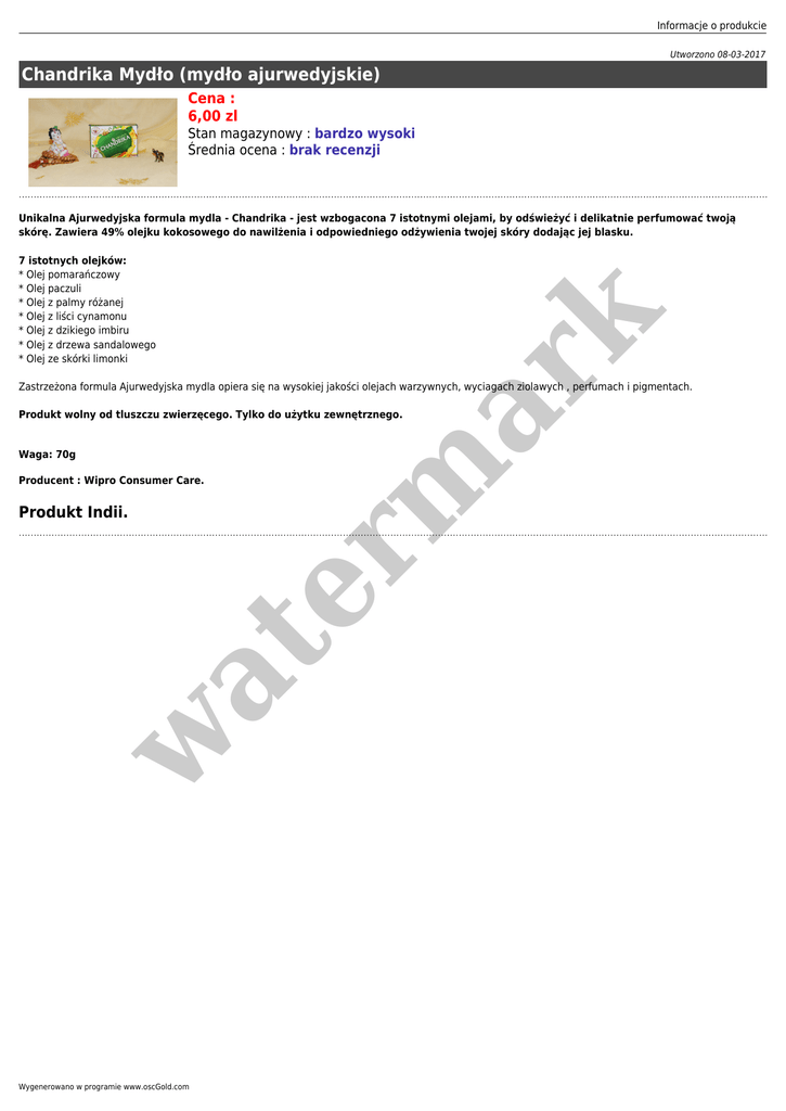 Informacje o produkcie Utworzono 08-03-2017 Chandrika Mydło (mydło ajurwedyjskie) Cena : 6,00 zl Stan magazynowy : bardzo wysoki Średnia ocena : brak recenzji 7 istotnych olejków: * Olej pomarańczowy * Olej paczuli * Olej z palmy różanej * Olej z liści cynamonu * Olej z dzikiego imbiru * Olej z drzewa sandalowego * Olej ze skórki limonki er m ar k Unikalna Ajurwedyjska formula mydla - Chandrika - jest wzbogacona 7 istotnymi olejami, by odświeżyć i delikatnie perfumować twoją skórę. Zawiera 49% olejku kokosowego do nawilżenia i odpowiedniego odżywienia twojej skóry dodając jej blasku. Zastrzeżona formula Ajurwedyjska mydla opiera się na wysokiej jakości olejach warzywnych, wyciagach ziolawych , perfumach i pigmentach. Produkt wolny od tluszczu zwierzęcego. Tylko do użytku zewnętrznego. Waga: 70g Producent : Wipro Consumer Care. w at Produkt Indii. Wygenerowano w programie www.oscGold.com