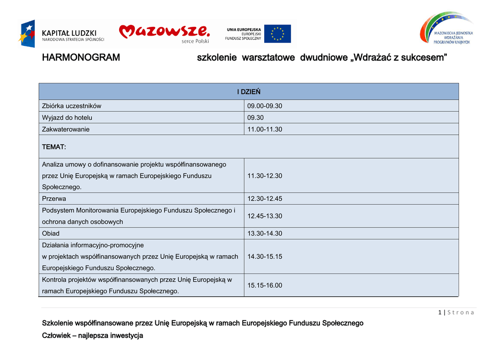 HARMONOGRAM szkolenie warsztatowe dwudniowe „Wdrażać z sukcesem” I DZIEŃ Zbiórka uczestników 09.00-09.30 Wyjazd do hotelu 09.30 Zakwaterowanie 11.00-11.30 TEMAT: Analiza umowy o dofinansowanie projektu współfinansowanego przez Unię Europejską w ramach Europejskiego Funduszu 11.30-12.30 Społecznego. Przerwa Podsystem Monitorowania Europejskiego Funduszu Społecznego i ochrona danych osobowych Obiad 12.30-12.45 12.45-13.30 13.30-14.30 Działania informacyjno-promocyjne w projektach współfinansowanych przez Unię Europejską w ramach 14.30-15.15 Europejskiego Funduszu Społecznego. Kontrola projektów współfinansowanych przez Unię Europejską w ramach Europejskiego Funduszu Społecznego. 15.15-16.00 1|Strona Szkolenie współfinansowane przez Unię Europejską w ramach Europejskiego Funduszu Społecznego Człowiek – najlepsza inwestycja Przerwa 16.00-16.15 Kwalifikowalność wydatków w trakcie realizacji projektu współfinansowanego przez Unię Europejską w ramach 16.15-17.15 Europejskiego Funduszu Społecznego. Indywidualne konsultacje 17.30-18.30 Kolacja 18.30-19.30 Indywidualne konsultacje 19.30-21.00 II DZIEŃ Śniadanie 08.00-9.00 TEMAT: Wniosek beneficjenta o płatność – warsztaty cz. 1 9.00-10.00 Przerwa / wykwaterowanie 10.00-10.30 Wniosek beneficjenta o płatność – warsztaty cz. 2 10.30-12.45 Podsumowanie szkolenia i wręczenie zaświadczeń 12.45-13.00 Obiad 13.15-14.00 Wyjazd z hotelu do Warszawy 14.00 Przyjazd do Warszawy 16.00 2|Strona Szkolenie współfinansowane przez Unię Europejską w ramach Europejskiego Funduszu Społecznego Człowiek – najlepsza inwestycja