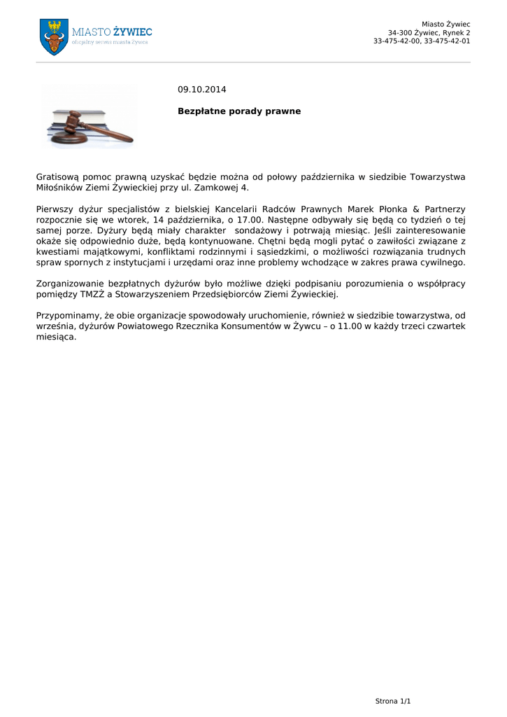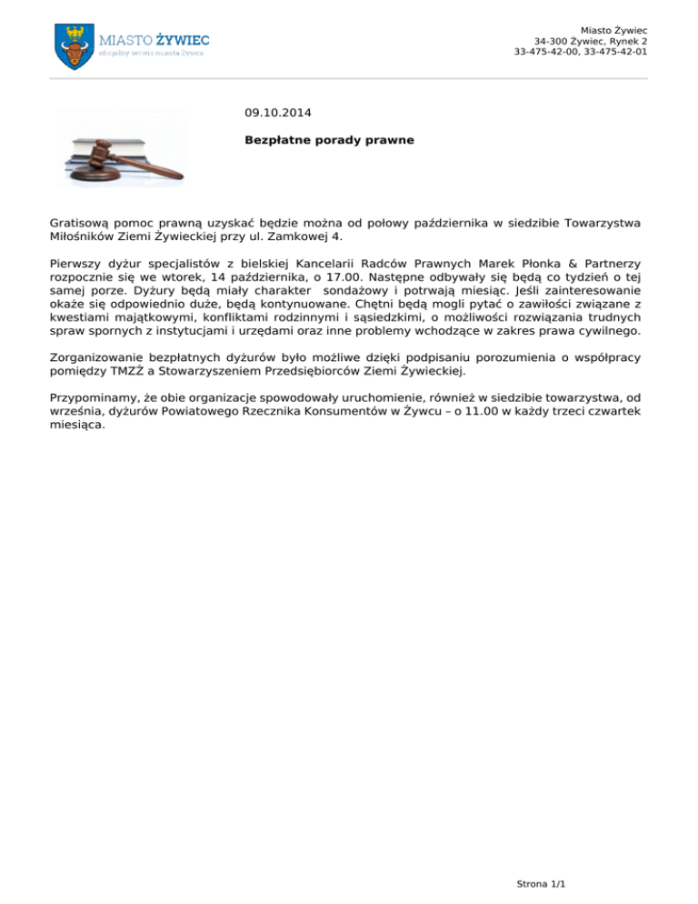 Miasto Żywiec 34-300 Żywiec, Rynek 2 33-475-42-00, 33-475-42-01 09.10.2014 Bezpłatne porady prawne Gratisową pomoc prawną uzyskać będzie można od połowy października w siedzibie Towarzystwa Miłośników Ziemi Żywieckiej przy ul. Zamkowej 4. Pierwszy dyżur specjalistów z bielskiej Kancelarii Radców Prawnych Marek Płonka & Partnerzy rozpocznie się we wtorek, 14 października, o 17.00. Następne odbywały się będą co tydzień o tej samej porze. Dyżury będą miały charakter sondażowy i potrwają miesiąc. Jeśli zainteresowanie okaże się odpowiednio duże, będą kontynuowane. Chętni będą mogli pytać o zawiłości związane z kwestiami majątkowymi, konfliktami rodzinnymi i sąsiedzkimi, o możliwości rozwiązania trudnych spraw spornych z instytucjami i urzędami oraz inne problemy wchodzące w zakres prawa cywilnego. Zorganizowanie bezpłatnych dyżurów było możliwe dzięki podpisaniu porozumienia o współpracy pomiędzy TMZŻ a Stowarzyszeniem Przedsiębiorców Ziemi Żywieckiej. Przypominamy, że obie organizacje spowodowały uruchomienie, również w siedzibie towarzystwa, od września, dyżurów Powiatowego Rzecznika Konsumentów w Żywcu – o 11.00 w każdy trzeci czwartek miesiąca. Strona 1/1 Powered by TCPDF (www.tcpdf.org)