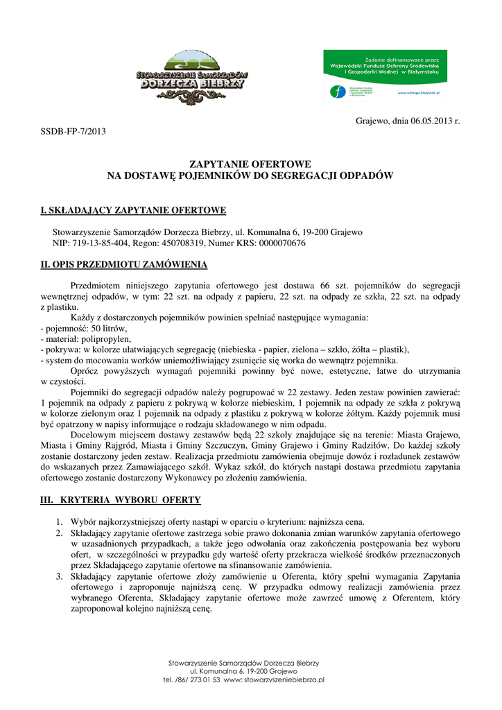 Grajewo, dnia 06.05.2013 r. SSDB-FP-7/2013 ZAPYTANIE OFERTOWE NA DOSTAWĘ POJEMNIKÓW DO SEGREGACJI ODPADÓW I. SKŁADAJĄCY ZAPYTANIE OFERTOWE Stowarzyszenie Samorządów Dorzecza Biebrzy, ul. Komunalna 6, 19-200 Grajewo NIP: 719-13-85-404, Regon: 450708319, Numer KRS: 0000070676 II. OPIS PRZEDMIOTU ZAMÓWIENIA Przedmiotem niniejszego zapytania ofertowego jest dostawa 66 szt. pojemników do segregacji wewnętrznej odpadów, w tym: 22 szt. na odpady z papieru, 22 szt. na odpady ze szkła, 22 szt. na odpady z plastiku. Każdy z dostarczonych pojemników powinien spełniać następujące wymagania: - pojemność: 50 litrów, - materiał: polipropylen, - pokrywa: w kolorze ułatwiających segregację (niebieska - papier, zielona – szkło, żółta – plastik), - system do mocowania worków uniemożliwiający zsunięcie się worka do wewnątrz pojemnika. Oprócz powyższych wymagań pojemniki powinny być nowe, estetyczne, łatwe do utrzymania w czystości. Pojemniki do segregacji odpadów należy pogrupować w 22 zestawy. Jeden zestaw powinien zawierać: 1 pojemnik na odpady z papieru z pokrywą w kolorze niebieskim, 1 pojemnik na odpady ze szkła z pokrywą w kolorze zielonym oraz 1 pojemnik na odpady z plastiku z pokrywą w kolorze żółtym. Każdy pojemnik musi być opatrzony w napisy informujące o rodzaju składowanego w nim odpadu. Docelowym miejscem dostawy zestawów będą 22 szkoły znajdujące się na terenie: Miasta Grajewo, Miasta i Gminy Rajgród, Miasta i Gminy Szczuczyn, Gminy Grajewo i Gminy Radziłów. Do każdej szkoły zostanie dostarczony jeden zestaw. Realizacja przedmiotu zamówienia obejmuje dowóz i rozładunek zestawów do wskazanych przez Zamawiającego szkół. Wykaz szkół, do których nastąpi dostawa przedmiotu zapytania ofertowego zostanie dostarczony Wykonawcy po złożeniu zamówienia. III. KRYTERIA WYBORU OFERTY 1. Wybór najkorzystniejszej oferty nastąpi w oparciu o kryterium: najniższa cena. 2. Składający zapytanie ofertowe zastrzega sobie prawo dokonania zmian warunków zapytania ofertowego w uzasadnionych przypadkach, a także jego odwołania oraz zakończenia postępowania bez wyboru ofert, w szczególności w przypadku gdy wartość oferty przekracza wielkość środków przeznaczonych przez Składającego zapytanie ofertowe na sfinansowanie zamówienia. 3. Składający zapytanie ofertowe złoży zamówienie u Oferenta, który spełni wymagania Zapytania ofertowego i zaproponuje najniższą cenę. W przypadku odmowy realizacji zamówienia przez wybranego Oferenta, Składający zapytanie ofertowe może zawrzeć umowę z Oferentem, który zaproponował kolejno najniższą cenę. Stowarzyszenie Samorządów Dorzecza Biebrzy ul. Komunalna 6, 19-200 Grajewo tel. /86/ 273 01 53 www: stowarzyszeniebiebrza.pl IV. SPOSÓB PRZYGOTOWANIA, MIEJSCE ORAZ TERMIN SKŁADANIA OFERTY. 1. 2. 3. 4. 5. 6. Ofertę należy złożyć na Formularzu ofertowym stanowiącym załącznik do Zapytania ofertowego. Nie dopuszcza się składania ofert częściowych oraz wariantowych. Ofertę można złożyć w siedzibie Stowarzyszenia Samorządów Dorzecza Biebrzy, ul. Komunalna 6, 19-200 Grajewo osobiście lub pocztą lub przesłać e-mailem na adres: [email protected]. Termin składania ofert upływa dnia 08.05.2013 r. o godz. 10.00. Termin wykonania zamówienia: 3 dni od jego udzielenia. Dodatkowych informacji udziela Karwowska Zofia, tel. 86 273 01 53. Przewodniczący Zarządu Stanisław Szleter Stowarzyszenie Samorządów Dorzecza Biebrzy ul. Komunalna 6, 19-200 Grajewo tel. /86/ 273 01 53 www: stowarzyszeniebiebrza.pl Załącznik do zapytania ofertowego .......................................... /miejscowość i data/ ................................................................................ (nazwa, adres oferenta) e-mail: …................................................................. Stowarzyszenie Samorządów Dorzecza Biebrzy ul. Komunalna 6, 19-200 Grajewo Formularz ofertowy na dostawę pojemników do segregacji odpadów W odpowiedzi na zapytanie ofertowe z dnia 6 maja 2013 r. (SSDB-FP-7/2013) przedstawiam/y następującą ofertę cenową: Lp. 1. Nazwa Pojemnik do segregacji odpadów J.m. Ilość szt. 66 Cena jedn. brutto Wartość brutto Cena całkowita brutto za wykonanie zamówienia wynosi: ...................................................................... słownie złotych: ….................................................................................................................................... 1. Oświadczam/y, że podane ceny uwzględniają wszelkie koszty związane z wykonaniem zamówienia wraz z kosztami dostawy. 2. Oświadczam/y, że zapoznałem/iśmy się z treścią zapytania ofertowego i nie wnoszę/imy do niego zastrzeżeń oraz przyjmuję/emy warunki w nim zawarte. 3. W przypadku udzielenia mi/nam zamówienia, zobowiązuję/my się do jego realizacji w terminie 3 dni. 4. Oświadczam, że posiadam odpowiedni potencjał finansowy, ludzki, sprzętowy i produkcyjny aby zrealizować zamówienie w terminie oraz zgodnie z opisem w zapytaniu ofertowym. 5. Załączam/my: - fotografię obrazującą wygląd pojemnika do segregacji odpadów, którego cena została przedstawiona w niniejszym formularzu ofertowym. …………………………………… /podpis upełnomocnionego(ych) przedstawiciela(i) Wykonawcy/ Stowarzyszenie Samorządów Dorzecza Biebrzy ul. Komunalna 6, 19-200 Grajewo tel. /86/ 273 01 53 www: stowarzyszeniebiebrza.pl