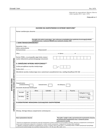 Załączniki do rozporządzenia Ministra Zdrowia z dnia 6 grudnia 2013 r. (poz. 1678) Załącznik nr 1 ra Zdrowia część A ZLECENIE NA ZAOPATRZENIE W WYROBY MEDYCZNE* Numer ewidencyjny zlecenia: ………………………………………………………………………………………………………………………………………. _____________________________________________________________________________________ Pieczątka lub nadruk zawierające dane adresowe przedsiębiorstwa podmiotu leczniczego/praktyki zawodowej wraz z numerem REGON oraz numerem umowy z NFZ I. DANE ŚWIADCZENIOBIORCY WYPEŁNIA OSOBA UPRAWNIONA DO WYSTAWIENIA ZLECENIA LUB KONTYNUACJI ZAOPATRZENIA Nazwisko i imię: ……………………………………………………………………………………………………………………………………………………………… Adres zamieszkania Kod pocztowy: …………………………. Miejscowość: …………………………………………………………………………………………………………….. Ulica ……………………………………………………………………………………….. nr domu ………………………..m. ……………………………………….. Numer PESEL, a w przypadku jego braku nazwa i numer dokumentu potwierdzającego tożsamość: II. OKREŚLENIE WYROBU MEDYCZNEGO** Liczba porządkowa wyrobu medycznego / liczba sztuk ……………… Określenie wyrobu medycznego wraz z pisemnym uzasadnieniem (np. według klasyfikacji ICD‐10): ……………………………... …………………………………………………………………………………………………………………………………………………………………………………………. …………………………………………………………………………………………………………………………………………………………………………………………. ……………………………………………………………………………………………………………………………………………………………………………………....... Zaopatrzenie: prawostronne lewostronne nie dotyczy Soczewki okularowe korekcyjne Do dali Do bliży OP OL OP OL Sfera Cylinder Oś Pryzma Odległość źrenic …………………. mm Odległość źrenic ………………… mm III.DODATKOWE WSKAZANIA ZLECAJĄCEGO ZAOPATRZENIE: ………………………………………………................................. ………………………………………………………………………………………………………………………………………………………………………………………… …………………………………………………………………………………………………………………………………………………………………………………………. Miesiąc, którego dotyczy zaopatrzenie comiesięczne: ……………………………………………………………………………………………………… _______________________ ____________________________________________________ Data wystawienia zlecenia Pieczątka i podpis osoby uprawnionej do wystawienia zlecenia lub kontynuacji zaopatrzenia wraz z numerem prawa wykonywania zawodu * Zlecenie na zaopatrzenie comiesięczne może być wystawione na okres nie dłuższy niż trzy kolejne miesiące. Zlecenie na zaopatrzenie comiesięczne może zostać zrealizowane wyłącznie w miesiącach, na które zostało wystawione, z wyłączeniem miesięcy, które upłynęły. ** Zgodnie z przepisami wydanymi na podstawie art. 38 ust. 4 ustawy z dnia 12 maja 2011 r. o refundacji leków, środków spożywczych specjalnego przeznaczenia żywieniowego oraz wyrobów medycznych (Dz. U. Nr 122, poz. 696, z późn. zm.). WYPEŁNIA PRACOWNIK ODDZIAŁU WOJEWÓDZKIEGO NARODOWEGO FUNDUSZU ZDROWIA IV. POTWIERDZENIE UPRAWNIENIA DO ZAOPATRZENIA WNIOSKOWANYM WYROBEM MEDYCZNYM Kod tytułu uprawnienia ………………………….…………………………………………………………………………………………………………………….. Kod tytułu uprawnienia dodatkowego .…………………………………………………………. nr dokumentu …………………………………….. Nazwa i numer oddziału wojewódzkiego Narodowego Funduszu Zdrowia: …………………………………………………………………… Limit finansowania ze środków publicznych ………..……….. Refundacja Narodowego Funduszu Zdrowia …………………….% Przyczyna odmowy potwierdzenia prawa do refundacji ………………………………………………………………………………………………… ………………………………………………………………………………………………………………………………………………………………………………………. Data potwierdzenia zlecenia ………………………………………………………………………………………………………………………………………….. _________________________________________________ Pieczątka i podpis pracownika oddziału wojewódzkiego Narodowego Funduszu Zdrowia WYPEŁNIA PODMIOT REALIZUJĄCY CZYNNOŚCI Z ZAKRESU ZAOPATRZENIA W WYROBY MEDYCZNE V. POTWIERDZENIE ODBIORU WYROBU MEDYCZNEGO U ŚWIADCZENIODAWCY ________________________ _______________________________________________ Data przyjęcia do realizacji Pieczątka podmiotu realizującego czynności z zakresu zaopatrzenia w wyroby medyczne, w tym adres miejsca udzielania świadczeń wraz z numerem umowy z NFZ Liczba sztuk ………………………… Dane dotyczące wyrobu medycznego (wytwórca, model, nazwa handlowa) ……