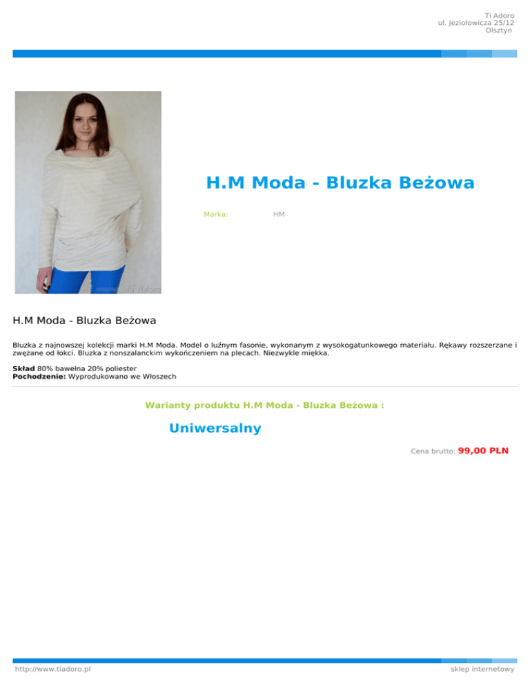 Ti Adoro ul. Jeziołowicza 25/12 Olsztyn H.M Moda - Bluzka Beżowa Marka: HM H.M Moda - Bluzka Beżowa Bluzka z najnowszej kolekcji marki H.M Moda. Model o luźnym fasonie, wykonanym z wysokogatunkowego materiału. Rękawy rozszerzane i zwężane od łokci. Bluzka z nonszalanckim wykończeniem na plecach. Niezwykle miękka. Skład 80% bawełna 20% poliester Pochodzenie: Wyprodukowano we Włoszech Warianty produktu H.M Moda - Bluzka Beżowa : Uniwersalny Cena brutto: http://www.tiadoro.pl 99,00 PLN sklep internetowy