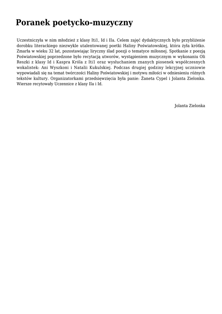 Poranek poetycko-muzyczny Uczestniczyła w nim młodzież z klasy Iti1, Id i IIa. Celem zajęć dydaktycznych było przybliżenie dorobku literackiego niezwykle utalentowanej poetki Haliny Poświatowskiej, która żyła krótko. Zmarła w wieku 32 lat, pozostawiając liryczny ślad poezji o tematyce miłosnej. Spotkanie z poezją Poświatowskiej poprzedzone było recytacją utworów, wystąpieniem muzycznym w wykonaniu Oli Reszki z klasy Id i Kaspra Króla z Iti1 oraz wysłuchaniem znanych piosenek współczesnych wokalistek: Ani Wyszkoni i Natalii Kukulskiej. Podczas drugiej godziny lekcyjnej uczniowie wypowiadali się na temat twórczości Haliny Poświatowskiej i motywu miłości w odniesieniu różnych tekstów kultury. Organizatorkami przedsięwzięcia była panie: Żaneta Cypel i Jolanta Zielonka. Wiersze recytowały Uczennice z klasy IIa i Id. Jolanta Zielonka