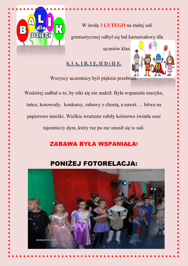 W środę 3 LUTEGO na małej sali gimnastycznej odbył się bal karnawałowy dla uczniów klas: 0, I A, I B, I E, II D i II E. Wszyscy uczestnicy byli pięknie przebrani. Wodzirej zadbał o to, by nikt się nie nudził. Była wspaniała muzyka, tańce, korowody, konkursy, zabawy z chustą, a nawet … bitwa na papierowe śnieżki. Wielkie wrażenie robiły kolorowe światła oraz tajemniczy dym, który raz po raz unosił się w sali. ZABAWA BYŁA WSPANIAŁA! PONIŻEJ FOTORELACJA: