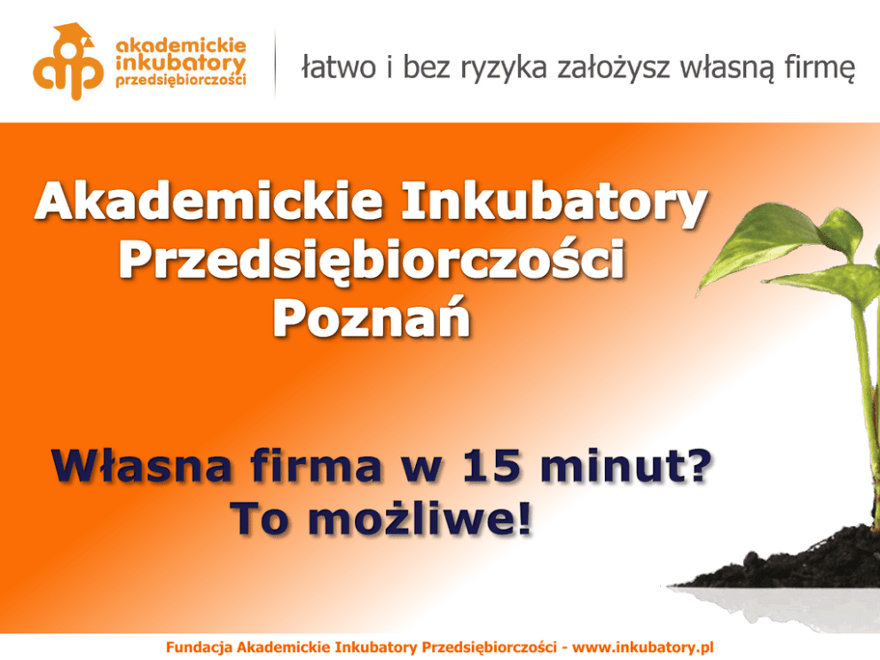 Fundacja Akademickie Inkubatory Przedsiębiorczości - www.inkubatory.pl O AIP Fundacja Akademickie Inkubatory Przedsiębiorczości to największe w Europie przedsięwzięcie, którego celem jest wspieranie młodych ludzi w dążeniu do założenia i prowadzenia własnego biznesu. Inkubator umożliwia w ciągu zaledwie 15 minut założyć swoją własną, wymarzoną firmę. Projekt skierowany jest do mieszkańców Polski do 30. roku życia - osób o największym potencjale wiedzy, kreatywności i innowacji, który odpowiednio zagospodarowany może stać się w przyszłości czynnikiem wpływającym na rozwój gospodarczy naszego kraju. Obecnie w ramach AIP działa ponad 1000 firm prowadzonych przez uczniów, studentów i absolwentów, dla których są to pierwsze kroki w biznesie. Fundacja Akademickie Inkubatory Przedsiębiorczości - www.inkubatory.pl Czym jest AIP? • Sieć 34 Akademickich Inkubatorów Przedsiębiorczości (w tym 2 biura w Poznaniu a docelowo ma być 5) • Ponad 1000 działających firm (w tym ponad 70 w Poznaniu) • Członek Krajowego Systemu Usług • Członek Krajowej Sieci Innowacji • Nominacja do Europejskiej Nagrody Przedsiębiorczości • AIP Poznań – najlepszy inkubator AIP w Polsce w 2008r. Fundacja Akademickie Inkubatory Przedsiębiorczości - www.inkubatory.pl Łatwo, szybko i bez ryzyka Działalność na zasadzie pionu w Inkubatorze, dzięki czemu osoba nie musi zakładać własnej działalności gospodarczej. – Korzystanie z osobowości prawnej Fundacji – Brak składek ZUS – Nie figurowanie w rejestrach jako prowadzący działalność Porady prawne, tworzenie i weryfikacja umów. Prowadzenie księgowości firmy przez biuro rachunkowe. Fundacja Akademickie Inkubatory Przedsiębiorczości - www.inkubatory.pl Łatwo, szybko i bez ryzyka Doradztwo w zakresie tworzenia i prowadzenia własnej firmy Organizacja bezpłatnych szkoleń dla Beneficjentów AIP Pozyskiwanie kontaktów dzięki współpracy z różnymi firmami, organizacja eventów typu BiznesMixer, organizacja spotkań networkingowych itp. Pomoc w pozyskiwaniu funduszy na inwestycje (AIP Seed Capital) Fundacja Akademickie Inkubatory Przedsiębiorczości - www.inkubatory.pl Łatwo, szybko i bez ryzyka Umowa – maksymalnie 24 miesiące, miesięczny okres wypowiedzenia Możliwość prowadzenia różnych (zbliżonych) działalności pod jednym pionem Jedyne zobowiązanie finansowe to opłata za pobyt w Inkubatorze 250 PLN (netto) + 50 PLN za każdego wspólnika miesięcznie (netto) Fundacja Akademickie Inkubatory Przedsiębiorczości - www.inkubatory.pl Dlaczego powinieneś założyć firmę w AIP? W AIP własną firmę założysz łatwo i bez ryzyka. Działając pod naszą osobowością prawną oszczędzisz czas i przede wszystkim pieniądze. Firmę założysz w jeden dzień, unikniesz płacenia składek ZUS, a otrzymana kompleksowa obsługa księgowa oraz prawna zapewni Ci bezpieczeństwo prowadzenia interesów. Dodatkowo otrzymasz doradztwo w zakresie związanym z biznesem, a Twoja firma będzie promowana w lokalnych mediach współpracującymi z AIP. Prowadząc firmę w AIP otrzymasz również dostęp do wartościowych szkoleń, w szczególności dotyczących tzw. soft-skills (umiejętności miękkich), a przede wszystkim staniesz się członkiem ogromnej społeczności zrzeszającej młodych przedsiębiorców. Fundacja Akademickie Inkubatory Przedsiębiorczości - www.inkubatory.pl Kontakt Akademickie Inkubatory Przedsiębiorczości Poznań Wyższa Szkoła Komunikacji i Zarządzania Stary Rynek 87/88, 61-773 Poznań tel. (061) 852 42 52 wew. 225 Uniwersytet Ekonomiczny w Poznaniu ul. Powstańców Wielkopolskich 16, 61-895 Poznań tel. (061) 854 30 62 www.aip.org.pl Dyrektor AIP Poznań- Marta Pastuszka tel: +48 515 061 876 e-mail: [email protected] Fundacja Akademickie Inkubatory Przedsiębiorczości - www.inkubatory.pl