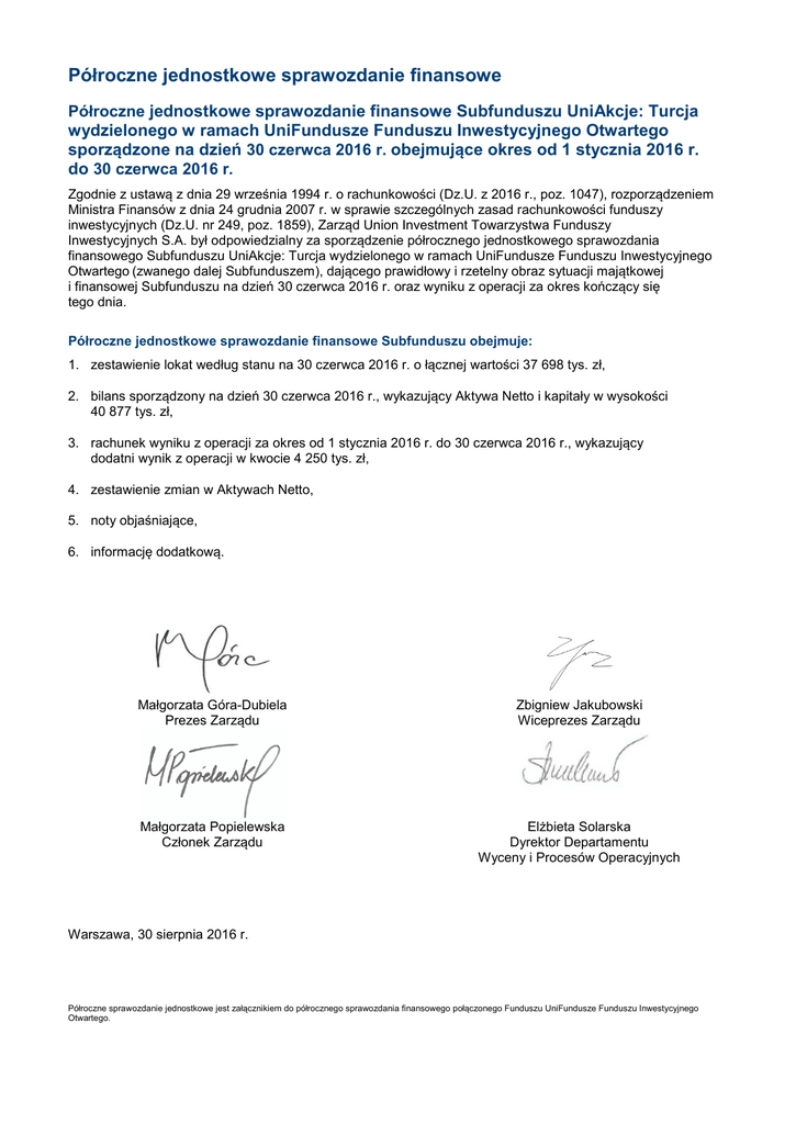 Półroczne jednostkowe sprawozdanie finansowe Półroczne jednostkowe sprawozdanie finansowe Subfunduszu UniAkcje: Turcja wydzielonego w ramach UniFundusze Funduszu Inwestycyjnego Otwartego sporządzone na dzień 30 czerwca 2016 r. obejmujące okres od 1 stycznia 2016 r. do 30 czerwca 2016 r. Zgodnie z ustawą z dnia 29 września 1994 r. o rachunkowości (Dz.U. z 2016 r., poz. 1047), rozporządzeniem Ministra Finansów z dnia 24 grudnia 2007 r. w sprawie szczególnych zasad rachunkowości funduszy inwestycyjnych (Dz.U. nr 249, poz. 1859), Zarząd Union Investment Towarzystwa Funduszy Inwestycyjnych S.A. był odpowiedzialny za sporządzenie półrocznego jednostkowego sprawozdania finansowego Subfunduszu UniAkcje: Turcja wydzielonego w ramach UniFundusze Funduszu Inwestycyjnego Otwartego (zwanego dalej Subfunduszem), dającego prawidłowy i rzetelny obraz sytuacji majątkowej i finansowej Subfunduszu na dzień 30 czerwca 2016 r. oraz wyniku z operacji za okres kończący się tego dnia. Półroczne jednostkowe sprawozdanie finansowe Subfunduszu obejmuje: 1. zestawienie lokat według stanu na 30 czerwca 2016 r. o łącznej wartości 37 698 tys. zł, 2. bilans sporządzony na dzień 30 czerwca 2016 r., wykazujący Aktywa Netto i kapitały w wysokości 40 877 tys. zł, 3. rachunek wyniku z operacji za okres od 1 stycznia 2016 r. do 30 czerwca 2016 r., wykazujący dodatni wynik z operacji w kwocie 4 250 tys. zł, 4. zestawienie zmian w Aktywach Netto, 5. noty objaśniające, 6. informację dodatkową. Małgorzata Góra-Dubiela Prezes Zarządu Zbigniew Jakubowski Wiceprezes Zarządu Małgorzata Popielewska Członek Zarządu Elżbieta Solarska Dyrektor Departamentu Wyceny i Procesów Operacyjnych Warszawa, 30 sierpnia 2016 r. Półroczne sprawozdanie jednostkowe jest załącznikiem do półrocznego sprawozdania finansowego połączonego Funduszu UniFundusze Funduszu Inwestycyjnego Otwartego. subfundusz UniAkcje: Turcja w UniFundusze Fundusz Inwestycyjny Otwarty Tabela główna 30.06.2016 Składniki lokat Akcje Wartość według ceny nabycia (w tys. zł) 33055 31.12.2015 Wartość według wyceny na dzień bilansowy (w tys. zł) 37687 Procentowy udział w aktywach ogółem (w %) 91,45 Wartość według ceny nabycia (w tys. zł) 48232 Wartość według wyceny na dzień bilansowy (w tys. zł) 45610 Procentowy udział w aktywach ogółem (w %) 94,27 Warranty subskrypcyjne Prawa do akcji Prawa poboru Nie dotyczy Kwity depozytowe Nie dotyczy Listy zastawne Dłużne papiery wartościowe Instrumenty pochodne 0 11 0,03 0 0 0,00 45610 94,27 Udziały w spółkach z ograniczoną odpowiedzialnością Jednostki uczestnictwa Certyfikaty inwestycyjne Tytuły uczestnictwa emitowane przez instytucje wspólnego inwestowania mające siedzibę za granicą Wierzytelności Nie dotyczy Weksle Nie dotyczy Depozyty Waluty Nieruchomości Statki morskie Inne Razem 33055 37698 91,48 48232 subfundusz UniAkcje: Turcja w UniFundusze Fundusz Inwestycyjny Otwarty Tabela uzupełniająca Akcje Rodzaj rynku Nazwa rynku Kraj siedziby emitenta Liczba Wartość wedlug ceny nabycia (w tys. zł) Wartość wedlug wyceny na dzień bilansowy (w tys. zł) Procentowy udział w aktywach ogółem (w %) Notowane na rynku aktywnym Akbank TAS ISIN: TRAAKBNK91N6 Aktywny rynek – rynek regulowany Istambul Stock Exchange 313000 Turcja 2921 3557 8,63 Akcansa Cimento ISIN: TRAAKCNS91F3 Aktywny rynek – rynek regulowany Istambul Stock Exchange 23905 Turcja 375 450 1,09 Arcelik AS ISIN: TRAARCLK91H5 Aktywny rynek – rynek regulowany Istambul Stock Exchange 33200 Turcja 827 869 2,11 Aselsan Elektronik Sanayi Ve Ticaret AS ISIN: TRAASELS91H2 Aktywny rynek – rynek regulowany Istambul Stock Exchange 48800 Turcja 464 639 1,55 BIM Birlesik Magazalar AS ISIN: TREBIMM00018 Aktywny rynek – rynek regulowany Istambul Stock Exchange 17302 Turcja 1116 1345 3,26 Bolu Cimento Sanayii AS ISIN: TRABOLUC91F3 Aktywny rynek – rynek regulowany Istambul Stock Exchange 66184 Turcja 585 504 1,22 BRISA BRIDGESTONE SABANCI ISIN: TRABRISA91E3 Aktywny rynek – rynek regulowany Istambul Stock Exchange 45097 Turcja 465 443 1,08 Cimsa Cimento Sanayi VE Tica ISIN: TRACIMSA91F9 Aktywny rynek – rynek regulowany Istambul Stock Exchange 15798 Turcja 258 330 0,80 Coca-Cola Icecek AS ISIN: TRECOLA00011 Aktywny rynek – rynek regulowany Istambul Stock Exchange 18600 Turcja 1055 899 2,18 DO & CO AG ISIN: AT0000818802 Aktywny rynek – rynek regulowany Istambul Stock Exchange 2012 Austria 872 699 1,70 Emlak Konut Gayrimenkul Yatirim ISIN: TREEGYO00017 Aktywny rynek – rynek regulowany Istambul Stock Exchange 310000 Turcja 1006 1227 2,98 Enka Insaat ve Sanayi AS ISIN: TREENKA00011 Aktywny rynek – rynek regulowany Istambul Stock Exchange 57144 Turcja 287 358 0,87 Eregli Demir ve Celik Fabrikalari TAS ISIN: TRAEREGL91G3 Aktywny rynek – rynek regulowany Istambul Stock Exchange 131000 Turcja 481 748 1,82 Ford Otomotiv Sanayi AS ISIN: TRAOTOSN91H6 Aktywny rynek – rynek regulowany Istambul Stock Exchange 29010 Turcja 1145 1243 3,02 Haci Omer Sabanci Holding AS ISIN: TRASAHOL91Q5 Aktywny rynek – rynek regulowany Istambul Stock Exchange 93500 Turcja 1072 1219 2,96 Indeks Bilgisayar Sistemleri Muhendislik Sanayi ve Ticaret AS ISIN: TREINDX00019 Aktywny rynek – rynek regulowany Istambul Stock Exchange 68143 Turcja 720 734 1,78 IS YATIRIM MENKUL DEGERLER A ISIN: TREISMD00011 Aktywny rynek – rynek regulowany Istambul Stock Exchange 352 Turcja 0 0 0,00 Kardemir Karabuk Demir Celik Sanayi ve Ticaret AS ISIN: TRAKRDMR91G7 Aktywny rynek – rynek regulowany Istambul Stock Exchange 22093 Turcja 0 39 0,10 Koc Holding AS ISIN: TRAKCHOL91Q8 Aktywny rynek – rynek regulowany Istambul Stock Exchange 35000 Turcja 577 636 1,54 Koza Altin Isletmeleri AS ISIN: TREKOAL00014 Aktywny rynek – rynek regulowany Istambul Stock Exchange 15507 Turcja 466 278 0,68 Logo Yazilim Sanayi Ve Ticaret AS ISIN: TRALOGOW91U2 Aktywny rynek – rynek regulowany Istambul Stock Exchange 9365 Turcja 594 640 1,55 O