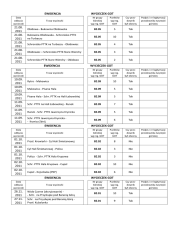 EWIDENCJA Data odbycia wycieczki 21.08. 2011 21.08. 2011 21.08. 2011 21.08. 2011 21.08. 2011 Nr grupy Górskiej wg reg. GOT Punktów wg reg. GOT Czy przodownik był obecny Obidowa - Bukowina Obidowska BZ.05 5 Tak Bukowina Obidowska - Schronisko PTTK na Turbaczu BZ.05 10 Tak Schronisko PTTK na Turbaczu - Obidowiec BZ.05 4 Tak Obidowiec – Schronisko PTTK Stare Wierchy BZ.05 3 Tak Schronisko PTTK Stare Wierchy - Obidowa BZ.05 2 Tak Nr grupy Górskiej wg reg. GOT Punktów wg reg. GOT Czy przodownik był obecny Rytro - Makowica BZ.09 10 Tak Makowica - Pisana Hala BZ.09 5 Tak Pisana Hala - Schr. PTTK na Hali Łabowskiej BZ.09 5 Tak Schr. PTTK na Hali Łabowskiej - Runek BZ.09 7 Tak Runek - Schr. PTTK Jaworzyna Krynicka BZ.09 5 Tak Schr. PTTK Jaworzyna Krynicka - Krynica Zdrój BZ.09 6 Tak Nr grupy Górskiej wg reg. GOT Punktów wg reg. GOT Czy przodownik był obecny Przeł. Krowiarki - Cyl Hali Śmietanowej BZ.02 8 Nie Cyl Hali Śmietanowej - Polica BZ.02 3 Nie Polica - Schr. PTTK Hala Krupowa BZ.02 3 Nie Schr. PTTK Hala Krupowa - Cupel BZ.02 10 Nie Cupel - Kojszówka (PKP) BZ.02 6 Nie Nr grupy Górskiej wg reg. GOT Punktów wg reg. GOT Czy przodownik był obecny Wisła Czarne (skrzyżowanie) - Schr. na Przysłupie pod Baranią Górą BZ.01 10 Tak Schr. na Przysłupie pod Baranią Górą Przeł. Kubalonka BZ.01 9 Tak Trasa wycieczki EWIDENCJA Data odbycia wycieczki 10.09. 2011 10.09. 2011 10.09. 2011 11.09. 2011 11.09. 2011 11.09. 2011 Trasa wycieczki EWIDENCJA Data odbycia wycieczki 01.10. 2011 01.10. 2011 01.10. 2011 02.10. 2011 02.10. 2011 Trasa wycieczki EWIDENCJA Data odbycia wycieczki 26.11. 2011 27.11. 2011 WYCIECZEK GOT Trasa wycieczki Podpis i nr legitymacji przodownika turystyki górskiej WYCIECZEK GOT Podpis i nr legitymacji przodownika turystyki górskiej WYCIECZEK GOT Podpis i nr legitymacji przodownika turystyki górskiej WYCIECZEK GOT Podpis i nr legitymacji przodownika turystyki górskiej EWIDENCJA Data odbycia wycieczki 21.04. 2012 21.04. 2012 22.04. 2012 22.04. 2012 22.04. 2012 WYCIECZEK GOT Trasa wycieczki Nr grupy Górskiej wg reg. GOT Punktów wg reg. GOT Czy przodownik był obecny Rycerka Górna Kolonia - - Schr. PTTK Wielka Racza BZ.02 10 Tak - Schr. PTTK Wielka Racza - Schr. PTTK Przegibek BZ.02 11 Tak Schr. PTTK Przegibek - Wielka Rycerzowa BZ.02 8 Tak Wielka Rycerzowa - Bacówka PTTK Rycerzowa BZ.02 1 Tak Bacówka PTTK Rycerzowa - Soblówka BZ.02 6 Tak EWIDENCJA Data odbycia wycieczki 19.05. 2012 19.05. 2012 19.05. 2012 20.05. 2012 20.05. 2012 20.05. 2012 WYCIECZEK GOT Nr grupy Górskiej wg reg. GOT Punktów wg reg. GOT Czy przodownik był obecny Tylmanowa Rzeka - Jaworzynka BZ.09 9 Tak Jaworzynka - Dzwonkówka BZ.09 6 Tak Dzwonkówka - Schr. PTTK Prehyba BZ.09 9 Tak Schr. PTTK Prehyba - Radziejowa BZ.09 5 Tak Radziejowa - Wielki Rogacz BZ.09 1 Tak Wielki Rogacz - Jaworki BZ.09 6 Tak Trasa wycieczki Podpis i nr legitymacji przodownika turystyki górskiej Podpis i nr legitymacji przodownika turystyki górskiej