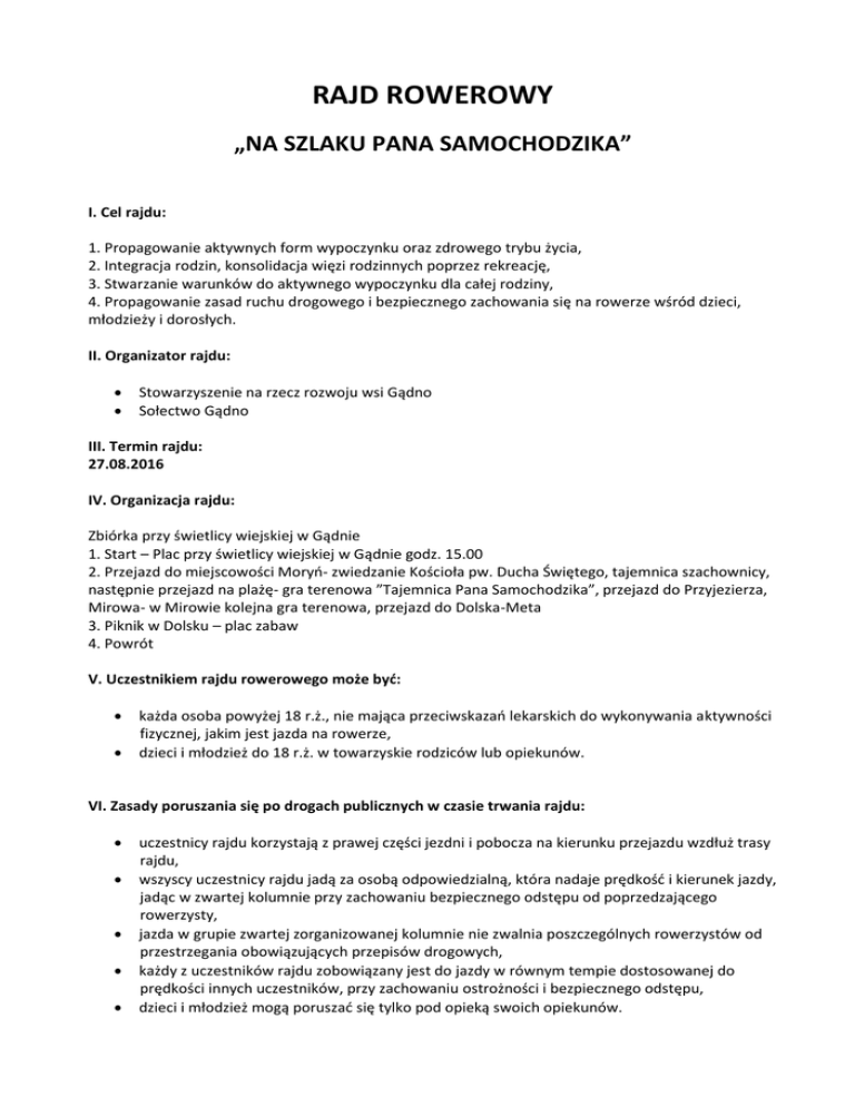 RAJD ROWEROWY „NA SZLAKU PANA SAMOCHODZIKA” I. Cel rajdu: 1. Propagowanie aktywnych form wypoczynku oraz zdrowego trybu życia, 2. Integracja rodzin, konsolidacja więzi rodzinnych poprzez rekreację, 3. Stwarzanie warunków do aktywnego wypoczynku dla całej rodziny, 4. Propagowanie zasad ruchu drogowego i bezpiecznego zachowania się na rowerze wśród dzieci, młodzieży i dorosłych. II. Organizator rajdu: Stowarzyszenie na rzecz rozwoju wsi Gądno Sołectwo Gądno III. Termin rajdu: 27.08.2016 IV. Organizacja rajdu: Zbiórka przy świetlicy wiejskiej w Gądnie 1. Start – Plac przy świetlicy wiejskiej w Gądnie godz. 15.00 2. Przejazd do miejscowości Moryń- zwiedzanie Kościoła pw. Ducha Świętego, tajemnica szachownicy, następnie przejazd na plażę- gra terenowa ”Tajemnica Pana Samochodzika”, przejazd do Przyjezierza, Mirowa- w Mirowie kolejna gra terenowa, przejazd do Dolska-Meta 3. Piknik w Dolsku – plac zabaw 4. Powrót V. Uczestnikiem rajdu rowerowego może być: każda osoba powyżej 18 r.ż., nie mająca przeciwskazań lekarskich do wykonywania aktywności fizycznej, jakim jest jazda na rowerze, dzieci i młodzież do 18 r.ż. w towarzyskie rodziców lub opiekunów. VI. Zasady poruszania się po drogach publicznych w czasie trwania rajdu: uczestnicy rajdu korzystają z prawej części jezdni i pobocza na kierunku przejazdu wzdłuż trasy rajdu, wszyscy uczestnicy rajdu jadą za osobą odpowiedzialną, która nadaje prędkość i kierunek jazdy, jadąc w zwartej kolumnie przy zachowaniu bezpiecznego odstępu od poprzedzającego rowerzysty, jazda w grupie zwartej zorganizowanej kolumnie nie zwalnia poszczególnych rowerzystów od przestrzegania obowiązujących przepisów drogowych, każdy z uczestników rajdu zobowiązany jest do jazdy w równym tempie dostosowanej do prędkości innych uczestników, przy zachowaniu ostrożności i bezpiecznego odstępu, dzieci i młodzież mogą poruszać się tylko pod opieką swoich opiekunów. VII. Zabrania się uczestnikom rajdu rowerowego: jazdy bez trzymania, co najmniej jednej ręki na kierownicy roweru oraz nóg na pedałach, zajeżdżania drogi innym uczestnikom rajdu i użytkownikom drogi, zwalniania lub zatrzymywania bez uzasadnionej przyczyny, wyprzedzania innych uczestników rajdu w niedozwolonych odcinkach trasy, wjeżdżania na chodniki utrudniając poruszanie się pieszym. VIII. W czasie pikniku uczestnicy: otrzymają medal pamiątkowy po uprzednim zarejestrowaniu się odstawiają rowery w wyznaczone i pilnowane miejsca i nie mogą zabierać ich przed ogłoszeniem zakończenia pikniku, i hasłem do ustawienie powrotnego peletonu, otrzymają poczęstunek, po skonsumowaniu posiłku każdy sprząta po sobie (naczynia jednorazowe, papierki itp.) IX. Postanowienia końcowe Rajd rowerowy jest bezpłatny. Organizatorzy zapewniają służby porządkowe: Ochotnicza Straż Pożarna w Moryniu, i informacyjne oraz zabezpieczenia medycznego (ratownik medyczny). Uczestnicy rajdu zobowiązani są do przestrzegania przepisów ruchu drogowego i ścisłego wykonywania poleceń organizatorów oraz służb porządkowych i ratowniczych. Osoby biorące udział rajdzie robią to na własną odpowiedzialność i zobowiązane są do zachowania się w sposób niezagrażający innym uczestnikom. Organizator, wszystkie osoby z nim współpracujące, a także osoby związane z przeprowadzeniem i organizacją przejazdu nie ponoszą odpowiedzialności względem uczestników za wypadki losowe, szkody osobowe, rzeczowe i majątkowe, które wystąpią przed w trakcie lub po przejeździe. Zabrania się noszenia oraz używania broni, niebezpiecznych przedmiotów, materiałów pirotechnicznych, posiadania i spożywania napojów alkoholowych, przyjmowania środków odurzających i substancji psychotropowych. Zabrania się udziału rajdzie osobom będącym pod wpływem alkoholu, środków odurzających i substancji psychotropowych. Zabrania się sprzedawania, reklamowania, akwizycji i przeprowadzania zbiórek pieniężnych bez zgody organizatorów. Za niewłaściwe zachowanie zakłócające bezpieczeństwo przejazdu, uczestnicy mogą zostać usunięci z udziału w imprezie. Organizator imprezy uprawniony jest do rejestrowania jej przebiegu przy pomocy urządzeń rejestrujących obraz i dźwięk oraz do dalszego przetwarzania zapisu. Uczestnicy zobowiązani są do przestrzegania niniejszego Regulaminu. X. Odpowiedzialnym za całość przedsięwzięć związanych z organizacją i przebiegiem rajdu rowerowego jest Katarzyna Kupczyk.