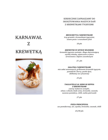 SERDECZNIE ZAPRASZAMY DO SKOSZTOWANIA NASZYCH DAŃ Z KREWETKAMI TYGRYSIMI KARNAWAŁ Z BRUSCHETTA Z KREWETKAMI trzy grzanki z krewetkami tygrysimi, sosem pesto i orzeszkami pinii KREWETKĄ KREWETKI W SZYNCE WŁOSKIEJ krewetki tygrysie owinięte długo dojrzewającą szynką włoską, zapieczone w piecu serwowane z dipem czosnkowym 18 pln 25 pln SAŁATKA Z KREWETKAMI mix sałat sezonowych, grillowane krewetki tygrysie, pomidorki cherry, pestki dyni, delikatny sos cytrynowy 25 pln TAGLIATELLE AL NERO DI SEPPIA Z KREWETKAMI czarny makaron wstążki , oliwa z oliwek, białe wino, krewetki, czosnek, suszone pomidory, chilli, natka pietruszki 27 pln PIZZA PRINCIPESSA sos pomidorowy, ser, szynka, krewetki, czosnek, chilli 25/30 pln