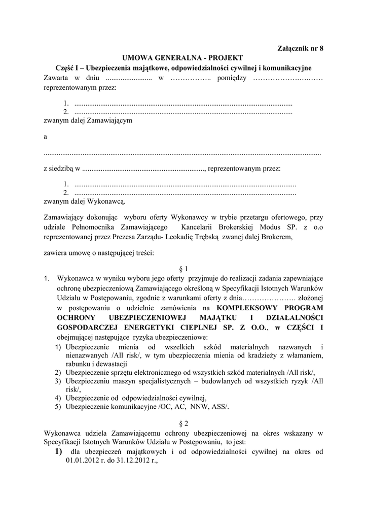 Załącznik nr 8 UMOWA GENERALNA - PROJEKT Część I – Ubezpieczenia majątkowe, odpowiedzialności cywilnej i komunikacyjne Zawarta w dniu ......................... w …………….. pomiędzy ……………….….…… reprezentowanym przez: 1. ...................................................................................................................... 2. ...................................................................................................................... zwanym dalej Zamawiającym a ...................................................................................................................................................... z siedzibą w .................................................................., reprezentowanym przez: 1. ........................................................................................................................ 2. ........................................................................................................................ zwanym dalej Wykonawcą. Zamawiający dokonując wyboru oferty Wykonawcy w trybie przetargu ofertowego, przy udziale Pełnomocnika Zamawiającego Kancelarii Brokerskiej Modus SP. z o.o reprezentowanej przez Prezesa Zarządu- Leokadię Trębską zwanej dalej Brokerem, zawiera umowę o następującej treści: §1 1. Wykonawca w wyniku wyboru jego oferty przyjmuje do realizacji zadania zapewniające ochronę ubezpieczeniową Zamawiającego określoną w Specyfikacji Istotnych Warunków Udziału w Postępowaniu, zgodnie z warunkami oferty z dnia…………………. złożonej w postępowaniu o udzielnie zamówienia na KOMPLEKSOWY PROGRAM OCHRONY UBEZPIECZENIOWEJ MAJĄTKU I DZIAŁALNOŚCI GOSPODARCZEJ ENERGETYKI CIEPLNEJ SP. Z O.O., w CZĘŚCI I obejmującej następujące ryzyka ubezpieczeniowe: 1) Ubezpieczenie mienia od wszelkich szkód materialnych nazwanych i nienazwanych /All risk/, w tym ubezpieczenia mienia od kradzieży z włamaniem, rabunku i dewastacji 2) Ubezpieczenie sprzętu elektronicznego od wszystkich szkód materialnych /All risk/, 3) Ubezpieczeniu maszyn specjalistycznych – budowlanych od wszystkich ryzyk /All risk/, 4) Ubezpieczenie od odpowiedzialności cywilnej, 5) Ubezpieczenie komunikacyjne /OC, AC, NNW, ASS/. §2 Wykonawca udziela Zamawiającemu ochrony ubezpieczeniowej na okres wskazany w Specyfikacji Istotnych Warunków Udziału w Postępowaniu, to jest: 1) dla ubezpieczeń majątkowych i od odpowiedzialności cywilnej na okres od 01.01.2012 r. do 31.12.2012 r., 2) dla ubezpieczeń komunikacyjnych począwszy od dnia 01.01.2012 r. na roczny okres ubezpieczenia z uwzględnieniem początku ochrony ubezpieczeniowej dla każdego pojazdu i ekspiracją dotychczasowej polisy. 1. 2. 3. §3 Zawarcie umów ubezpieczenia zostaje przez Wykonawcę potwierdzone poprzez wystawienie stosownych polis ubezpieczeniowych dla poszczególnych ryzyk na warunkach określonych w złożonej ofercie. Wykonawca zobowiązuje się wystawić polisy na roczny okres ubezpieczenia tj. od 01.01.2012 r. do 31.12.2012 r. Wszystkie zapisy w polisach obowiązkowo muszą być zgodne z zapisami w ofercie Wykonawcy oraz uwzględniać wymogi określone SIWUP. §4 1. Wykonawca zobowiązany jest do wystawienia polis ubezpieczenia nie później niż w terminie do 7 dni przed rozpoczęciem rocznego okresu ubezpieczenia dla poszczególnych ryzyk, określonego w SIWUP – dotyczy ubezpieczeń od wszystkich szkód materialnych, ubezpieczenia maszyn specjalistycznych – budowlanych od wszystkich ryzyk, sprzętu elektronicznego od wszystkich ryzyk oraz od odpowiedzialności cywilnej. 2. W przypadku zagrożenia dotrzymania terminu określonego w ust.1 niniejszego paragrafu, Wykonawca zobowiązany jest do czasu wystawienia polis ubezpieczeniowych z wyjątkiem ubezpieczeń komunikacyjnych, do potwierdzenia faktu udzielania ochrony poprzez wystawienie dokumentu tymczasowego tzw. noty pokrycia ubezpieczeniowego. W tym przypadku polisy zostaną wystawione nie później niż do 14 dni licząc od początku rozpoczęcia rocznej ochrony ubezpieczeniowej. 3. Polisy ubezpieczeń komunikacyjnych /AC, OC, NNW,ASS/ wystawione winny być nie później niż 5 dni przed początkiem okresu ubezpieczenia dla każdego pojazdu , przy czym wszystkie polisy ubezpieczeń komunikacyjnych, których okres ubezpieczenia rozpoczyna się w okresie obowiązywania polis majątkowych wyżej wymieniowych w § 2 pkt. 1, winny być wystawione nie później niż w ciągu 7 dni przed rozpoczęciem okresu ubezpieczenia. 1. 2. 3. 4. §5 Wykonawca zobowiązuje się do kontaktowania z Zamawiającym za pośrednictwem Pełnomocnika Zamawiającego tj. Kancelarii Brokerskiej Modus szczególnie w zakresie spraw związanych z zawartymi umowami ubezpieczenia, realizacją ochrony ubezpieczeniowej oraz z prowadzonymi czynnościami likwidacyjnymi z wyjątkiem spraw związanych z oględzinami bądź wstępną likwidacją szkód prowadzoną bezpośrednio przez rzeczoznawcę działającego w imieniu Wykonawcy. Zgłoszenia szkód dokonuje Zamawiający lub Broker telefonicznie lub w formie elektronicznej a Wykonawca rejestruje szkodę i nadaje numer szkodzie przekazując ten numer zgłaszającemu szkodę. Wykonawca po przyjęciu zgłoszenia szkody zobowiązuje się w terminie nie później niż 2 dni roboczych od daty zgłoszenia szkody do uzgodnienia z Zamawiającym terminu oględzin szkody. Termin oględzin szkody i podjętych wstępnych czynności likwidacyjnych powinien nastąpić nie później niż w ciągu 2 dni roboczych od daty zgłoszenia szkody. Wykonawca zobowiązuje się każdorazowo potwierdzać Zamawiającemu lub Brokerowi drogą elektroniczną wyznaczony termin oględzin szkody. 5. W przypadku opóźnienia ze strony Wykonawcy terminu przeprowadzenia oględzin szkody tzw. wstępnych czynności likwidacyjnych dla zgłoszonej szkody w terminie 7 dni roboczych od daty zgłoszenia lub w innym terminie uzgodnionym z Zamawiającym, Zamawiający ma prawo 