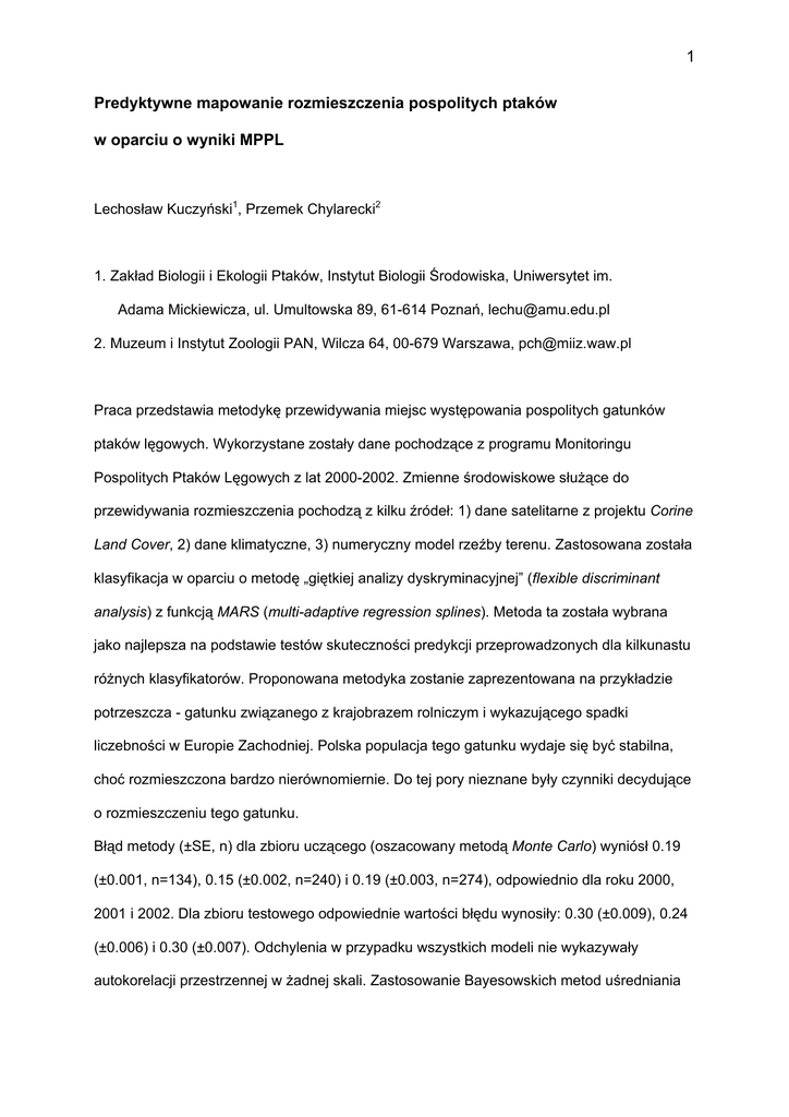 1 Predyktywne mapowanie rozmieszczenia pospolitych ptaków w oparciu o wyniki MPPL Lechosław Kuczyński1, Przemek Chylarecki2 1. Zakład Biologii i Ekologii Ptaków, Instytut Biologii Środowiska, Uniwersytet im. Adama Mickiewicza, ul. Umultowska 89, 61-614 Poznań, [email protected] 2. Muzeum i Instytut Zoologii PAN, Wilcza 64, 00-679 Warszawa, [email protected] Praca przedstawia metodykę przewidywania miejsc występowania pospolitych gatunków ptaków lęgowych. Wykorzystane zostały dane pochodzące z programu Monitoringu Pospolitych Ptaków Lęgowych z lat 2000-2002. Zmienne środowiskowe służące do przewidywania rozmieszczenia pochodzą z kilku źródeł: 1) dane satelitarne z projektu Corine Land Cover, 2) dane klimatyczne, 3) numeryczny model rzeźby terenu. Zastosowana została klasyfikacja w oparciu o metodę „giętkiej analizy dyskryminacyjnej” (flexible discriminant analysis) z funkcją MARS (multi-adaptive regression splines). Metoda ta została wybrana jako najlepsza na podstawie testów skuteczności predykcji przeprowadzonych dla kilkunastu różnych klasyfikatorów. Proponowana metodyka zostanie zaprezentowana na przykładzie potrzeszcza - gatunku związanego z krajobrazem rolniczym i wykazującego spadki liczebności w Europie Zachodniej. Polska populacja tego gatunku wydaje się być stabilna, choć rozmieszczona bardzo nierównomiernie. Do tej pory nieznane były czynniki decydujące o rozmieszczeniu tego gatunku. Błąd metody (±SE, n) dla zbioru uczącego (oszacowany metodą Monte Carlo) wyniósł 0.19 (±0.001, n=134), 0.15 (±0.002, n=240) i 0.19 (±0.003, n=274), odpowiednio dla roku 2000, 2001 i 2002. Dla zbioru testowego odpowiednie wartości błędu wynosiły: 0.30 (±0.009), 0.24 (±0.006) i 0.30 (±0.007). Odchylenia w przypadku wszystkich modeli nie wykazywały autokorelacji przestrzennej w żadnej skali. Zastosowanie Bayesowskich metod uśredniania 2 modeli z poszczególnych lat badań (z prawdopodobieństwami a-posteriori proporcjonalnymi do zdolności predykcyjnych modeli składowych) daje poprawę skuteczności klasyfikacji. Przy użyciu wszystkich dostępnych informacji z trzech lat, oszacowany błąd wynosi wtedy 0.18. Na podstawie tego modelu opracowana została mapa występowania potrzeszcza w Polsce o rozdzielczości 1 km. Ponadto rozpoznane zostały czynniki środowiskowe decydujące o występowaniu gatunku. Prezentowana metodyka umożliwia zaprojektowanie i przeprowadzenie badań, których efektem będzie opracowanie szczegółowych map występowania pospolitych gatunków ptaków. Propozycja opiera się na koncepcjach: 1) reprezentatywnego i losowego próbkowania, 2) wykorzystania teledetekcji satelitarnej do pomiaru cech środowiska, 3) zastosowania nowoczesnych metod statystycznych do predykcji i interpolacji.