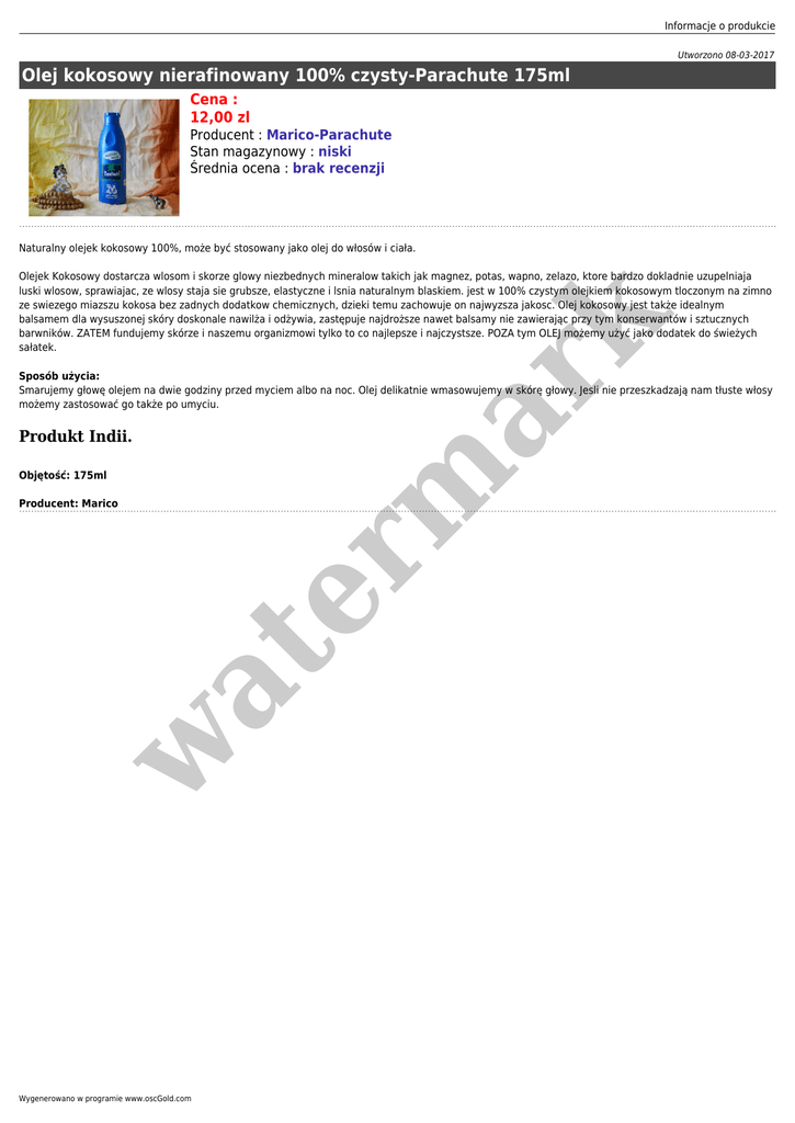 Informacje o produkcie Utworzono 08-03-2017 Olej kokosowy nierafinowany 100% czysty-Parachute 175ml Cena : 12,00 zl Producent : Marico-Parachute Stan magazynowy : niski Średnia ocena : brak recenzji Naturalny olejek kokosowy 100%, może być stosowany jako olej do włosów i ciała. er m ar k Olejek Kokosowy dostarcza wlosom i skorze glowy niezbednych mineralow takich jak magnez, potas, wapno, zelazo, ktore bardzo dokladnie uzupelniaja luski wlosow, sprawiajac, ze wlosy staja sie grubsze, elastyczne i lsnia naturalnym blaskiem. jest w 100% czystym olejkiem kokosowym tloczonym na zimno ze swiezego miazszu kokosa bez zadnych dodatkow chemicznych, dzieki temu zachowuje on najwyzsza jakosc. Olej kokosowy jest także idealnym balsamem dla wysuszonej skóry doskonale nawilża i odżywia, zastępuje najdroższe nawet balsamy nie zawierając przy tym konserwantów i sztucznych barwników. ZATEM fundujemy skórze i naszemu organizmowi tylko to co najlepsze i najczystsze. POZA tym OLEJ możemy użyć jako dodatek do świeżych sałatek. Sposób użycia: Smarujemy głowę olejem na dwie godziny przed myciem albo na noc. Olej delikatnie wmasowujemy w skórę głowy. Jesli nie przeszkadzają nam tłuste włosy możemy zastosować go także po umyciu. Produkt Indii. Objętość: 175ml w at Producent: Marico Wygenerowano w programie www.oscGold.com
