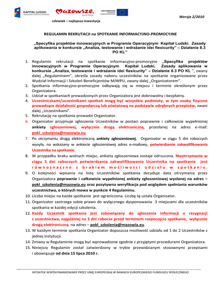 Wersja 2/2010 człowiek – najlepsza inwestycja REGULAMIN REKRUTACJI na SPOTKANIE INFORMACYJNO‐PROMOCYJNE „Specyfika projektów innowacyjnych w Programie Operacyjnym Kapitał Ludzki. Zasady aplikowania w konkursie „Analiza, testowanie i wdrażanie idei flexicurity” – Działanie 8.3 PO KL” 1. Regulamin rekrutacji na spotkanie informacyjno‐promocyjne „Specyfika projektów innowacyjnych w Programie Operacyjnym Kapitał Ludzki. Zasady aplikowania w konkursie „Analiza, testowanie i wdrażanie idei flexicurity” – Działanie 8.3 PO KL ”, zwany dalej „Regulaminem”, określa zasady naboru uczestników na spotkanie organizowane przez Wydział Informacji i Szkoleń Beneficjentów MJWPU, zwany dalej „Organizatorem”. 2. Spotkania informacyjno‐promocyjne odbywają się w miejscu i terminie określonym przez Organizatora. 3. Udział w spotkaniach prowadzonych przez Organizatora jest dobrowolny i bezpłatny. 4. Uczestniczkami/uczestnikami spotkań mogą być wszystkie podmioty, w tym osoby fizyczne prowadzące działalność gospodarczą lub oświatową na podstawie odrębnych przepisów, zwani dalej „Uczestnikami”. 5. Rekrutację na spotkania prowadzi Organizator. 6. Organizator przyjmuje zgłoszenia Uczestników w postaci poprawnie i całkowicie wypełnionej ankiety zgłoszeniowej, wyłącznie drogą elektroniczną, przesłanej na adres e‐mail: [email protected]. 7. Po otrzymaniu drogą elektroniczną ankiety zgłoszeniowej, Organizator w ciągu 5 dni roboczych wysyła, na wskazany w ankiecie zgłoszeniowej adres e‐mailowy, potwierdzenie zakwalifikowania Uczestnika na spotkanie. 8. W przypadku braku wolnych miejsc, ankieta zgłoszeniowa zostaje odrzucona. Nieotrzymanie w ciągu 5 dni roboczych potwierdzenia zakwalifikowania Uczestnika na spotkanie jest r ó w n o z n a c z n e z b r a k i e m m o ż l i w o ś c i u d z i a ł u w s p o t k a n i u . 9. O kolejności wpisania na listę Uczestników spotkania decyduje data otrzymania przez Organizatora poprawnie i całkowicie wypełnionej ankiety zgłoszeniowej wysłanej na adres – [email protected] oraz pozytywna weryfikacja pod względem spełniania warunków uczestnictwa, o których mowa w punkcie 4 Regulaminu. 10. Liczba miejsc na każde spotkanie jest ograniczona. Liczbę tę ustala Organizator. 11. Organizator zastrzega sobie prawo do wyłącznego dysponowania 3 miejscami dla uczestników spotkania w każdej edycji szkolenia. 12. Każdy Uczestnik spotkania jest zobowiązany do zgłoszenia informacji o rezygnacji z uczestnictwa, najpóźniej na 3 dni robocze przed terminem rozpoczęcia spotkania, wyłącznie drogą elektroniczną na adres – [email protected]. 13. W każdym terminie spotkania Organizator dopuszcza możliwość udziału od 1 do 2 Uczestników z jednej instytucji. 14. Zmiany w Regulaminie mogą być wprowadzone zgodnie z przyjętymi procedurami Organizatora. 15. Niniejszy Regulamin został zatwierdzony w trybie przewidzianym stosownymi przepisami i obowiązuje od dnia 15 lipca 2010 r. WYDATEK WSPÓŁFINANSOWANY PRZEZ UNIĘ EUROPEJSKĄ W RAMACH EUROPEJSKIEGO FUNDUSZU SPOŁECZNEGO