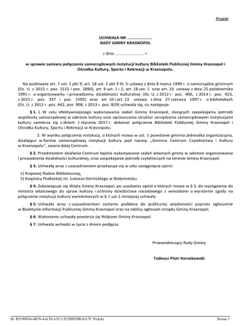 Projekt UCHWAŁA NR .................... RADY GMINY KRASNOPOL z dnia .................... .... r. w sprawie zamiaru połączenia samorządowych instytucji kultury Biblioteki Publicznej Gminy Krasnopol i Ośrodka Kultury, Sportu i Rekreacji w Krasnopolu. Na podstawie art. 7 ust. 1 pkt 9, art. 18 ust. 2 pkt 9 lit. h ustawy z dnia 8 marca 1990 r. o samorządzie gminnym (Dz. U. z 2015 r. poz. 1515 i poz. 1890), art. 9 ust. 1 i 2, art. 18 ust. 1 oraz art. 19 ustawy z dnia 25 października 1991 r. o organizowaniu i prowadzeniu działalności kulturalnej (Dz. U. z 2012 r. poz. 406, z 2014 r. poz. 423, z 2015 r. poz. 337 i poz. 1505) oraz art. 10 i art. 13 ustawy z dnia 27 czerwca 1997 r. o bibliotekach (Dz. U. z 2012 r. poz. 642, poz. 908, z 2013 r. poz. 829) uchwala się, co następuje: § 1. 1. W celu efektywniejszego wykonywania zadań Gminy Krasnopol, służących zaspokajaniu potrzeb wspólnoty samorządowej w zakresie kultury oraz upraszczania struktur zarządzania samorządowymi instytucjami kultury zamierza się z dniem 1 stycznia 2017 r. dokonać połączenia Biblioteki Publicznej Gminy Krasnopol i Ośrodka Kultury, Sportu i Rekreacji w Krasnopolu. 2. W wyniku połączenia instytucji, o których mowa w ust. 1 powstanie gminna jednostka organizacyjna, działająca w formie samorządowej instytucji kultury pod nazwą: „Gminne Centrum Czytelnictwa i Kultury w Krasnopolu”, zwana dalej Centrum. § 2. Przedmiotem działania Centrum będzie wykonywanie zadań własnych gminy w zakresie organizowania i prowadzenia działalności kulturalnej, oraz zaspokajanie potrzeb czytelniczych na terenie Gminy Krasnopol. § 3. Uchwałę wraz z uzasadnieniem przekazuje się w celu zasięgnięcia opinii: 1) Krajowej Radzie Bibliotecznej, 2) Książnicy Podlaskiej im. Łukasza Górnickiego w Białymstoku. § 4. Zobowiązuje się Wójta Gminy Krasnopol, po uzyskaniu opinii o których mowa w § 3, do wystąpienia do ministra właściwego do spraw kultury i ochrony dziedzictwa narodowego z wnioskiem o wyrażenie zgody na połączenie instytucji kultury wymienionych w § 1 ust.1 niniejszej uchwały. § 5. Uchwała wraz z uzasadnieniem zostanie poddana do publicznej wiadomości poprzez ogłoszenie w Biuletynie Informacji Publicznej Gminy Krasnopol oraz na tablicy ogłoszeń Urzędu Gminy Krasnopol. § 6. Wykonanie uchwały powierza się Wójtowi Gminy Krasnopol. § 7. Uchwała wchodzi w życie z dniem podjęcia. Przewodniczący Rady Gminy Tadeusz Piotr Korsakowski Id: B5590034-4B78-4ACB-A3C5-5CDDFDB18A79. Projekt Strona 1 UZASADNIENIE DO UCHWAŁY NR ....................RADY GMINY KRASNOPOL z dnia .................... 2016 r. w sprawie zamiaru połączenia samorządowych instytucji kultury Biblioteki Publicznej Gminy Krasnopol i Ośrodka Kultury, Sportu i Rekreacji w Krasnopolu. Zgodnie z art. 18 ust. 1 ustawy z dnia 25 października 1991 r. o organizowaniu i prowadzeniu działalności kulturalnej organizator może dokonać połączenia instytucji kultury. Stosownie do przepisu art. 19 połączenie instytucji kultury polega na utworzeniu jednej instytucji, w której skład wchodzą załogi i mienie należące do instytucji podlegających połączeniu. Natomiast zgodnie z art. 13 ustawy z dnia 27 czerwca 1997 r. o bibliotekach Organizator może dokonać połączenia, przy czym Organizator jest obowiązany na 6 miesięcy przed dniem wydania aktu o połączeniu, podać do publicznej wiadomości informację o swoim zamiarze wraz z uzasadnieniem. Ponadto na organizatorze przy połączeniu biblioteki ciąży obowiązek zasięgnięcia opinii Krajowej Rady Bibliotecznej Książnicy Podlaskiej im. Łukasza Górnickiego w Białymstoku oraz uzyskanie zgody od ministra właściwego do spraw kultury i ochrony dziedzictwa narodowego. W związku z powyższym konieczne jest podjęcie uchwały przez Radę Gminy w Krasnopolu o zamiarze połączenia samorządowych instytucji kultury. Istotną przesłanką do podjęcia uchwały w sprawie zamiaru połączenia Biblioteki Publicznej Gminy Krasnopol i Ośrodka Kultury, Sportu i Rekreacji w Krasnopolu jest potrzeba efektywniejszego wykonywania zadań własnych Gminy w sferze kultury poprzez uproszczenie struktur zarządzania w samorządowych instytucjach kultury. Połączenie Biblioteki Publicznej Gminy Krasnopol i Ośrodka Kultury, Sportu i Rekreacji w Krasnopolu jest w pełni uzasadnione merytorycznie i ekonomicznie. W wyniku połączenia samorządowych instytucjach kultury nie ulegnie obniżeniu jakość i ilość świadczonych usług. Wręcz przeciwnie przyczyni się to do zapewnienia lepszego poziomu usług i imprez kulturalnych organizowanych na terenie gminy. Utworzenie jednej instytucji, w której skład wejdą pracownicy i mienie należące do instytucji podlegających połączeniu wpłynie pozytywnie na organizowanie działalności kulturalnej. Pozwoli na elastyczne i efektywne wykorzystanie zasobów materialnych obu instytucji oraz sprawniejszą organizację pracy. Nastąpi centralizacja zarządzania oraz połączenie służby finansowo-księgowej, obsługi sprzętu, urządzeń itp. Umożliwi też wydłużenie czasu pracy placówki, przez co będzie bardziej dostępna dla mieszkańców. Po połączeniu pracownicy biblioteki staną się pracownikami jednej nowo utworzonej instytucji kultury o nazwie „Gminne Centrum Czytelnictwa i Kultury w Krasnopolu”. Ilość stanowisk i etatów związanych z obsługą biblioteczną po dokonaniu połączenia nie zmniejszy się. Zadania biblioteki wykonywane będą przez pracowników na stanowiskach bibliotekarskich. Wskutek połączenia nie wystąpią ograniczenia finansowe ani też ilości zasobu bibliotecznego. Środki finansowe na działalność biblioteczną zostaną zabezpieczone w dotacji przyznanej przez Radę Gminy Krasnopol. Podstawą gospodarki finansowej będzie plan finansowy ustalony przez dyrektora, z zachowaniem wysokości dotacji organizatora, sporządzony zgodnie z ustawą o finansach publicznych. Partnerem dla bibliotek