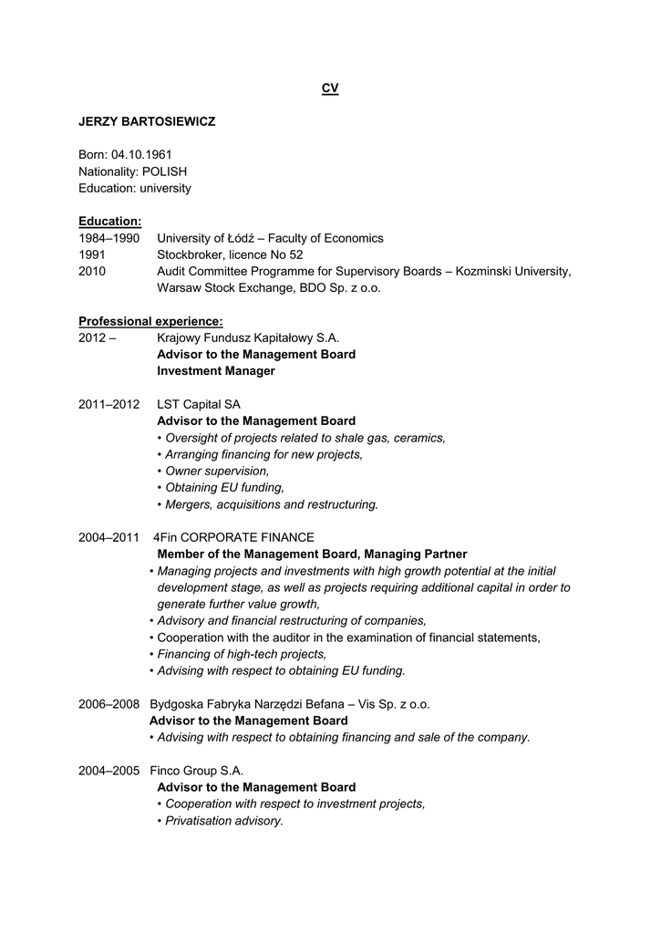 CV JERZY BARTOSIEWICZ Born: 04.10.1961 Nationality: POLISH Education: university Education: 1984–1990 1991 2010 University of Łódź – Faculty of Economics Stockbroker, licence No 52 Audit Committee Programme for Supervisory Boards – Kozminski University, Warsaw Stock Exchange, BDO Sp. z o.o. Professional experience: 2012 – Krajowy Fundusz Kapitałowy S.A. Advisor to the Management Board Investment Manager 2011–2012 2004–2011 LST Capital SA Advisor to the Management Board • Oversight of projects related to shale gas, ceramics, • Arranging financing for new projects, • Owner supervision, • Obtaining EU funding, • Mergers, acquisitions and restructuring. 4Fin CORPORATE FINANCE Member of the Management Board, Managing Partner • Managing projects and investments with high growth potential at the initial development stage, as well as projects requiring additional capital in order to generate further value growth, • Advisory and financial restructuring of companies, • Cooperation with the auditor in the examination of financial statements, • Financing of high-tech projects, • Advising with respect to obtaining EU funding. 2006–2008 Bydgoska Fabryka Narzędzi Befana – Vis Sp. z o.o. Advisor to the Management Board • Advising with respect to obtaining financing and sale of the company. 2004–2005 Finco Group S.A. Advisor to the Management Board • Cooperation with respect to investment projects, • Privatisation advisory. 2002–2005 Browary Polskie Brok-Strzelec S.A. Finance Director, Advisor to the Management Board • Obtaining financing, • Financial restructuring, • Arrangement of bonds issue, • Sale of an enterprise to a trade investor. 2001–2002 NFI im. E. Kwiatkowskiego S.A. Advisor to the Management Board • Restructuring of companies as part of the Mass Privatisation Programme (PPP), • Privatisation projects. 2000–2001 Cresco Financial Advisors Advisor to the Management Board 1998–2000 Powszechny Zakład Ubezpieczeń na Życie S.A. Vice-President of the Management Board • Establishment of OFE PZU SA, • Secretary of the Supervisory Board of OFE PZU SA, • Participation in the establishment of TFI PZU SA, • Reorganization of the network of inspectorates and branches of PZU Życie SA, • Creation of asset-liability matching model, • Cooperation with the auditor in the examination of financial statements, • Creation of investment procedures for the investment office and supervision office, • Development of a methodology and procedures for cooperation with banks, the Ministry of Finance, other major partners of PZU. 1992–1998 Bank Handlowy w Warszawie, Capital Operations Centre Directory, Deputy Director • Organisation and then management of the Capital Operations Centre, • Head of the team establishing the Investment Fund company of Bank Handlowy, and then Chairman of the Supervisory Board of TFI BH, • Member of the team establishing the Open Pension Fund of Bank Handlowy and PKO BP, and then member of the Supervisory Board; member of the team responsible for privatisation of Bank Handlowy, TP SA, • Active participation in the establishment of the Association of Stockbrokers, • Judge of the Court for Stockbrokers, • Active participation in the establishment of the Association of Brokerage Companies, • Member of the Management Board of ZPW, • Active participation in the creation of the consortia for the sale of capital market instruments, • Active participation in the creation of the alternative OTC securities market CeTo SA, • Participation in works involving issuance of first municipal bonds in Poland for the city of Ostrów and the city of Gdańsk, • Advisory with respect to obtaining project financing for Petrochemia Płock, KGHM Polska Miedź and many other companies. 1991–1992 Bank Handlowo-Kredytowy S.A. Broker • Co-arranger of the brokerage office, • Concluding transactions on the Warsaw Stock Exchange. Stockbroker – securities specialist at the Warsaw Stock Exchange. Participation in the governing bodies of the companies: At present: Chairman of the Supervisory Board of Skyline Venture Fund Chairman of the Investor Board of Impera Seed Fund Vice-Chairman of the Supervisory Board of Polnord SA Member of the Supervisory Board of GPV I Fund Member of the Investment Committee of Helix Ventures Partners FIZ Member of the Investment Committee of Venture Capital Satus FIZ Member of the Investment Committee of Skyline Venture Fund Member of the Investment Committee of Internet Venture FIZ Fund Member of the Investment Committee of IMPERA Seed Fund Member of the Audit Committee of Polnord SA Previously: Member of the Management Board of the Chamber of Brokerage Houses Chairman of the Supervisory Board of CeTO S.A. Chairman of the Supervisory Board of KROSNO S.A. Chairman of the Supervisory Board of IV NFI Deputy Chairman of the Supervisory Board of TFI Banku Handlowego Secretary of the Supervisory Board of PTE PZU S.A. Member of the Supervisory Board of PTE Banku Handlowego i PKO BP Member of the Supervisory Board of Browary PERŁA S.A. Member of the Supervisory Board of Drugi NFI Chairman of the Supervisory Board of ADVADIS in Krakow Member of the Supervisory Board of Stoczek Sp. z o.o. in Stoczek Łukowski Member of the Supervisory Board of ELMO S.A. in Siedlce Member of the Supervisory Board of LZMO S.A. in Lubsko