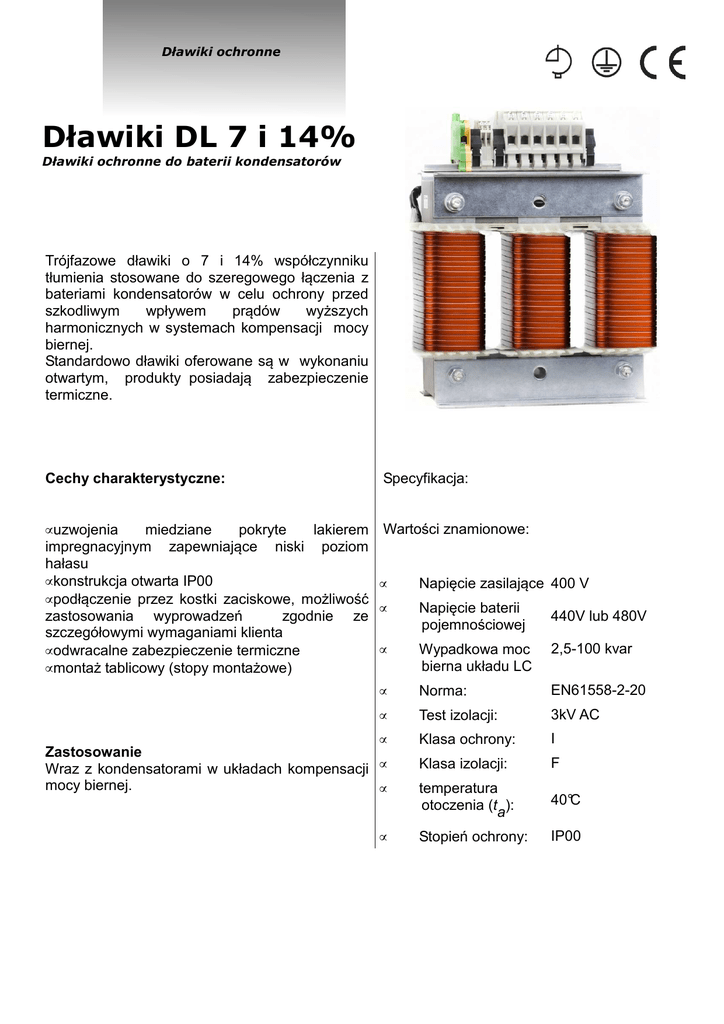 Dławiki ochronne Dławiki DL 7 i 14% Dławiki ochronne do baterii kondensatorów Trójfazowe dławiki o 7 i 14% współczynniku tłumienia stosowane do szeregowego łączenia z bateriami kondensatorów w celu ochrony przed szkodliwym wpływem prądów wyższych harmonicznych w systemach kompensacji mocy biernej. Standardowo dławiki oferowane są w wykonaniu otwartym, produkty posiadają zabezpieczenie termiczne. Cechy charakterystyczne: Specyfikacja: • uzwojenia miedziane pokryte lakierem impregnacyjnym zapewniające niski poziom hałasu • konstrukcja otwarta IP00 • podłączenie przez kostki zaciskowe, możliwość zastosowania wyprowadzeń zgodnie ze szczegółowymi wymaganiami klienta • odwracalne zabezpieczenie termiczne • montaż tablicowy (stopy montażowe) Wartości znamionowe: • Napięcie zasilające 400 V • Napięcie baterii pojemnościowej • Wypadkowa moc bierna układu LC 2,5-100 kvar • Norma: EN61558-2-20 • Test izolacji: 3kV AC Klasa ochrony: I Klasa izolacji: F temperatura otoczenia (ta): 40°C Stopień ochrony: IP00 • Zastosowanie Wraz z kondensatorami w układach kompensacji • mocy biernej. • • 440V lub 480V Parametry Dławiki o 7% współczynniku tłumienia dla napięcia układu 400 V i baterii 440 V Moc IndukPrąd cyjnoś Klasa bater Numer Typ dławika (A) ii artykułu ć izol. kvar [mH] DL 2,5-7-440 DL 5-7-440 DL 7,5-7-440 DL 10-7-440 DL12,5-7-440 DL 15-7-440 DL20-7-440 DL25-7-440 DL30-7-440 DL40-7-440 DL50-7-440 DL60-7-440 DL75-7-440 DL100-7-440 2,5 5 7,5 10 12,5 15 20 25 30 40 50 60 75 100 8-089-002447F 8-089-005447F 8-089-007447F 8-089-010447F 8-089-012447F 8-089-015447F 8-089-020447F 8-089-025447F 8-089-030447F 8-089-040447F 8-089-050447F 8-089-060447F 8-089-075447F 8-089-100447F 3,2 6,4 9,6 12,8 16,0 19,2 25,7 32,1 38,5 51,3 64,1 77,0 96,2 128,3 17,25 8,63 5,75 4,31 3,45 2,89 2,16 1,73 1,44 1,08 0,86 0,72 0,58 0,43 Dławiki o 14% współczynniku tłumienia dla napięcia układu 400 V i baterią 480 V Moc IndukNumer Prąd Typ dławika baterii cyjność atykułu (A) kvar [mH] DL 2,5-14-480 2,5 8-089-002414 2,9 41,07 DL 5-14-480 5 8-089-005414F 5,8 20,53 DL 7,5-14-480 7,5 8-089-007414F 8,7 13,69 DL 10-14-480 10 8-089-010414F 11,7 10,27 DL15-14-480 15 8-089-015414F 17,5 6,84 DL20-14-480 20 8-089-020414F 23,3 5,13 DL25-14-480 25 8-089-025414F 29,1 4,11 DL30-14-480 30 8-089-030414F 35,0 3,42 DL40-14-480 40 8-089-040414F 46,6 2,57 DL50-14-480 50 8-089-050414F 58,3 2,05 DL60-14-480 60 8-089-060414F 69,9 1,71 DL80-14-480 80 8-089-080414F 93,2 1,28 DL100-14-480 100 8-089-100414F 116,6 1,03 *wymiar przybliżony F F F F F F F F F F F F F F Wymiary [mm] A B C D E G Mas a [kg] 126 130 156 156 156 190 190 210 230 230 230 265 265 340 84 80 90 92 82 82 130 117 117 137 137 137 122 170 130 150 159 159 170 170 170 202 202 277 277 308 310 325 100 100 132 132 132 171 171 180 180 176 176 200 200 248 56 56 58 70 58 58 80 97 97 95 95 95 100 110 8x5 8x5 12x7 12x7 12x7 12x7 12x7 13x9 13x9 18x10 18x10 18x10 18x10 18x10 2,0 2,8 3,9 4,2 6,3 6,8 9,5 12,0 14,5 18,5 22,0 26,0 28,0 37,0 Wymiary [mm] A B C D E G 125 155 190 190 210 230 240 240 265 300 300 265 420 71 77 82 92 117 114 128 154 184 184 202 238 100 130 170 170 175 176 185 185 200 224 224 248 316 55 56 57,5 67,5 97 95 95 95 124 94 119 110 143 5x8 8x12 8x12 8x12 9x13 9x13 10x18 10x18 10x18 10x18 10x18 10x18 13x20 117 132 160 185 132 240