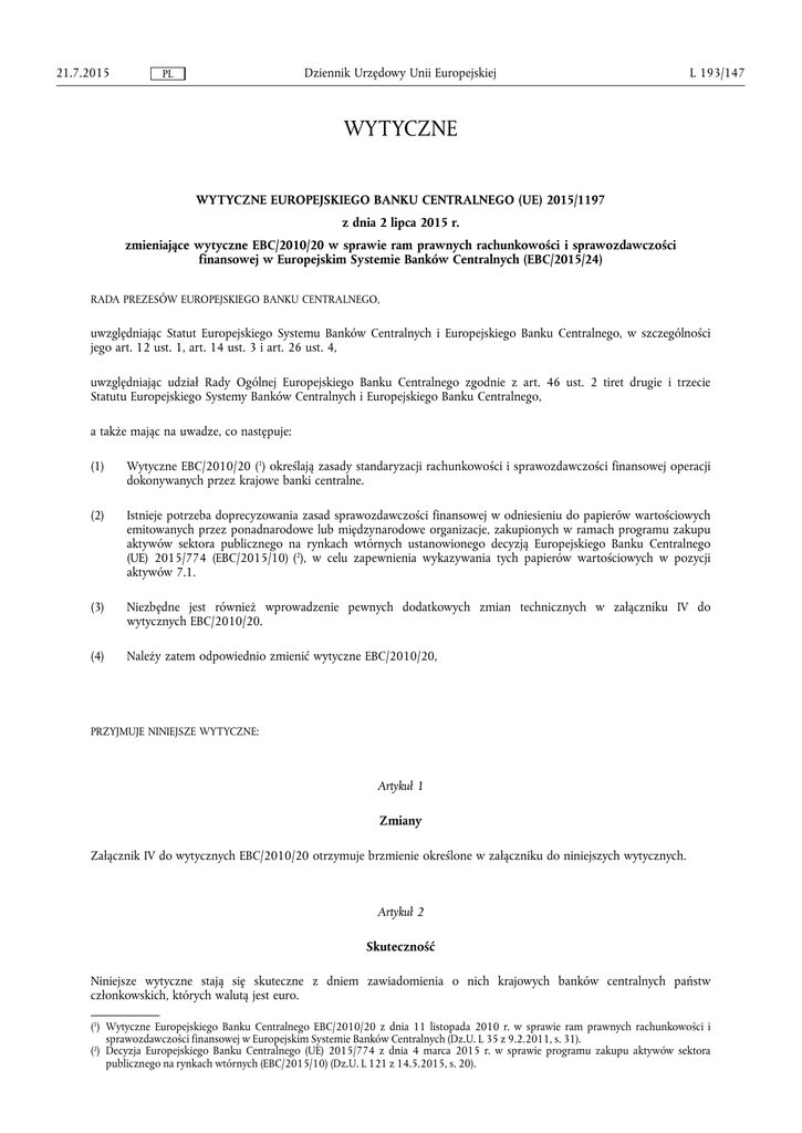 21.7.2015 Dziennik Urzędowy Unii Europejskiej PL L 193/147 WYTYCZNE WYTYCZNE EUROPEJSKIEGO BANKU CENTRALNEGO (UE) 2015/1197 z dnia 2 lipca 2015 r. zmieniające wytyczne EBC/2010/20 w sprawie ram prawnych rachunkowości i sprawozdawczości finansowej w Europejskim Systemie Banków Centralnych (EBC/2015/24) RADA PREZESÓW EUROPEJSKIEGO BANKU CENTRALNEGO, uwzględniając Statut Europejskiego Systemu Banków Centralnych i Europejskiego Banku Centralnego, w szczególności jego art. 12 ust. 1, art. 14 ust. 3 i art. 26 ust. 4, uwzględniając udział Rady Ogólnej Europejskiego Banku Centralnego zgodnie z art. 46 ust. 2 tiret drugie i trzecie Statutu Europejskiego Systemy Banków Centralnych i Europejskiego Banku Centralnego, a także mając na uwadze, co następuje: (1) Wytyczne EBC/2010/20 (1) określają zasady standaryzacji rachunkowości i sprawozdawczości finansowej operacji dokonywanych przez krajowe banki centralne. (2) Istnieje potrzeba doprecyzowania zasad sprawozdawczości finansowej w odniesieniu do papierów wartościowych emitowanych przez ponadnarodowe lub międzynarodowe organizacje, zakupionych w ramach programu zakupu aktywów sektora publicznego na rynkach wtórnych ustanowionego decyzją Europejskiego Banku Centralnego (UE) 2015/774 (EBC/2015/10) (2), w celu zapewnienia wykazywania tych papierów wartościowych w pozycji aktywów 7.1. (3) Niezbędne jest również wprowadzenie pewnych dodatkowych zmian technicznych w załączniku IV do wytycznych EBC/2010/20. (4) Należy zatem odpowiednio zmienić wytyczne EBC/2010/20, PRZYJMUJE NINIEJSZE WYTYCZNE: Artykuł 1 Zmiany Załącznik IV do wytycznych EBC/2010/20 otrzymuje brzmienie określone w załączniku do niniejszych wytycznych. Artykuł 2 Skuteczność Niniejsze wytyczne stają się skuteczne z dniem zawiadomienia o nich krajowych banków centralnych państw członkowskich, których walutą jest euro. (1) Wytyczne Europejskiego Banku Centralnego EBC/2010/20 z dnia 11 listopada 2010 r. w sprawie ram prawnych rachunkowości i sprawozdawczości finansowej w Europejskim Systemie Banków Centralnych (Dz.U. L 35 z 9.2.2011, s. 31). (2) Decyzja Europejskiego Banku Centralnego (UE) 2015/774 z dnia 4 marca 2015 r. w sprawie programu zakupu aktywów sektora publicznego na rynkach wtórnych (EBC/2015/10) (Dz.U. L 121 z 14.5.2015, s. 20). L 193/148 PL Dziennik Urzędowy Unii Europejskiej 21.7.2015 Artykuł 3 Adresaci Niniejsze wytyczne adresowane są do wszystkich banków centralnych Eurosystemu. Sporządzono we Frankfurcie nad Menem dnia 2 lipca 2015 r. W imieniu Rady Prezesów EBC Mario DRAGHI Prezes EBC 21.7.2015 PL Dziennik Urzędowy Unii Europejskiej L 193/149 ZAŁĄCZNIK „ZAŁĄCZNIK IV STRUKTURA BILANSU ORAZ ZASADY WYCENY BILANSOWEJ (1) AKTYWA Pozycja bilansu (2) Klasyfikacja składników pozycji bilansu Zasada wyceny 1 1 Złoto i należ Złoto jako kruszec, tj. sztabki, monety, Wartość rynkowa ności w złocie przedmioty pozłacane, samorodki, w skarbcu albo w transporcie do skarbca. Złoto nie w postaci kruszcu, np. salda na rachunkach złota a vista i na loka tach terminowych, należności w złocie z tytułu następujących transakcji: a) transakcje przeniesienia do wyższej/niż szej kategorii jakości; oraz b) transakcje swapowe na lokalizację lub próbę złota – jeżeli pomiędzy dniem wydania a dniem otrzymania mija co najmniej je den dzień roboczy 2 2 Należności od nierezydentów strefy euro w walutach ob cych 2.1 2.1 Zakres zastoso wania (3) Obowiązkowe Należności od kontrahentów spoza strefy euro, w tym instytucji międzyna rodowych i ponadnarodowych oraz banków centralnych spoza strefy euro, w walutach obcych Należności od a) Prawa ciągnienia w ramach transzy a) Prawa ciągnienia w ramach transzy Obowiązkowe Międzynarodo rezerwowej (netto) rezerwowej (netto) wego Funduszu Udział przypadający na dane pań Wartość nominalna; przeliczane po Walutowego stwo minus salda w euro znajdujące rynkowym kursie walutowym (MFW) się w dyspozycji MFW. Rachunek MFW nr 2 (prowadzony w euro na wydatki administracyjne) może być zaliczony do tej pozycji lub do po zycji »Zobowiązania wobec nierezy dentów strefy euro w euro« b) Specjalne prawa ciągnienia (SDR) Posiadane zasoby SDR (brutto) c) Pozostałe należności Ogólne porozumienia pożyczkowe, pożyczki udzielane na podstawie specjalnych porozumień, lokaty po wiernicze zarządzane przez MFW b) Specjalne prawa ciągnienia (SDR) Obowiązkowe Wartość nominalna; przeliczane po rynkowym kursie walutowym c) Pozostałe należności Wartość nominalna; przeliczane po rynkowym kursie walutowym Obowiązkowe L 193/150 PL Pozycja bilansu (2) 2.2 2.2 Dziennik Urzędowy Unii Europejskiej Klasyfikacja składników pozycji bilansu 21.7.2015 Zakres zastoso wania (3) Zasada wyceny Środki na ra a) Środki na rachunkach w bankach, a) Środki w bankach spoza strefy euro Obowiązkowe chunkach w spoza strefy euro, nieujęte w pozycji Wartość nominalna; przeliczane po bankach, inwes aktywów 11.3 »Inne aktywa finan rynkowym kursie walutowym tycje w papiery sowe« wartościowe, Rachunki bieżące, depozyty termi kredyty zagra nowe, depozyty jednodniowe, trans niczne i inne akcje reverse repo aktywa zagra niczne b) Inwestycje w papiery wartościowe b) (i) Rynkowe papiery wartoś Obowiązkowe poza strefą euro nieujęte w pozycji ciowe inne niż utrzymywane aktywów 11.3 »Inne aktywa finan do terminu zapadalności sowe« Cena rynkowa i rynkowy kurs Bony i obligacje, weksle, obligacje walutowy zerokuponowe, papiery rynku pie Premia/dyskonto podlegają amor niężnego, instrumenty udziałowe tyzacji. wchodzące w skład rezerw waluto wych – wszystkie wyemitowane przez nierezydentów strefy euro (ii) Rynkowe papiery wartościowe Obowiązkowe sklasyfikowane jako utrzymy wane do terminu zapadalności Koszt z uwzględnieniem utraty war tości i rynkowego kursu waluto wego Premia/dyskonto podlegają amorty zacji. (iii) Nierynkowe ciowe papiery wartoś Obowiązkowe Koszt 