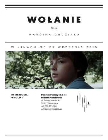 Wo ł a n i e film M a r c i n a w k i n a c h D ys tr yb u c j a w P o ls c e o d 2 5 D u d z i a k a w r z e ś n i a Dudek w Puszczy Sp. z o.o Wioleta Puszczowicz ul. Świeradowska 47 02-622 Warszawa +48 510 255 588 [email protected] 2 0 1 5 W OŁANIE Na motywach opowiadania Kazimierza Orłosia „Zimorodek” W rolach głównych Witek Kotrys Sebastian Pawlak Scenariusz i Reżyseria Marcin Dudziak Zdjęcia Tomasz Woźniczka Montaż Daniel Gąsiorowski Dźwięk Jacek Pająk Muzyka Karol Czajkowski Produkcja A Son Image Production Marcin Dudziak Koprodukcja Oko i Ucho Zespół Filmowy Piotr Kornobis POLSKA rok produkcji 2014 czas trwania 78 min kolor, 2 : 35 : 1, dolby 5 : 1 opis filmu Debiut Marcina Dudziaka na podstawie opowiadania Kazimierza Orłosia porusza, zachwyca i zostaje w pamięci. Film docenili już widzowie najważniejszych europejskich festiwali. Męska wyprawa ojca i syna w dół górskiej rzeki daje początek tej prawie pozbawionej słów historii. Nieśpieszna, poetycka opowieść o wyjątkowych chwilach w życiu dziesięcioletniego chłopca, kiedy to coś nieuchwytnego, a jednak przeczuwanego odsłania przed nim swoje znaczenie. Niepojęta dla niego samego ciekawość i pragnienie nowych doznań stają się silniejsze niż strach przed wciąż nie do końca rozpoznanym światem. Poczucie samotności i braku bezpieczeństwa, pomimo obecności ojca, staje się dla chłopca doświad czeniem zapowiadającym jego przemianę. Wszech ogarniająca przyroda, w której dominuje obraz płynącej rzeki, wnosi coraz bardziej wyczuwalne, choć trudne do uzasadnienia napięcie. Kiedy zagrożenie staje się realne i konkretne, chłopiec zdaje się być na nie przygotowany, jednak nic nie będzie już dla niego takie, jakie było przedtem. n o ta b i o g r a f i c z n a Marcin Dudziak (rocznik 1979) studiował dziennikarstwo w Warszawie, ale w 2003 roku przeniósł się na studia filmowe do Paryża. W 2009 roku założył własną firmę produkcyjną A Son Image Production, w której wyprodukował swój pierwszy krótki metraż Les Mots (Słowa). Wołanie, debiut pełnometrażowy, miał swoją premierę światową w 2014 roku w Konkursie Głównym Festiwalu Nowe Horyzonty. Film powstał na podstawie opowiadania Kazimierza Orłosia Zimorodek. Zdjęcia do następnego filmu również w oparciu o prozę tego autora zaplanowane są na jesień 2016. R e c e n z j e i f e s t i wa l e „Wołanie” (2014) Marcina Dudziaka to jeden z nielicznych polskich tytułów, który można wpisać w nurt slow cinema i który wykorzystując ten rozpoznany język kina, nie jest tylko cytatem, powtórzeniem. Reżyser pokazuje tu wyprawę ojca i syna w Bieszczady, narrację budując z medytacyjnych ujęć i naturalnego, łaskoczącego świadomość dźwięku. (...) Dudziakowi udała się tu niesamowicie trudna filmowa sztuka: budowanie napięcia. Reżyser antycypuje przewartościowanie świata, zmianę. Choć jej nie wprowadza, to „Wołanie” nie jest filmem jałowym, tylko nasycającym – przez swoją gęstość, przez sygnalizowanie tego, czego tak w kinie brakuje, czyli metafizyki. Do tego owo „Wołanie” nie jest podszyte pretensją ani wykalkulowane. Ola Salwa, miesięcznik „KINO” 8/2015 Wyprawa ojca i syna w Bieszczady, jakich nikt z nas dotąd nie widział. Uważne, wyczekujące oko kamery Tomasza Woźniczki przemienia polski krajobraz w przestrzeń niesamowitą i na poły tropikalną. W tym lesie flora i fauna żyją własnym życiem – także na niepokojącej, dopracowanej w najdrobniejszych szczegółach ścieżce dźwiękowej. „Wołanie” kryje w sobie ponadto duży ładunek wrażliwości, w nieśpieszny sposób rozgrywając cichy rodzinny dramat. Od kolejnych filmów debiutującego Marcina Dudziaka oczekuję tylko najlepszego. Sebastian Smoliński, „Kultura Liberalna” Ambitna formalnie miniatura, która wiele od widza wymaga, ale ostatecznie go wynagradza. Neil Young, „The Hollywood Reporter” Z M a r c i n e m d u dz i a k i e m r o zm a w i a O l a S a l w a Jak doszło do realizacji filmu „Wołanie”? Mieszkałem jeszcze wtedy we Francji gdzie skończyłem studia filmowe. Pomysł przyszedł z radia, a konkretnie z audycji literackiej, w której omawiane było między innymi opowiadanie Kazimierza Orłosia „Zimorodek”. Po przeczytaniu opowiadania wiedziałem, że będzie to materiał na mój debiut. Zaczęliśmy z operatorem Tomkiem Woźniczką regularnie wyjeżdżać na dokumentacje w Bieszczady. To dzięki tym wyjazdom zdecydowałem się na powrót do Polski. Od przeczytania tekstu do zdjęć minął rok. Co w wyprawie ojca i syna tak cię zainteresowało? Film opowiada o pewnym szczególnym momencie w życiu chłopca. Momencie, w którym wszystko zaczyna wyglądać inaczej; staje się głębsze, bardziej mroczne, bardziej pociągające. Momencie, w którym coś zmienia się nieodwracalnie. Coś czego chłopiec nie rozumie, ale za czym idzie. Jest to zwiastowanie czegoś co dopiero ma nastąpić – przemiany chłopca w mężczyznę. Czemu służy charakterystyczna forma filmu? Jest w nim mało dialogów, a za to jest dużo długich, powolnych ujęć obserwujących przyrodę i bohaterów? Oczyszczenie filmu z dialogów służyło przesunięciu uwagi widza w inne rejony. Bardziej zmysłowe. Natura jest trzecim bohaterem filmu. Chciałem pokazać ją jako przestrzeń wieczną, w którą ojciec i syn wchodzą, i z której wychodzą nie pozostawiając śladu. W „Wołaniu” niezwykle ważny jest też dźwięk, bo wiedziałem, że obraz nie przeniesie wszystkiego, co chcieliśmy „pokazać”. Obraz pokazuje sytuację, dźwięk buduje niepokój bohatera i atmosferę. Zapowiada też nadchodzące niebezpieczeństwo, choć nie wiadomo, jaką przybierze ono postać. Praca nad dźwiękiem i muzyką trwała 10 miesięcy. W sumie produkcja zajęła cztery lata, bo film powstawał całkowicie niezależnie, czyli za pieniądze mojej firmy produkcyjnej A Son Image Production