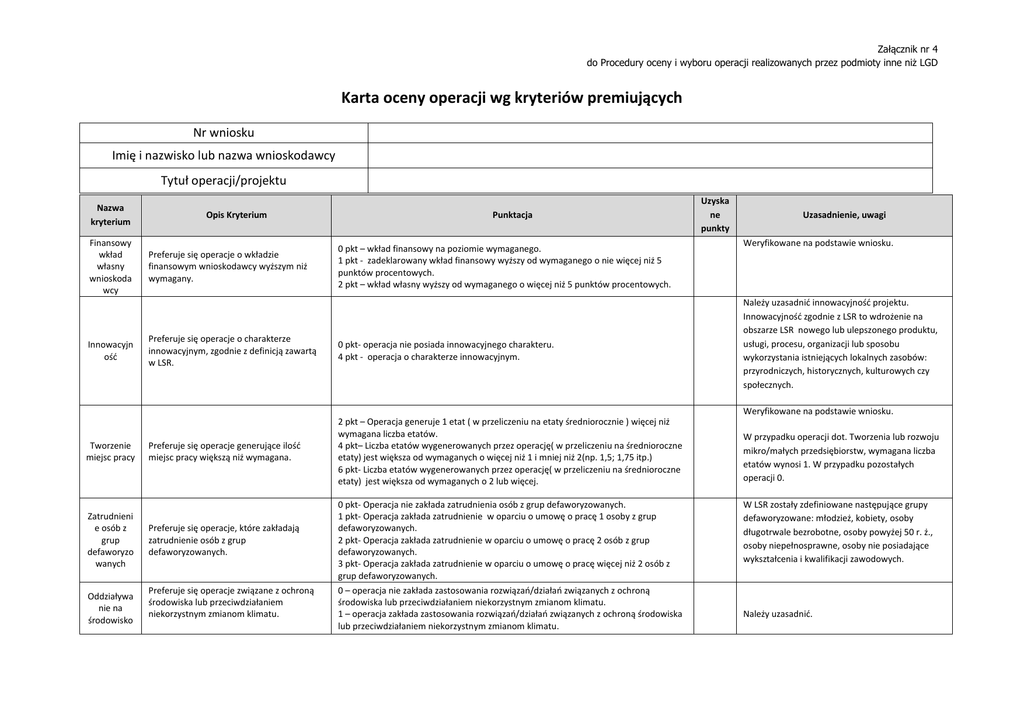 Załącznik nr 4 do Procedury oceny i wyboru operacji realizowanych przez podmioty inne niż LGD Karta oceny operacji wg kryteriów premiujących Nr wniosku Imię i nazwisko lub nazwa wnioskodawcy Tytuł operacji/projektu Nazwa kryterium Finansowy wkład własny wnioskoda wcy Innowacyjn ość Opis Kryterium Preferuje się operacje o wkładzie finansowym wnioskodawcy wyższym niż wymagany. Punktacja 0 pkt – wkład finansowy na poziomie wymaganego. 1 pkt - zadeklarowany wkład finansowy wyższy od wymaganego o nie więcej niż 5 punktów procentowych. 2 pkt – wkład własny wyższy od wymaganego o więcej niż 5 punktów procentowych. Preferuje się operacje o charakterze innowacyjnym, zgodnie z definicją zawartą w LSR. 0 pkt- operacja nie posiada innowacyjnego charakteru. 4 pkt - operacja o charakterze innowacyjnym. Preferuje się operacje generujące ilość miejsc pracy większą niż wymagana. 2 pkt – Operacja generuje 1 etat ( w przeliczeniu na etaty średniorocznie ) więcej niż wymagana liczba etatów. 4 pkt– Liczba etatów wygenerowanych przez operację( w przeliczeniu na średnioroczne etaty) jest większa od wymaganych o więcej niż 1 i mniej niż 2(np. 1,5; 1,75 itp.) 6 pkt- Liczba etatów wygenerowanych przez operację( w przeliczeniu na średnioroczne etaty) jest większa od wymaganych o 2 lub więcej. Uzyska ne punkty Uzasadnienie, uwagi Weryfikowane na podstawie wniosku. Należy uzasadnić innowacyjność projektu. Innowacyjność zgodnie z LSR to wdrożenie na obszarze LSR nowego lub ulepszonego produktu, usługi, procesu, organizacji lub sposobu wykorzystania istniejących lokalnych zasobów: przyrodniczych, historycznych, kulturowych czy społecznych. Weryfikowane na podstawie wniosku. Tworzenie miejsc pracy Zatrudnieni e osób z grup defaworyzo wanych Oddziaływa nie na środowisko Preferuje się operacje, które zakładają zatrudnienie osób z grup defaworyzowanych. Preferuje się operacje związane z ochroną środowiska lub przeciwdziałaniem niekorzystnym zmianom klimatu. 0 pkt- Operacja nie zakłada zatrudnienia osób z grup defaworyzowanych. 1 pkt- Operacja zakłada zatrudnienie w oparciu o umowę o pracę 1 osoby z grup defaworyzowanych. 2 pkt- Operacja zakłada zatrudnienie w oparciu o umowę o pracę 2 osób z grup defaworyzowanych. 3 pkt- Operacja zakłada zatrudnienie w oparciu o umowę o pracę więcej niż 2 osób z grup defaworyzowanych. 0 – operacja nie zakłada zastosowania rozwiązań/działań związanych z ochroną środowiska lub przeciwdziałaniem niekorzystnym zmianom klimatu. 1 – operacja zakłada zastosowania rozwiązań/działań związanych z ochroną środowiska lub przeciwdziałaniem niekorzystnym zmianom klimatu. W przypadku operacji dot. Tworzenia lub rozwoju mikro/małych przedsiębiorstw, wymagana liczba etatów wynosi 1. W przypadku pozostałych operacji 0. W LSR zostały zdefiniowane następujące grupy defaworyzowane: młodzież, kobiety, osoby długotrwale bezrobotne, osoby powyżej 50 r. ż., osoby niepełnosprawne, osoby nie posiadające wykształcenia i kwalifikacji zawodowych. Należy uzasadnić. Załącznik nr 4 do Procedury oceny i wyboru operacji realizowanych przez podmioty inne niż LGD Preferowan e typy operacji Aktywizacja i integracja osób z grup defaworyz wanych Preferuje się operacje z zakresu: kultury, turystyki, rekreacji, promocji obszaru lub zachowania dziedzictwa lokalnego. Preferuje się operacje aktywizujące lub integrujące osoby z grup defaworyzowanych ze społecznością lokalną. 0 pkt- operacja nie dotyczy wymienionego zakresu, 3 pkt- operacja dotyczy przynajmniej jednego z wymienionych zakresów 0 pkt- wśród osób zaangażowanych w realizację operacji nie ma osób należących do grup defaworyzowanych. 4 pkt- operacja zakłada aktywizację lub integrację osób z grup defaworyzwanych. Promocja produktów lokalnych Preferuje się operacje wykorzystujące lub promujące lokalne produkty. 0 pkt- operacja nie wykorzystuje lub nie promuje produktów lokalnych. 4 pkt- operacja bazuje na produktach lokalnych lub dotyczy ich promocji. Promocja dziedzictwa Św. Jana Pawła II Preferuje się operacje związane z dziedzictwem i postacią Św. Jana Pawła II. 0 pkt- Operacja nie nawiązuje do dziedzictwa Św. Jana Pawła II 2 pkt- Operacja wykorzystuje lub promuje dziedzictwo Św. Jana Pawła II. Należy wskazać którego z zakresów operacja dotyczy. Poprzez aktywizację i integrację osób z grup de faworyzowanych rozumieć należy organizację warsztatów/szkoleń lub innych wydarzeń, które będą skierowane do społeczności lokalnej, w tym do osób z grup defaworyzowanych. Punkty można przyznać, jeśli wnioskodawca wskazał w jaki sposób zamierza dotrzeć do osób z grup defaworyzowanych i zaangażować je w realizację operacji. Produkt lokalny to najczęściej wyrób lub usługa, z którą utożsamiają się mieszkańcy regionu. Jest on produkowany w sposób nieprzemysłowy, niemasowy, z surowców lokalnych lub przy użyciu lokalnych metod wytwarzania, to zarówno produkt spożywczy, jak i rękodzieło oraz usługi oparte o lokalne dziedzictwo (warsztaty rękodzielnicze, kulturalne, przewodnicy itp.). Należy uzasadnić. Podniesieni e kompetencj i Preferuje się operacje, których elementem będzie podniesienie kompetencji. 0 pkt- operacja nie podniesie kompetencji. 2 pkt- w wyniku realizacji operacji podniesione zostaną kompetencje. Miejsce realizacji operacji Preferuje się operacje realizowane w miejscowościach zamieszkałych przez mniej niż 5 tys. mieszkańców. 0 pkt- Operacja realizowana w miejscowości zamieszkałej przez 5 tys. mieszkańców lub więcej. 1 pkt- Operacja realizowana w miejscowości zamieszkałych przez mniej niż 5 tys. mieszkańców. Maksymalna ilość pkt- 32; Ilość zdobytych punktów: …...... Podniesienie kompetencji może odbyć się poprzez udział w zorganizowanym szkoleniu, warsztatach lub innych działaniach o charakterze edukacyjnym dla pracownik