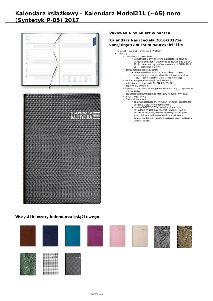 Kalendarz książkowy - Kalendarz Model21L (~A5) nero (Syntetyk P-05) 2017 Pakowania po 60 szt w paczce Kalendarz Nauczyciela 2016/2017ze specjalnym aneksem nauczycielskim format bloku: 14,5 x 20,5 cm; 144 strony; struktura: kalendarium (114 stron) układ tygodniowy ze stroną na notatki, rozkład od września do grudnia 2016 oraz od stycznia do sierpnia 2017, planer roczny, skrócone kalendaria 2016, 2017, 2018, kalendarz wieczny; aneks nauczycielski (30 stron) tabele organizacyjne (terminy roku szkolnego, konferencje i zebrania, plan lekcji, fi nanse, dyżury, klasy - oceny, notatnik w linie oraz w kratkę); druk szaro-granatowy; registry drukowane; kalendarium w językach: PL, EN, DE, FR, RU; papier biały 80 g/m2; oprawa szyta i klejona; wstążka w kolorze szarym; kapitałka w kolorze białym; bez stopki wydawniczej; kod kreskowy na tylnej wyklejce; waga 1 egz.: 295 g. Dwa rodzaje opraw: oprawa skóropodobna VIVELLA - miękka i aksamitna; tłoczenie z efektem przebarwienia; oprawa SYNTETYCZNA (okładka z kieszonką, nakładana na blok kalendarza) - wysokiej jakości tworzywo sztuczne, nadruk tekstowy; silver, gold, eden - faktura szlifowanej stali z metalicznym połyskiem; bianko - gładka i matowa; nero - matowa w wypukłe kropki. Wszystkie wzory kalendarza książkowego Strona 1/1 Powered by TCPDF (www.tcpdf.org)