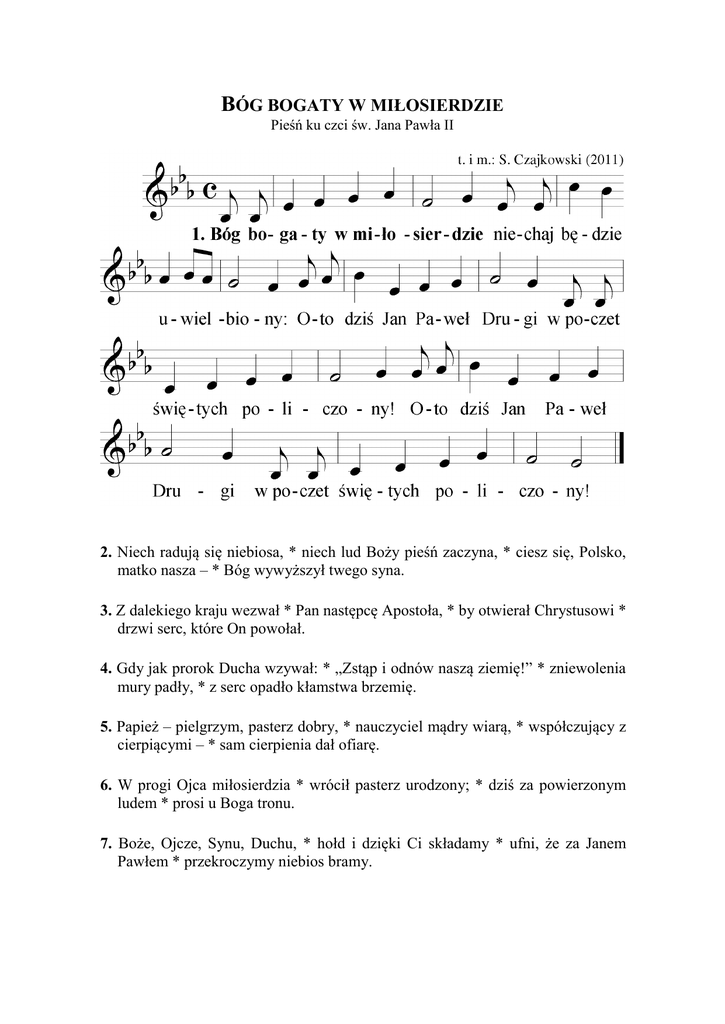 BÓG BOGATY W MIŁOSIERDZIE Pieśń ku czci św. Jana Pawła II 2. Niech radują się niebiosa, * niech lud Boży pieśń zaczyna, * ciesz się, Polsko, matko nasza – * Bóg wywyższył twego syna. 3. Z dalekiego kraju wezwał * Pan następcę Apostoła, * by otwierał Chrystusowi * drzwi serc, które On powołał. 4. Gdy jak prorok Ducha wzywał: * „Zstąp i odnów naszą ziemię!” * zniewolenia mury padły, * z serc opadło kłamstwa brzemię. 5. Papież – pielgrzym, pasterz dobry, * nauczyciel mądry wiarą, * współczujący z cierpiącymi – * sam cierpienia dał ofiarę. 6. W progi Ojca miłosierdzia * wrócił pasterz urodzony; * dziś za powierzonym ludem * prosi u Boga tronu. 7. Boże, Ojcze, Synu, Duchu, * hołd i dzięki Ci składamy * ufni, że za Janem Pawłem * przekroczymy niebios bramy.