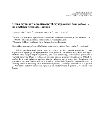 JOURNAL OF WATER AND LAND DEVELOPMENT J. Water Land Dev. No. 15, 2011: 91–98 Ocena czynników ograniczających występowanie Rosa gallica L. na użytkach zielonych Rumunii Veronica SĂRĂŢEANU1), Alexandru MOISUC1), Doru G. LAIEȘ2) 1) Banat’s University of Agricultural Sciences and Veterinary Medicine, Calea Aradului 119, 300645 Timişoara, Romania; e-mail: [email protected] 2) Bardeau Holding, Grădinari, Caraș-Severin County, Romania Słowa kluczowe: nawożenie, skład florystyczny, użytek zielony, Rosa gallica L., roślinność Celem przedstawionej pracy było wykazanie, w jaki sposób nawożenie i czas użytkowania wpływają na występowanie Rosa gallica L. na badanych użytkach zielonych. Badano także wpływ innych czynników, jak: skład botaniczny, różnorodność gatunkowa i wartość pastewna. Dane o roślinności zbierano metodą punktowo-kwadratową. Udział R. gallica L. w runi badanego trwałego użytku zielonego był w miarę stały. Dominującymi gatunkami były tam Festuca valesiaca Schleich. ex Gaudin i Filipendula vulgaris Moench., a znaczny udział w runi miały także Achillea millefolium L., Plantago lanceolata L. i R. gallica L. Nawożenie i zbiór biomasy nie wpływały na występowanie R. gallica L. w czasie 6 lat badań.