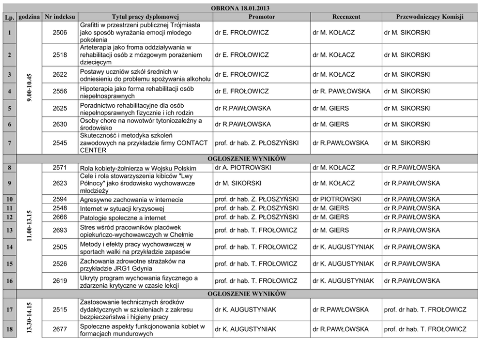 OBRONA 18.01.2013 Lp. godzina Nr indeksu Tytuł pracy