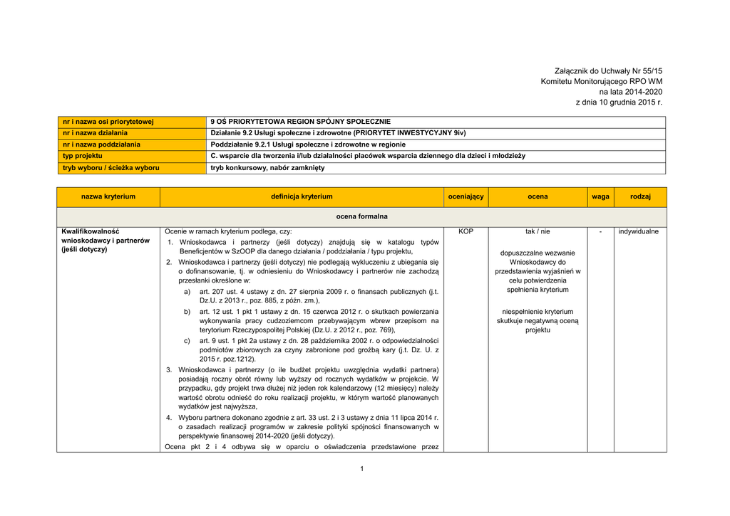 Załącznik do Uchwały Nr 55/15 Komitetu Monitorującego RPO WM na lata 2014-2020 z dnia 10 grudnia 2015 r. nr i nazwa osi priorytetowej 9 OŚ PRIORYTETOWA REGION SPÓJNY SPOŁECZNIE nr i nazwa działania Działanie 9.2 Usługi społeczne i zdrowotne (PRIORYTET INWESTYCYJNY 9iv) nr i nazwa poddziałania Poddziałanie 9.2.1 Usługi społeczne i zdrowotne w regionie typ projektu C. wsparcie dla tworzenia i/lub działalności placówek wsparcia dziennego dla dzieci i młodzieży tryb wyboru / ścieżka wyboru tryb konkursowy, nabór zamknięty nazwa kryterium definicja kryterium oceniający ocena waga rodzaj KOP tak / nie - indywidualne ocena formalna Kwalifikowalność wnioskodawcy i partnerów (jeśli dotyczy) Ocenie w ramach kryterium podlega, czy: 1. Wnioskodawca i partnerzy (jeśli dotyczy) znajdują się w katalogu typów Beneficjentów w SzOOP dla danego działania / poddziałania / typu projektu, 2. Wnioskodawca i partnerzy (jeśli dotyczy) nie podlegają wykluczeniu z ubiegania się o dofinansowanie, tj. w odniesieniu do Wnioskodawcy i partnerów nie zachodzą przesłanki określone w: a) art. 207 ust. 4 ustawy z dn. 27 sierpnia 2009 r. o finansach publicznych (j.t. Dz.U. z 2013 r., poz. 885, z późn. zm.), b) art. 12 ust. 1 pkt 1 ustawy z dn. 15 czerwca 2012 r. o skutkach powierzania wykonywania pracy cudzoziemcom przebywającym wbrew przepisom na terytorium Rzeczypospolitej Polskiej (Dz.U. z 2012 r., poz. 769), c) art. 9 ust. 1 pkt 2a ustawy z dn. 28 października 2002 r. o odpowiedzialności podmiotów zbiorowych za czyny zabronione pod groźbą kary (j.t. Dz. U. z 2015 r. poz.1212). 3. Wnioskodawca i partnerzy (o ile budżet projektu uwzględnia wydatki partnera) posiadają roczny obrót równy lub wyższy od rocznych wydatków w projekcie. W przypadku, gdy projekt trwa dłużej niż jeden rok kalendarzowy (12 miesięcy) należy wartość obrotu odnieść do roku realizacji projektu, w którym wartość planowanych wydatków jest najwyższa, 4. Wyboru partnera dokonano zgodnie z art. 33 ust. 2 i 3 ustawy z dnia 11 lipca 2014 r. o zasadach realizacji programów w zakresie polityki spójności finansowanych w perspektywie finansowej 2014-2020 (jeśli dotyczy). Ocena pkt 2 i 4 odbywa się w oparciu o oświadczenia przedstawione przez 1 dopuszczalne wezwanie Wnioskodawcy do przedstawienia wyjaśnień w celu potwierdzenia spełnienia kryterium niespełnienie kryterium skutkuje negatywną oceną projektu Wnioskodawcę. Kwalifikowalność projektu Ocenie w ramach kryterium podlega, czy: KOP 1. projekt wpisuje się w typy projektów wskazane dla danego działania / poddziałania, zgodnie z SzOOP i regulaminem konkursu, 2. Wnioskodawca w okresie realizacji projektu prowadzi biuro projektu (lub posiada siedzibę, filię, delegaturę oddział czy inną formę działalności) na terenie województwa małopolskiego z możliwością udostępnienia pełnej dokumentacji wdrażanego projektu oraz zapewnia uczestnikom projektu możliwość osobistego kontaktu z kadrą projektu, 3. projekt jest zgodny z przepisami art. 65 ust. 6 i art. 125 ust. 3 lit. e) i f) Rozporządzenia Parlamentu Europejskiego i Rady (UE) nr 1303/2013 z dn. 17 grudnia 2013 r. tj. Wnioskodawca złożył oświadczenie, że: tak / nie - indywidualne - indywidualne dopuszczalne wezwanie Wnioskodawcy do przedstawienia wyjaśnień w celu potwierdzenia spełnienia kryterium niespełnienie kryterium skutkuje negatywną oceną projektu projekt nie został zakończony w rozumieniu art. 65 ust. 6, nie rozpoczął realizacji projektu przed dniem złożenia wniosku o dofinansowanie albo że realizując projekt przed dniem złożenia wniosku, przestrzegał obowiązujących przepisów prawa dotyczących danej operacji (art. 125 ust. 3 lit. e), projekt nie obejmuje przedsięwzięć będących częścią operacji, które zostały objęte lub powinny były zostać objęte procedurą odzyskiwania zgodnie z art. 71 (trwałość operacji) w następstwie przeniesienia działalności produkcyjnej poza obszar objęty programem, 4. projekt (lub jego część) nie otrzymał dofinansowania z innych środków, 5. okres realizacji projektu jest zgodny z wymaganiami określonymi w regulaminie konkursu, 6. grupa docelowa jest zgodna z zapisami SzOOP oraz Podręcznikiem kwalifikowania wydatków objętych dofinansowaniem w ramach Regionalnego Programu Operacyjnego Województwa Małopolskiego na lata 2014-2020 oraz regulaminem konkursu. Ocena pkt 3 i 4 odbywa się w oparciu o oświadczenia przedstawione przez Wnioskodawcę. Poprawność wypełnienia wniosku i załączników W ramach kryterium ocenie podlega: KOP 1. czy wypełniono wszystkie wymagane pola wniosku, 2. czy zostały przedstawione wszystkie wymagane załączniki (jeśli dotyczy), 3. czy załączniki zostały przygotowane zgodnie z instrukcją (jeśli dotyczy). tak / nie dopuszczalne wezwanie Wnioskodawcy do przedstawienia wyjaśnień w celu potwierdzenia spełnienia kryterium niespełnienie kryterium skutkuje negatywną oceną 2 projektu ocena merytoryczna Specyficzne warunki wstępne W ramach kryterium ocenie podlega: KOP 1. czy projekt jest zgodny ze specyficznymi warunkami dotyczącymi danego działania / poddziałania / typu projektu określonymi w SzOOP, Weryfikacja projektu w ramach kryterium uwzględnia ocenę pod kątem występowania pomocy publicznej / pomocy de minimis na gruncie obowiązujących rozporządzeń. W ramach kryterium ocenie podlega: - indywidualne - indywidualne - indywidualne - indywidualne dopuszczalne wezwanie Wnioskodawcy do przedstawienia wyjaśnień w celu potwierdzenia spełnienia kryterium 2. poprawność merytoryczna wypełnienia wniosku o dofinansowanie pod kątem zgodności z warunkami określonymi w regulaminie konkursu na podstawie w szczególności wytycznych horyzontalnych Ministra Infrastruktury i Rozwoju tj. Wytycznych w zakresie realizacji przedsięwzięć w obszarze włączenia społecznego i zwalczania ubóstwa z wykorzystaniem środków Europejskieg