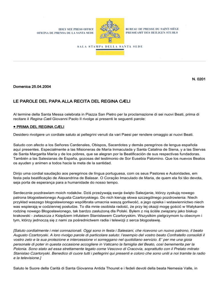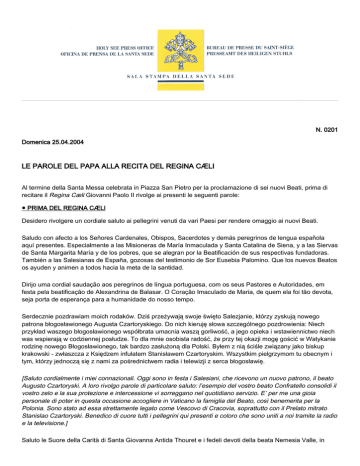 N. 0201 Domenica 25.04.2004 LE PAROLE DEL PAPA ALLA RECITA DEL REGINA CÆLI Al termine della Santa Messa celebrata in Piazza San Pietro per la proclamazione di sei nuovi Beati, prima di recitare il Regina Cæli Giovanni Paolo II rivolge ai presenti le seguenti parole: ● PRIMA DEL REGINA CÆLI Desidero rivolgere un cordiale saluto ai pellegrini venuti da vari Paesi per rendere omaggio ai nuovi Beati. Saludo con afecto a los Señores Cardenales, Obispos, Sacerdotes y demás peregrinos de lengua española aquí presentes. Especialmente a las Misioneras de María Inmaculada y Santa Catalina de Siena, y a las Siervas de Santa Margarita María y de los pobres, que se alegran por la Beatificación de sus respectivas fundadoras. También a las Salesianas de España, gozosas del testimonio de Sor Eusebia Palomino. Que los nuevos Beatos os ayuden y animen a todos hacia la meta de la santidad. Dirijo uma cordial saudação aos peregrinos de língua portuguesa, com os seus Pastores e Autoridades, em festa pela beatificação de Alexandrina de Balasar. O Coração Imaculado de Maria, de quem ela foi tão devota, seja porta de esperança para a humanidade do nosso tempo. Serdecznie pozdrawiam moich rodaków. Dziś przeżywają swoje święto Salezjanie, którzy zyskują nowego patrona błogosławionego Augusta Czartoryskiego. Do nich kieruję słowa szczególnego pozdrowienia: Niech przykład waszego błogosławionego współbrata umacnia waszą gorliwość, a jego opieka i wstawiennictwo niech was wspierają w codziennej posłudze. To dla mnie osobista radość, że przy tej okazji mogę gościć w Watykanie rodzinę nowego Błogosławionego, tak bardzo zasłużoną dla Polski. Byłem z nią ściśle związany jako biskup krakowski - zwłaszcza z Księdzem infułatem Stanisławem Czartoryskim. Wszystkim pielgrzymom tu obecnym i tym, którzy jednoczą się z nami za pośrednictwem radia i telewizji z serca błogosławię. [Saluto cordialmente i miei connazionali. Oggi sono in festa i Salesiani, che ricevono un nuovo patrono, il beato Augusto Czartoryski. A loro rivolgo parole di particolare saluto: l’esempio del vostro beato Confratello consolidi il vostro zelo e la sua protezione e intercessione vi sorreggano nel quotidiano servizio. E’ per me una gioia personale di poter in questa occasione accogliere in Vaticano la famiglia del Beato, così benemerita per la Polonia. Sono stato ad essa strettamente legato come Vescovo di Cracovia, soprattutto con il Prelato mitrato Stanislao Czartoryski. Benedico di cuore tutti i pellegrini qui presenti e coloro che sono uniti a noi tramite la radio e la televisione.] Saluto le Suore della Carità di Santa Giovanna Antida Thouret e i fedeli devoti della beata Nemesia Valle, in 2 particolare quelli provenienti dall’Arcidiocesi di Torino. Ciascuno dei nuovi Beati ha nutrito una filiale e profonda devozione verso Maria Santissima. Con pari fiducia, anche noi ci rivolgiamo a Lei, implorando che la famiglia umana possa trovare le vie della giustizia e della pace. [00625-XX.02] [Testo originale: Plurilingue] [B201-XX.01]