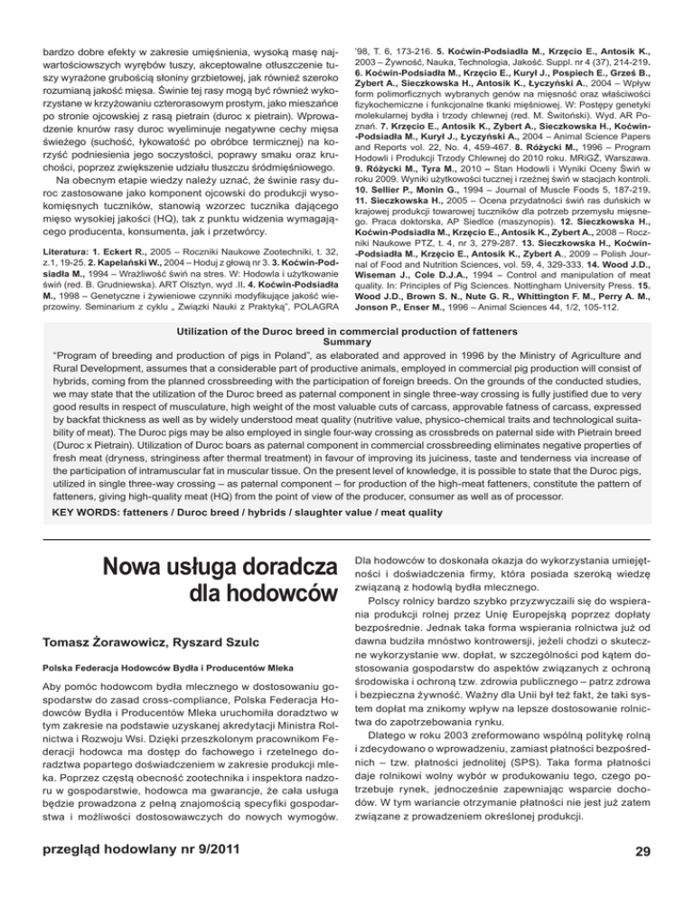 bardzo dobre efekty w zakresie umięśnienia, wysoką masę najwartościowszych wyrębów tuszy, akceptowalne otłuszczenie tuszy wyrażone grubością słoniny grzbietowej, jak również szeroko rozumianą jakość mięsa. Świnie tej rasy mogą być również wykorzystane w krzyżowaniu czterorasowym prostym, jako mieszańce po stronie ojcowskiej z rasą pietrain (duroc x pietrain). Wprowadzenie knurów rasy duroc wyeliminuje negatywne cechy mięsa świeżego (suchość, łykowatość po obróbce termicznej) na korzyść podniesienia jego soczystości, poprawy smaku oraz kruchości, poprzez zwiększenie udziału tłuszczu śródmięśniowego. Na obecnym etapie wiedzy należy uznać, że świnie rasy duroc zastosowane jako komponent ojcowski do produkcji wysokomięsnych tuczników, stanowią wzorzec tucznika dającego mięso wysokiej jakości (HQ), tak z punktu widzenia wymagającego producenta, konsumenta, jak i przetwórcy. Literatura: 1. Eckert R., 2005 – Roczniki Naukowe Zootechniki, t. 32, z.1, 19-25. 2. Kapelański W., 2004 – Hoduj z głową nr 3. 3. Koćwin-Podsiadła M., 1994 – Wrażliwość świń na stres. W: Hodowla i użytkowanie świń (red. B. Grudniewska). ART Olsztyn, wyd .II. 4. Koćwin-Podsiadła M., 1998 – Genetyczne i żywieniowe czynniki modyfikujące jakość wieprzowiny. Seminarium z cyklu „ Związki Nauki z Praktyką”, POLAGRA ’98, T. 6, 173-216. 5. Koćwin-Podsiadła M., Krzęcio E., Antosik K., 2003 – Żywność, Nauka, Technologia, Jakość. Suppl. nr 4 (37), 214-219. 6. Koćwin-Podsiadła M., Krzęcio E., Kurył J., Pospiech E., Grześ B., Zybert A., Sieczkowska H., Antosik K., Łyczyński A., 2004 – Wpływ form polimorficznych wybranych genów na mięsność oraz właściwości fizykochemiczne i funkcjonalne tkanki mięśniowej. W: Postępy genetyki molekularnej bydła i trzody chlewnej (red. M. Świtoński). Wyd. AR Poznań. 7. Krzęcio E., Antosik K., Zybert A., Sieczkowska H., Koćwin-Podsiadła M., Kurył J., Łyczyński A., 2004 – Animal Science Papers and Reports vol. 22, No. 4, 459-467. 8. Różycki M., 1996 – Program Hodowli i Produkcji Trzody Chlewnej do 2010 roku. MRiGŻ, Warszawa. 9. Różycki M., Tyra M., 2010 – Stan Hodowli i Wyniki Oceny Świń w roku 2009. Wyniki użytkowości tucznej i rzeźnej świń w stacjach kontroli. 10. Sellier P., Monin G., 1994 – Journal of Muscle Foods 5, 187-219. 11. Sieczkowska H., 2005 – Ocena przydatności świń ras duńskich w krajowej produkcji towarowej tuczników dla potrzeb przemysłu mięsnego. Praca doktorska, AP Siedlce (maszynopis). 12. Sieczkowska H., Koćwin-Podsiadła M., Krzęcio E., Antosik K., Zybert A., 2008 – Roczniki Naukowe PTZ, t. 4, nr 3, 279-287. 13. Sieczkowska H., Koćwin-Podsiadła M., Krzęcio E., Antosik K., Zybert A., 2009 – Polish Journal of Food and Nutrition Sciences, vol. 59, 4, 329-333. 14. Wood J.D., Wiseman J., Cole D.J.A., 1994 – Control and manipulation of meat quality. In: Principles of Pig Sciences. Nottingham University Press. 15. Wood J.D., Brown S. N., Nute G. R., Whittington F. M., Perry A. M., Jonson P., Enser M., 1996 – Animal Sciences 44, 1/2, 105-112. Utilization of the Duroc breed in commercial production of fatteners Summary “Program of breeding and production of pigs in Poland”, as elaborated and approved in 1996 by the Ministry of Agriculture and Rural Development, assumes that a considerable part of productive animals, employed in commercial pig production will consist of hybrids, coming from the planned crossbreeding with the participation of foreign breeds. On the grounds of the conducted studies, we may state that the utilization of the Duroc breed as paternal component in single three-way crossing is fully justified due to very good results in respect of musculature, high weight of the most valuable cuts of carcass, approvable fatness of carcass, expressed by backfat thickness as well as by widely understood meat quality (nutritive value, physico-chemical traits and technological suitability of meat). The Duroc pigs may be also employed in single four-way crossing as crossbreds on paternal side with Pietrain breed (Duroc x Pietrain). Utilization of Duroc boars as paternal component in commercial crossbreeding eliminates negative properties of fresh meat (dryness, stringiness after thermal treatment) in favour of improving its juiciness, taste and tenderness via increase of the participation of intramuscular fat in muscular tissue. On the present level of knowledge, it is possible to state that the Duroc pigs, utilized in single three-way crossing – as paternal component – for production of the high-meat fatteners, constitute the pattern of fatteners, giving high-quality meat (HQ) from the point of view of the producer, consumer as well as of processor. KEY WORDS: fatteners / Duroc breed / hybrids / slaughter value / meat quality Nowa usługa doradcza dla hodowców Tomasz Żorawowicz, Ryszard Szulc Polska Federacja Hodowców Bydła i Producentów Mleka Aby pomóc hodowcom bydła mlecznego w dostosowaniu gospodarstw do zasad cross-compliance, Polska Federacja Hodowców Bydła i Producentów Mleka uruchomiła doradztwo w tym zakresie na podstawie uzyskanej akredytacji Ministra Rolnictwa i Rozwoju Wsi. Dzięki przeszkolonym pracownikom Federacji hodowca ma dostęp do fachowego i rzetelnego doradztwa popartego doświadczeniem w zakresie produkcji mleka. Poprzez częstą obecność zootechnika i inspektora nadzoru w gospodarstwie, hodowca ma gwarancje, że cała usługa będzie prowadzona z pełną znajomością specyfiki gospodarstwa i możliwości dostosowawczych do nowych wymogów. przegląd hodowlany nr 9/2011 Dla hodowców to doskonała okazja do wykorzystania umiejętności i doświadczenia firmy, która posiada szeroką wiedzę związaną z hodowlą bydła mlecznego. Polscy rolnicy bardzo szybko przyzwyczaili się do wspierania produkcji rolnej przez Unię Europejską poprzez dopłaty bezpośrednie. Jednak taka f