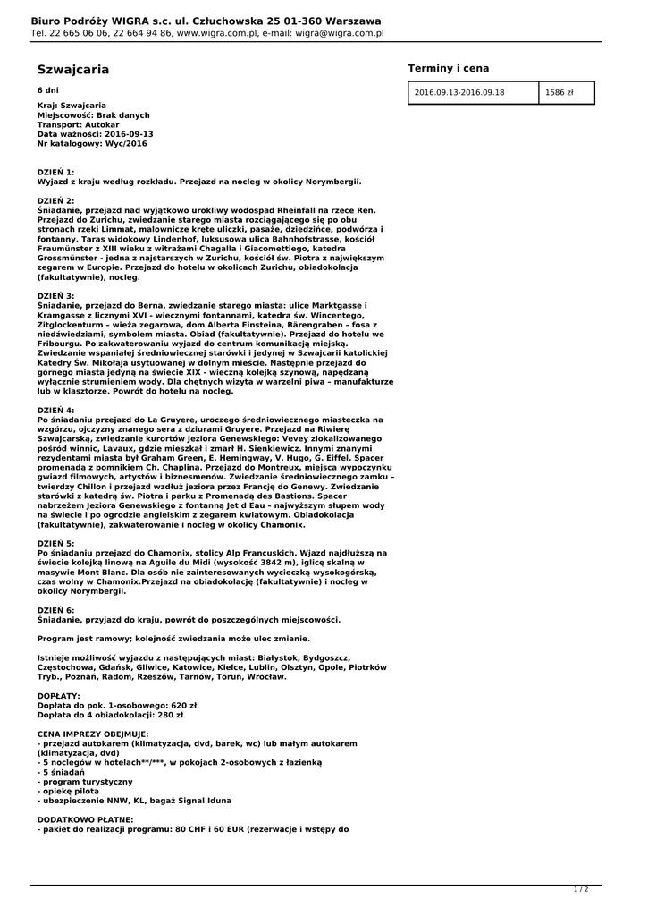Biuro Podróży WIGRA s.c. ul. Człuchowska 25 01-360 Warszawa Tel. 22 665 06 06, 22 664 94 86, www.wigra.com.pl, e-mail: [email protected] Szwajcaria 6 dni Terminy i cena 2016.09.13-2016.09.18 1586 zł Kraj: Szwajcaria Miejscowość: Brak danych Transport: Autokar Data ważności: 2016-09-13 Nr katalogowy: Wyc/2016 DZIEŃ 1: Wyjazd z kraju według rozkładu. Przejazd na nocleg w okolicy Norymbergii. DZIEŃ 2: Śniadanie, przejazd nad wyjątkowo urokliwy wodospad Rheinfall na rzece Ren. Przejazd do Zurichu, zwiedzanie starego miasta rozciągającego się po obu stronach rzeki Limmat, malownicze kręte uliczki, pasaże, dziedzińce, podwórza i fontanny. Taras widokowy Lindenhof, luksusowa ulica Bahnhofstrasse, kościół Fraumünster z XIII wieku z witrażami Chagalla i Giacomettiego, katedra Grossmünster - jedna z najstarszych w Zurichu, kościół św. Piotra z największym zegarem w Europie. Przejazd do hotelu w okolicach Zurichu, obiadokolacja (fakultatywnie), nocleg. DZIEŃ 3: Śniadanie, przejazd do Berna, zwiedzanie starego miasta: ulice Marktgasse i Kramgasse z licznymi XVI - wiecznymi fontannami, katedra św. Wincentego, Zitglockenturm – wieża zegarowa, dom Alberta Einsteina, Bärengraben – fosa z niedźwiedziami, symbolem miasta. Obiad (fakultatywnie). Przejazd do hotelu we Fribourgu. Po zakwaterowaniu wyjazd do centrum komunikacją miejską. Zwiedzanie wspaniałej średniowiecznej starówki i jedynej w Szwajcarii katolickiej Katedry Św. Mikołaja usytuowanej w dolnym mieście. Następnie przejazd do górnego miasta jedyną na świecie XIX - wieczną kolejką szynową, napędzaną wyłącznie strumieniem wody. Dla chętnych wizyta w warzelni piwa – manufakturze lub w klasztorze. Powrót do hotelu na nocleg. DZIEŃ 4: Po śniadaniu przejazd do La Gruyere, uroczego średniowiecznego miasteczka na wzgórzu, ojczyzny znanego sera z dziurami Gruyere. Przejazd na Riwierę Szwajcarską, zwiedzanie kurortów Jeziora Genewskiego: Vevey zlokalizowanego pośród winnic, Lavaux, gdzie mieszkał i zmarł H. Sienkiewicz. Innymi znanymi rezydentami miasta był Graham Green, E. Hemingway, V. Hugo, G. Eiffel. Spacer promenadą z pomnikiem Ch. Chaplina. Przejazd do Montreux, miejsca wypoczynku gwiazd filmowych, artystów i biznesmenów. Zwiedzanie średniowiecznego zamku – twierdzy Chillon i przejazd wzdłuż jeziora przez Francję do Genewy. Zwiedzanie starówki z katedrą św. Piotra i parku z Promenadą des Bastions. Spacer nabrzeżem Jeziora Genewskiego z fontanną Jet d Eau – najwyższym słupem wody na świecie i po ogrodzie angielskim z zegarem kwiatowym. Obiadokolacja (fakultatywnie), zakwaterowanie i nocleg w okolicy Chamonix. DZIEŃ 5: Po śniadaniu przejazd do Chamonix, stolicy Alp Francuskich. Wjazd najdłuższą na świecie kolejką linową na Aguile du Midi (wysokość 3842 m), iglicę skalną w masywie Mont Blanc. Dla osób nie zainteresowanych wycieczką wysokogórską, czas wolny w Chamonix.Przejazd na obiadokolację (fakultatywnie) i nocleg w okolicy Norymbergii. DZIEŃ 6: Śniadanie, przyjazd do kraju, powrót do poszczególnych miejscowości. Program jest ramowy; kolejność zwiedzania może ulec zmianie. Istnieje możliwość wyjazdu z następujących miast: Białystok, Bydgoszcz, Częstochowa, Gdańsk, Gliwice, Katowice, Kielce, Lublin, Olsztyn, Opole, Piotrków Tryb., Poznań, Radom, Rzeszów, Tarnów, Toruń, Wrocław. DOPŁATY: Dopłata do pok. 1-osobowego: 620 zł Dopłata do 4 obiadokolacji: 280 zł CENA IMPREZY OBEJMUJE: - przejazd autokarem (klimatyzacja, dvd, barek, wc) lub małym autokarem (klimatyzacja, dvd) - 5 noclegów w hotelach**/***, w pokojach 2-osobowych z łazienką - 5 śniadań - program turystyczny - opiekę pilota - ubezpieczenie NNW, KL, bagaż Signal Iduna DODATKOWO PŁATNE: - pakiet do realizacji programu: 80 CHF i 60 EUR (rezerwacje i wstępy do 1/2 Biuro Podróży WIGRA s.c. ul. Człuchowska 25 01-360 Warszawa Tel. 22 665 06 06, 22 664 94 86, www.wigra.com.pl, e-mail: [email protected] zwiedzanych obiektów, bilety komunikacji miejskiej, kolejka we Fribourgu i na Aguille du Midi w Chamonix, zestaw słuchawkowy Tour Guide(, płatny obligatoryjnie pilotowi wycieczki. 2/2 Powered by TCPDF (www.tcpdf.org)