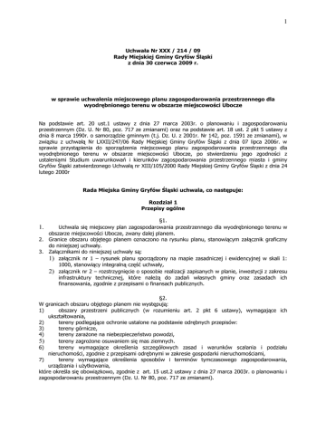 1 Uchwała Nr XXX / 214 / 09 Rady Miejskiej Gminy Gryfów Śląski z dnia 30 czerwca 2009 r. w sprawie uchwalenia miejscowego planu zagospodarowania przestrzennego dla wyodrębnionego terenu w obszarze miejscowości Ubocze Na podstawie art. 20 ust.1 ustawy z dnia 27 marca 2003r. o planowaniu i zagospodarowaniu przestrzennym (Dz. U. Nr 80, poz. 717 ze zmianami) oraz na podstawie art. 18 ust. 2 pkt 5 ustawy z dnia 8 marca 1990r. o samorządzie gminnym (t.j. Dz. U. z 2001r. Nr 142, poz. 1591 ze zmianami), w związku z uchwałą Nr LXXII/247/06 Rady Miejskiej Gminy Gryfów Śląski z dnia 07 lipca 2006r. w sprawie przystąpienia do sporządzenia miejscowego planu zagospodarowania przestrzennego dla wyodrębnionego terenu w obszarze miejscowości Ubocze, po stwierdzeniu jego zgodności z ustaleniami Studium uwarunkowań i kierunków zagospodarowania przestrzennego miasta i gminy Gryfów Śląski zatwierdzonego Uchwałą nr XIII/105/2000 Rady Miejskiej Gminy Gryfów Śląski z dnia 24 lutego 2000r Rada Miejska Gminy Gryfów Śląski uchwala, co następuje: Rozdział 1 Przepisy ogólne §1. 1. Uchwala się miejscowy plan zagospodarowania przestrzennego dla wyodrębnionego terenu w obszarze miejscowości Ubocze, zwany dalej planem. 2. Granice obszaru objętego planem oznaczono na rysunku planu, stanowiącym załącznik graficzny do niniejszej uchwały. 3. Załącznikami do niniejszej uchwały są: 1) załącznik nr 1 – rysunek planu sporządzony na mapie zasadniczej i ewidencyjnej w skali 1: 1000, stanowiący integralną część uchwały, 2) załącznik nr 2 – rozstrzygnięcie o sposobie realizacji zapisanych w planie, inwestycji z zakresu infrastruktury technicznej, które należą do zadań własnych gminy oraz zasadach ich finansowania, zgodnie z przepisami o finansach publicznych. §2. W granicach obszaru objętego planem nie występują: 1) obszary przestrzeni publicznych (w rozumieniu art. 2 pkt 6 ustawy), wymagające ich ukształtowania, 2) tereny podlegające ochronie ustalone na podstawie odrębnych przepisów: 3) tereny górnicze, 4) tereny zarażone na niebezpieczeństwo powodzi, 5) tereny zagrożone osuwaniem się mas ziemnych. 6) tereny wymagające określenia szczegółowych zasad i warunków scalania i podziału nieruchomości, zgodnie z przepisami odrębnymi w zakresie gospodarki nieruchomościami, 7) tereny wymagające określenia sposobów i terminów tymczasowego zagospodarowania, urządzania i użytkowania, które określa się obowiązkowo, zgodnie z art. 15 ust.2 ustawy z dnia 27 marca 2003r. o planowaniu i zagospodarowaniu przestrzennym (Dz. U. Nr 80, poz. 717 ze zmianami). 2 §3. Następujące oznaczenia graficzne na rysunku planu są ustaleniami obowiązującymi planu: 1) granice obszaru objętego planem, 2) granice terenów zamkniętych, 3) linie rozgraniczające tereny o różnym przeznaczeniu lub różnych zasadach zagospodarowania, 4) oznaczenia poszczególnych terenów, określające ich przeznaczenie lub zasady zagospodarowania, a także symbol literowy i numer wyróżniający go spośród innych terenów: a) MN/U – tereny zabudowy mieszkaniowej jednorodzinnej z usługami, b) P/U – tereny obiektów produkcyjnych, składów i magazynów z usługami, c) U – tereny usług, d) R – tereny rolnicze, e) ZI – tereny zieleni izolacyjnej, f) ZL – teren lasu, g) KS – tereny parkingów, h) E – teren urządzeń infrastruktury technicznej – elektroenergetyka, i) H – teren urządzeń infrastruktury technicznej – obiekty hydrotechniczne, j) WS – tereny wód powierzchniowych, k) KDG – teren drogi publicznej klasy „G” – główna, l) KDZ – teren drogi publicznej klasy „Z” – zbiorcza, m) KDD – tereny dróg publicznych klasy „D” – dojazdowa, n) KDW – tereny dróg wewnętrznych, o) KDr – tereny dróg transportu rolnego, 5) zieleń w ramach innego przeznaczenia podstawowego, 6) stanowiska archeologiczne wraz z numerem stanowiska, 7) zabytki nieruchome wpisane do gminnej ewidencji zabytków, 8) nieprzekraczalne linie zabudowy, 9) miejsca włączenia komunikacji wewnętrznej do drogi publicznej. 2. Następujące oznaczenia graficzne nie będące obowiązującymi ustaleniami planu: 1) przebieg gazociągu podwyższonego ciśnienia wraz ze strefą ochronną, 2) przebieg istniejących i projektowanych linii elektroenergetycznych. 1. §4. Następujące określenia stosowane w uchwale oznaczają: 1) dach o symetrycznie nachylonych połaciach – dach o jednakowym kącie nachylenia połaci na całym budynku, 2) linia rozgraniczająca - linia rozgraniczająca tereny o różnym przeznaczeniu i różnych zasadach zagospodarowania, której przebieg określony na rysunku planu ma charakter wiążący i nie może ulegać przesunięciu w ramach realizacji planu, o ile przepisy szczegółowe nie mówią inaczej, 3) minimalna szerokość działki – najmniejsza odległość pomiędzy przeciwległymi granicami działki, 4) nieprzekraczalna linia zabudowy – linia ograniczająca obszar (samodzielnie lub łącznie z liniami rozgraniczającymi teren), na którym dopuszcza się wznoszenie budynków, 5) plan – ustalenia dotyczące obszaru określonego w § 1 uchwały, 6) powierzchnia zabudowy – powierzchnia terenu zajęta przez budynek w stanie wykończonym, liczona w rzucie przyziemia, mierzonego w przekroju poziomym budynku na wysokości 1 m, przy zachowaniu tego parametru również przy dokonywaniu wtórnych podziałów, 7) przepisy odrębne – aktualne przepisy ustaw wraz z aktami wykonawczymi, a także ratyfikowane umowy międzynarodowe, prawodawstwo organizacji i organów międzynarodowych, Których Rzeczpospolita Polska jest członkiem oraz prawo Unii Europejskiej obowiązujące w regulowanej dziedzinie, 8) przeznaczenie podstawowe – przeznaczenie będące dominującą formą wykorzystania terenu oraz obiektów z nim związanych, 3 9) przeznaczenie uzupełniające – przeznaczenie inne niż podstawowe, które uzupełnia lub wzbogaca przez