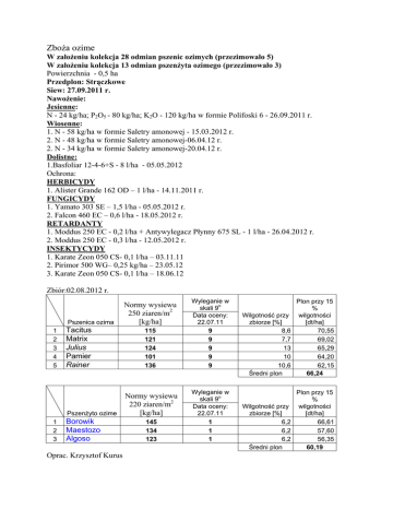 Zboża ozime W założeniu kolekcja 28 odmian pszenic ozimych (przezimowało 5) W założeniu kolekcja 13 odmian pszenżyta ozimego (przezimowało 3) Powierzchnia - 0,5 ha Przedplon: Strączkowe Siew: 27.09.2011 r. Nawożenie: Jesienne: N - 24 kg/ha; P2O5 - 80 kg/ha; K2O - 120 kg/ha w formie Polifoski 6 - 26.09.2011 r. Wiosenne: 1. N - 58 kg/ha w formie Saletry amonowej - 15.03.2012 r. 2. N - 48 kg/ha w formie Saletry amonowej-06.04.12 r. 2. N - 34 kg/ha w formie Saletry amonowej-20.04.12 r. Dolistne: 1.Basfoliar 12-4-6+S - 8 l/ha - 05.05.2012 Ochrona: HERBICYDY 1. Alister Grande 162 OD – 1 l/ha - 14.11.2011 r. FUNGICYDY 1. Yamato 303 SE – 1,5 l/ha - 05.05.2012 r. 2. Falcon 460 EC – 0,6 l/ha - 18.05.2012 r. RETARDANTY 1. Moddus 250 EC - 0,2 l/ha + Antywylegacz Płynny 675 SL - 1 l/ha - 26.04.2012 r. 2. Moddus 250 EC - 0,3 l/ha - 12.05.2012 r. INSEKTYCYDY 1. Karate Zeon 050 CS- 0,1 l/ha – 03.11.11 2. Pirimor 500 WG– 0,25 kg/ha – 23.05.12 3. Karate Zeon 050 CS- 0,1 l/ha – 18.06.12 Zbiór:02.08.2012 r. Pszenica ozima 1 2 3 4 5 Tacitus Matrix Julius Pamier Rainer Pszenżyto ozime 1 2 3 Borowik Maestozo Algoso Oprac. Krzysztof Kurus Normy wysiewu 250 ziaren/m2 [kg/ha] 115 121 124 101 136 Normy wysiewu 220 ziaren/m2 [kg/ha] 145 134 123 Wyleganie w skali 9o Data oceny: 22.07.11 9 9 9 9 9 Wyleganie w skali 9o Data oceny: 22.07.11 1 1 1 Wilgotność przy zbiorze [%] 8,6 7,7 13 10 10,6 Średni plon Plon przy 15 % wilgotności [dt/ha] 70,55 69,02 65,29 64,20 62,15 66,24 Plon przy 15 % Wilgotność przy wilgotności zbiorze [%] [dt/ha] 6,2 66,61 6,2 57,60 6,2 56,35 Średni plon 60,19