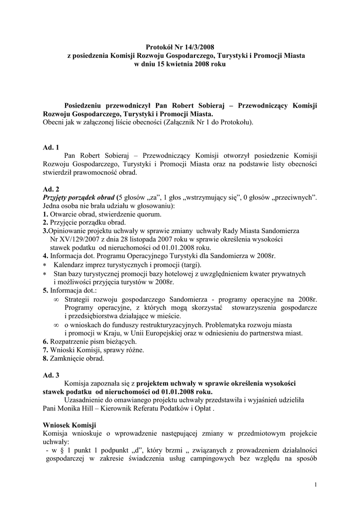 Protokół Nr 14/3/2008 z posiedzenia Komisji Rozwoju Gospodarczego, Turystyki i Promocji Miasta w dniu 15 kwietnia 2008 roku Posiedzeniu przewodniczył Pan Robert Sobieraj – Przewodniczący Komisji Rozwoju Gospodarczego, Turystyki i Promocji Miasta. Obecni jak w załączonej liście obecności (Załącznik Nr 1 do Protokołu). Ad. 1 Pan Robert Sobieraj – Przewodniczący Komisji otworzył posiedzenie Komisji Rozwoju Gospodarczego, Turystyki i Promocji Miasta oraz na podstawie listy obecności stwierdził prawomocność obrad. Ad. 2 Przyjęty porządek obrad (5 głosów „za”, 1 głos „wstrzymujący się”, 0 głosów „przeciwnych”. Jedna osoba nie brała udziału w głosowaniu): 1. Otwarcie obrad, stwierdzenie quorum. 2. Przyjęcie porządku obrad. 3.Opiniowanie projektu uchwały w sprawie zmiany uchwały Rady Miasta Sandomierza Nr XV/129/2007 z dnia 28 listopada 2007 roku w sprawie określenia wysokości stawek podatku od nieruchomości od 01.01.2008 roku. 4. Informacja dot. Programu Operacyjnego Turystyki dla Sandomierza w 2008r. ∗ Kalendarz imprez turystycznych i promocji (targi). ∗ Stan bazy turystycznej promocji bazy hotelowej z uwzględnieniem kwater prywatnych i moŜliwości przyjęcia turystów w 2008r. 5. Informacja dot.: • Strategii rozwoju gospodarczego Sandomierza - programy operacyjne na 2008r. Programy operacyjne, z których mogą skorzystać stowarzyszenia gospodarcze i przedsiębiorstwa działające w mieście. • o wnioskach do funduszy restrukturyzacyjnych. Problematyka rozwoju miasta i promocji w Kraju, w Unii Europejskiej oraz w odniesieniu do partnerstwa miast. 6. Rozpatrzenie pism bieŜących. 7. Wnioski Komisji, sprawy róŜne. 8. Zamknięcie obrad. Ad. 3 Komisja zapoznała się z projektem uchwały w sprawie określenia wysokości stawek podatku od nieruchomości od 01.01.2008 roku. Uzasadnienie do omawianego projektu uchwały przedstawiła i wyjaśnień udzieliła Pani Monika Hill – Kierownik Referatu Podatków i Opłat . Wniosek Komisji Komisja wnioskuje o wprowadzenie następującej zmiany w przedmiotowym projekcie uchwały: - w § 1 punkt 1 podpunkt „d”, który brzmi „ związanych z prowadzeniem działalności gospodarczej w zakresie świadczenia usług campingowych bez względu na sposób 1 zakwalifikowania w ewidencji gruntów i budynków - 0,15 zł od 1 m² powierzchni” - skreślić kwotę 0,15 a w to miejsce wpisać 0,02 zł. Pan Robert Sobieraj – Przewodniczący Komisji Rozwoju Gospodarczego, Turystyki i Promocji Miasta poddał pod głosowanie w/w wniosek. Wynik głosowania: 7 głosów „za”, 0 głosów „wstrzymujących się”, 0 głosów „przeciwnych”. - wniosek został przyjęty. Wniosek Komisji Komisja wnioskuje, aby corocznie przy ustalaniu wysokości stawek podatku od nieruchomości w projekcie uchwały był uwzględniany zapis zawarty w przedstawionym projekcie uchwały dot. niŜszej stawki dla gruntów związanych z prowadzeniem działalności gospodarczej w zakresie świadczenia usług campingowych. PowyŜszy wniosek został przyjęty: 7 głosów „za”, 0 głosów „wstrzymujących się”, 0 głosów „przeciwnych”. Członkowie Komisji po dyskusji i wnikliwej analizie poddany pod głosowanie przedmiotowy projekt uchwały wraz z poprawką Komisji zaopiniowała pozytywnie (7 głosów „za”, 0 głosów „wstrzymujących się”, 0 głosów „przeciwnych”). Ad. 4,5 Komisja Rozwoju Gospodarczego, Turystyki i Promocji Miasta zapoznała się z przedłoŜoną informacją dot. Programu Operacyjnego Turystyki dla Sandomierza w 2008r. • Kalendarz imprez turystycznych i promocji (targi). • Stan bazy turystycznej promocji bazy hotelowej z uwzględnieniem kwater prywatnych i moŜliwości przyjęcia turystów w 2008r. (informację stanowi załącznik Nr 2 do protokołu) Wniosek Komisji Komisja wnioskuje o przygotowanie na najbliŜej posiedzenie Komisji Rozwoju Gospodarczego, Turystyki i Promocji Miasta pisemnej informacji dot.: • Strategii rozwoju gospodarczego Sandomierza - programy operacyjne na 2008r. Programy operacyjne, z których mogą skorzystać stowarzyszenia gospodarcze i przedsiębiorstwa działające w mieście. • wniosków do funduszy restrukturyzacyjnych. Problematyka rozwoju miasta i promocji w Kraju, w Unii Europejskiej oraz w odniesieniu do partnerstwa miast. Ad. 6 Komisja zapoznała się z treścią pism, w których: • Pan Jerzy Borowski - Burmistrz Sandomierza przekazuje wyjaśnienia dot. wniosków Komisji Rozwoju Gospodarczego, Turystyki i Promocji Miasta zawartych w protokole Nr 13/2/2008 z posiedzenia komisji w dniu 14.02.2008 r. • Pan Jerzy Borowski - Burmistrz Sandomierza: - przekazuje kserokopię pisma znak Ok. XV/II-4023(2/6)2008 z dnia 20.03.2008 r. od Pana Stanisława Masternaka – Starosty Sandomierskiego, w sprawie dalszych losów Biura Wystaw Artystycznych w Sandomierzu, wraz z kserokopią odpowiedzi Burmistrza Sandomierza. 2 - zwraca się z uprzejmą prośbą o poddanie analizie, ocenie i dyskusji powyŜszych dokumentów oraz wyraŜenia opinii Rady Miasta Sandomierza w przedmiotowej sprawie. Komisja zapoznała się z propozycją Starosty Sandomierskiego dot. przejęcia przez samorząd sandomierski Biura Wystaw Artystycznych, który zadeklarował wsparcie finansowe dla funkcjonowania BWA w wysokości 80 000 zł corocznie. Ad. 7 Wnioski Komisji Komisja wnioskuje : - o dłuŜsze dyŜury StraŜy Miejskiej w Sandomierzu w czasie trwania imprez na Starówce (do godz. 23.00) - o przeniesienie imprez masowych z Rynku Starego Miasta w inne miejsce np. Plac Papieski. - Komisja uwaŜa, Ŝe naleŜy zwrócić uwagę oraz pouczyć osoby niepełnoletnie spoŜywające alkohol w lokalach gastronomicznych na trenie Sandomierza oraz podczas imprez na Starówce. - Komisja prosi o przedłoŜenie nowego folderu promującego Sandomierz. Ad. 8 Pan Robert Sobieraj – Przewodniczący Komisji stwierdził wyczerpanie porządku obrad i zamknął posiedzenie Komisji Rozwoju Gospodarczego T