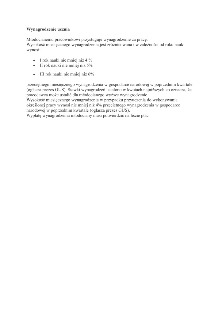 Wynagrodzenie ucznia Młodocianemu pracownikowi przysługuje wynagrodzenie za pracę. Wysokość miesięcznego wynagrodzenia jest zróżnicowana i w zależności od roku nauki wynosi: I rok nauki nie mniej niż 4 % II rok nauki nie mniej niż 5% III rok nauki nie mniej niż 6% przeciętnego miesięcznego wynagrodzenia w gospodarce narodowej w poprzednim kwartale (ogłasza prezes GUS). Stawki wynagrodzeń ustalono w kwotach najniższych co oznacza, że pracodawca może ustalić dla młodocianego wyższe wynagrodzenie. Wysokość miesięcznego wynagrodzenia w przypadku przyuczenia do wykonywania określonej pracy wynosi nie mniej niż 4% przeciętnego wynagrodzenia w gospodarce narodowej w poprzednim kwartale (ogłasza prezes GUS). Wypłatę wynagrodzenia młodociany musi potwierdzić na liście płac.