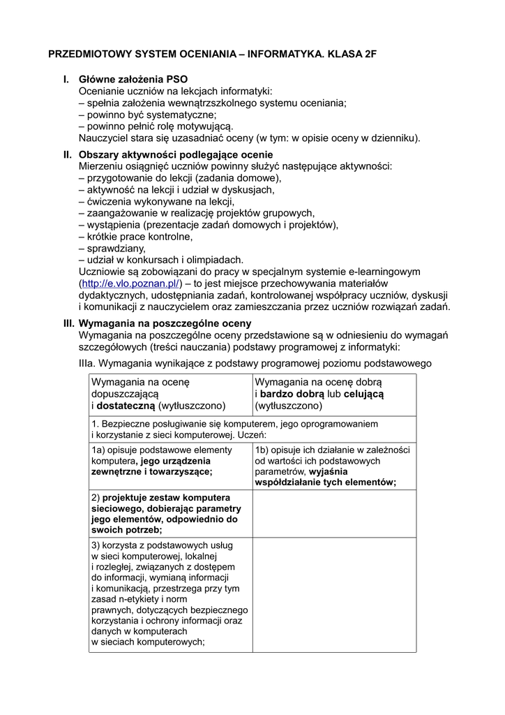 PRZEDMIOTOWY SYSTEM OCENIANIA – INFORMATYKA. KLASA 2F I. Główne założenia PSO Ocenianie uczniów na lekcjach informatyki: – spełnia założenia wewnątrzszkolnego systemu oceniania; – powinno być systematyczne; – powinno pełnić rolę motywującą. Nauczyciel stara się uzasadniać oceny (w tym: w opisie oceny w dzienniku). II. Obszary aktywności podlegające ocenie Mierzeniu osiągnięć uczniów powinny służyć następujące aktywności: – przygotowanie do lekcji (zadania domowe), – aktywność na lekcji i udział w dyskusjach, – ćwiczenia wykonywane na lekcji, – zaangażowanie w realizację projektów grupowych, – wystąpienia (prezentacje zadań domowych i projektów), – krótkie prace kontrolne, – sprawdziany, – udział w konkursach i olimpiadach. Uczniowie są zobowiązani do pracy w specjalnym systemie e-learningowym (http://e.vlo.poznan.pl/) – to jest miejsce przechowywania materiałów dydaktycznych, udostępniania zadań, kontrolowanej współpracy uczniów, dyskusji i komunikacji z nauczycielem oraz zamieszczania przez uczniów rozwiązań zadań. III. Wymagania na poszczególne oceny Wymagania na poszczególne oceny przedstawione są w odniesieniu do wymagań szczegółowych (treści nauczania) podstawy programowej z informatyki: IIIa. Wymagania wynikające z podstawy programowej poziomu podstawowego Wymagania na ocenę dopuszczającą i dostateczną (wytłuszczono) Wymagania na ocenę dobrą i bardzo dobrą lub celującą (wytłuszczono) 1. Bezpieczne posługiwanie się komputerem, jego oprogramowaniem i korzystanie z sieci komputerowej. Uczeń: 1a) opisuje podstawowe elementy komputera, jego urządzenia zewnętrzne i towarzyszące; 2) projektuje zestaw komputera sieciowego, dobierając parametry jego elementów, odpowiednio do swoich potrzeb; 3) korzysta z podstawowych usług w sieci komputerowej, lokalnej i rozległej, związanych z dostępem do informacji, wymianą informacji i komunikacją, przestrzega przy tym zasad n-etykiety i norm prawnych, dotyczących bezpiecznego korzystania i ochrony informacji oraz danych w komputerach w sieciach komputerowych; 1b) opisuje ich działanie w zależności od wartości ich podstawowych parametrów, wyjaśnia współdziałanie tych elementów; 2. Wyszukiwanie, gromadzenie, selekcjonowanie, przetwarzanie i wykorzystywanie informacji, współtworzenie zasobów w sieci, korzystanie z różnych źródeł i sposobów zdobywania informacji. Uczeń: 1) znajduje dokumenty i informacje 2) tworzy zasoby sieciowe związane w udostępnianych w Internecie ze swoim kształceniem bazach danych (np. bibliotecznych, i zainteresowaniami; statystycznych, w sklepach internetowych), ocenia ich przydatność i wiarygodność i gromadzi je na potrzeby realizowanych projektów z rożnych dziedzin; 3) dobiera odpowiednie formaty plików do rodzaju i przeznaczenia zapisanych w nich informacji. 3. Uczeń wykorzystuje technologie komunikacyjno-informacyjne. Uczeń: Uczeń wykorzystuje technologie komunikacyjno-informacyjne do komunikacji i współpracy z nauczycielami i innymi uczniami, a także z innymi osobami, jak również w swoich działaniach kreatywnych. 5. Rozwiązywanie problemów i podejmowanie decyzji z wykorzystaniem komputera, stosowanie podejścia algorytmicznego. Uczeń: 1) prowadzi dyskusje nad sytuacjami problemowymi; 2) formułuje specyfikacje dla wybranych sytuacji problemowych; 3) projektuje rozwiązanie: wybiera metodę rozwiązania, odpowiednio dobiera narzędzia komputerowe, tworzy projekt rozwiązania; 4) realizuje rozwiązanie na komputerze za pomocą oprogramowania aplikacyjnego lub języka programowania; 5) testuje otrzymane rozwiązanie, ocenia jego własności, w tym efektywność działania oraz zgodność ze specyfikacją; 6) przeprowadza prezentację i omawia zastosowania rozwiązania. 6. Wykorzystywanie komputera oraz programów edukacyjnych do poszerzania wiedzy i umiejętności z różnych dziedzin. Uczeń: 1a) wykorzystuje oprogramowanie dydaktyczne i technologie informacyjno-komunikacyjne przy rozwiązywaniu zadań szkolnych; 2) korzysta, odpowiednio do swoich zainteresowań i potrzeb, z zasobów edukacyjnych udostępnianych na portalach przeznaczonych do kształcenia na odległość. 1b) i w pracy twórczej; IIIb. Wymagania wynikające z podstawy programowej poziomu rozszerzonego Wymagania na ocenę dopuszczającą i dostateczną (wytłuszczono) Wymagania na ocenę dobrą i bardzo dobrą lub celującą (wytłuszczono) 1. Bezpieczne posługiwanie się komputerem, jego oprogramowaniem i korzystanie z sieci komputerowej. Uczeń: 1a) przedstawia sposoby reprezentowania różnych form informacji w komputerze: liczb, znaków; 1b) obrazów, animacji, dźwięków; 2) wyjaśnia funkcje systemu operacyjnego i korzysta z nich; 2b) opisuje różne systemy operacyjne; 3a) określa ustawienia sieciowe 3) przedstawia warstwowy model sieci danego komputera i jego lokalizacji komputerowych, opisuje zasady w sieci administrowania siecią komputerową w architekturze klient-serwer, prawidłowo posługuje się terminologią sieciową, korzysta z usług w sieci komputerowej, lokalnej i globalnej, związanych z dostępem do informacji, wymianą informacji i komunikacją; 4) zapoznaje się z możliwościami nowych urządzeń związanych z technologiami informacyjno-komunikacyjnymi, poznaje nowe programy i systemy oprogramowania; 3. Komunikowanie się za pomocą komputera i technologii informacyjno-komunikacyjnych. Uczeń: 1) wykorzystuje zasoby i usługi sieci komputerowych w komunikacji z innymi użytkownikami, w tym do przesyłania i udostępniania danych; 2) bierze udział w dyskusjach w sieci (forum internetowe, czat). 5. Rozwiązywanie problemów i podejmowanie decyzji z wykorzystaniem komputera, stosowanie podejścia algorytmicznego. Uczeń: 1) analizuje i modeluje sytuacje problemowe z różnych dziedzin; 2) stosuje podejście algorytmiczne do rozwiązywania problemu; 11) stosuje podstawowe algorytmy: a