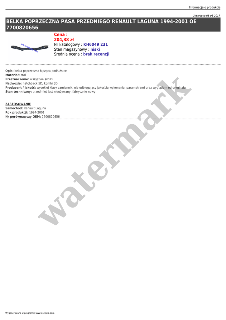 Informacje o produkcie Utworzono 08-03-2017 BELKA POPRZECZNA PASA PRZEDNIEGO RENAULT LAGUNA 1994-2001 OE 7700820656 Cena : 204,38 zł Nr katalogowy : KH6049 231 Stan magazynowy : niski Średnia ocena : brak recenzji w at ZASTOSOWANIE Samochód: Renault Laguna Rok produkcji: 1994-2001 Nr porównawczy OEM: 7700820656 er m ar k Opis: belka poprzeczna łącząca podłużnice Materiał: stal Przeznaczenie: wszystkie silniki Nadwozie: hatchback 5D, kombi 5D Producent / jakość: wysokiej klasy zamiennik, nie odbiegający jakością wykonania, parametrami oraz wyglądem od oryginału Stan techniczny: przedmiot jest nieużywany, fabrycznie nowy Wygenerowano w programie www.oscGold.com