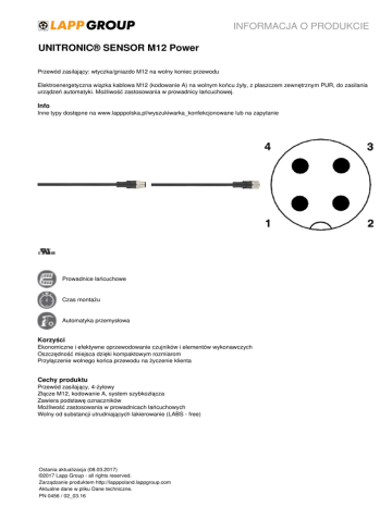 INFORMACJA O PRODUKCIE UNITRONIC® SENSOR M12 Power Przewód zasilający: wtyczka/gniazdo M12 na wolny koniec przewodu Elektroenergetyczna wiązka kablowa M12 (kodowanie A) na wolnym końcu żyły, z płaszczem zewnętrznym PUR, do zasilania urządzeń automatyki. Możliwość zastosowania w prowadnicy łańcuchowej. Info Inne typy dostępne na www.lapppolska.pl/wyszukiwarka_konfekcjonowane lub na zapytanie Prowadnice łańcuchowe Czas montażu Automatyka przemysłowa Korzyści Ekonomiczne i efektywne oprzewodowanie czujników i elementów wykonawczych Oszczędność miejsca dzięki kompaktowym rozmiarom Przyłączenie wolnego końca przewodu na życzenie klienta Cechy produktu Przewód zasilający, 4-żyłowy Złącze M12, kodowanie A, system szybkozłącza Zawiera podstawę oznaczników Możliwość zastosowania w prowadnicach łańcuchowych Wolny od substancji utrudniających lakierowanie (LABS - free) Ostania aktualizacja (08.03.2017) ©2017 Lapp Group - all rights reserved. Zarządzanie produktem http://lapppoland.lappgroup.com Aktualne dane w pliku Dane techniczne. PN 0456 / 02_03.16 INFORMACJA O PRODUKCIE UNITRONIC® SENSOR M12 Power Budowa produktu 4 x 0,75 mm² 4 styki: BN (1), WH (2), BU (3), BK (4) Izolacja żyły: PVC Płaszcz zewnętrzny: PUR, kolor czarny Średnica zewnętrzna: 5,9 mm Dane techniczne Klasyfikacja: ETIM 5.0 Class-ID: EC001855 Opis klasy ETIM 5.0: Sznur połączeniowy czujnik-urządzenie wykonawcze Materiał: Styk: CuSn Powierzchnia styku: Ni/Au Nakrętka radełkowana: ciśnieniowy odlew cynkowy, niklowany Obudowa: TPU, trudnopalny, samogasnący Minimalny promień gięcia: Połączenia ruchome: 10 x średnica zewnętrzna Stopień ochrony: IP65/IP67/IP68 Temperatura otoczenia (w trakcie pracy): Wtyczka/gniazdo: od -25°C do +90°C Połączenia nieruchome -25°C do +80°C Połączenia ruchome -5°C do +80°C Kodowanie: A-standard Prąd roboczy: 4A Wskazówka Wszystkie podane wartości dotyczące produktów są wartościami nominalnymi (o ile nie wskazano inaczej). Inne wartości, takie jak np. tolerancje mogą być przedstawione na zamówienie (jeżeli są dostępne i przeznaczone do publikacji). Fotografie nie mogą być używane do wymiarowania oraz nie stanowią szczegółowego odwzorowania przedstawionych produktów. * Podane ceny to ceny netto bez podatku VAT i dodatkowych opłat. Sprzedaż klientom biznesowym. Ostania aktualizacja (08.03.2017) ©2017 Lapp Group - all rights reserved. Zarządzanie produktem http://lapppoland.lappgroup.com Aktualne dane w pliku Dane techniczne. PN 0456 / 02_03.16 Powered by TCPDF (www.tcpdf.org) Oznaczenie wyrobu Liczba styków Długość [m] Wykonanie Napięcie nominalne UN [V] 22260778 AB-PC4-M12MS-2,0PUR 4 2 Proste 250 22260779 AB-PC4-M12MS-5,0PUR 4 5 Proste 250 22260780 AB-PC4-M12MS-10,0PUR 4 10 Proste 250 22260781 AB-PC4-2,0PUR-M12FS 4 2 Proste 250 22260782 AB-PC4-5,0PUR-M12FS 4 5 Proste 250 22260783 AB-PC4-10,0PUR-M12FS 4 10 Proste 250 Wtyczka prosta Gniazdo proste UNITRONIC® SENSOR M12 Power Ostania aktualizacja (08.03.2017) ©2017 Lapp Group - all rights reserved. Zarządzanie produktem http://lapppoland.lappgroup.com Aktualne dane w pliku Dane techniczne. PN 0456 / 02_03.16 INFORMACJA O PRODUKCIE Powered by TCPDF (www.tcpdf.org) Numer katalogowy