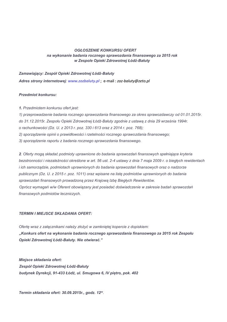 OGŁOSZENIE KONKURSU OFERT na wykonanie badania rocznego sprawozdania finansowego za 2015 rok w Zespole Opieki Zdrowotnej Łódź-Bałuty Zamawiający: Zespół Opieki Zdrowotnej Łódź-Bałuty Adres strony internetowej: www.zozbaluty.pl ; e-mail : [email protected] Przedmiot konkursu: 1. Przedmiotem konkursu ofert jest: 1) przeprowadzenie badania rocznego sprawozdania finansowego za okres sprawozdawczy od 01.01.2015r. do 31.12.2015r. Zespołu Opieki Zdrowotnej Łódź-Bałuty zgodnie z ustawą z dnia 29 września 1994r. o rachunkowości (Dz. U. z 2013 r. poz. 330 i 613 oraz z 2014 r. poz. 768); 2) sporządzenie opinii o prawidłowości i rzetelności rocznego sprawozdania finansowego; 3) sporządzenie raportu z badania rocznego sprawozdania finansowego. 2. Oferty mogą składać podmioty uprawnione do badania sprawozdań finansowych spełniające kryteria bezstronności i niezależności określone w art. 56 ust. 2-4 ustawy z dnia 7 maja 2009 r. o biegłych rewidentach i ich samorządzie, podmiotach uprawnionych do badania sprawozdań finansowych oraz o nadzorze publicznym (Dz. U. z 2015 r. poz. 1011) oraz wpisane na listę podmiotów uprawnionych do badania sprawozdań finansowych prowadzoną przez Krajową Izbę Biegłych Rewidentów. Oprócz wymagań w/w Oferent obowiązany jest posiadać doświadczenie w zakresie badań sprawozdań finansowych podmiotów leczniczych. TERMIN I MIEJSCE SKŁADANIA OFERT: Ofertę wraz z załącznikami należy złożyć w zamkniętej kopercie z dopiskiem: „Konkurs ofert na wykonanie badania rocznego sprawozdania finansowego za 2015 rok Zespołu Opieki Zdrowotnej Łódź-Bałuty. Nie otwierać.” Miejsce składania ofert: Zespół Opieki Zdrowotnej Łódź-Bałuty budynek Dyrekcji, 91-433 Łódź, ul. Smugowa 6, IV piętro, pok. 402 Termin składania ofert: 30.09.2015r., godz. 1200. Kryteria oceny ofert: Przy wyborze najkorzystniejszej oferty Zamawiający będzie kierował się następującymi kryteriami i ich wagą: A) Cena 50% B) Doświadczenie oferenta 50% Kryteria oceny ofert: Przy wyborze najkorzystniejszej oferty Zamawiający będzie kierował się następującymi kryteriami i ich wagą: 1) Cena ( waga: 40%) 2) Doświadczenie oferenta ( waga: 60%) 3) Kryteria dodatkowe Sposób oceny ofert: Za najkorzystniejszą zostanie uznana niepodlegająca odrzuceniu oferta, która uzyska najwyższą wartość punktową, wynikającą z sumy składników A i B, wyliczonych według następujących wzorów: A. Kryterium „Cena”: cena oferty z najniższą ceną A = Wartość punktowa oferty badanej = ------------------------------------- x 40 cena oferty badanej B. Kryterium „Doświadczenie oferenta”: liczba punktów uzyskanych przez ofertę badaną B = Wartość punktowa oferty = --------------------------------------------------------------------- x 60 max. liczba punktów możliwych do uzyskania gdzie: liczba punktów uzyskanych przez ofertę badaną oznacza liczbę punktów przyznaną ofercie przez komisję konkursową ofercie. Komisja konkursowa ustalać będzie wartość punktową na podstawie analizy i oceny danych przedstawionych przez Wykonawców w „Wykazie przeprowadzonych badań sprawozdań finansowych”. Członkowie komisji konkursowej dokonają oceny oferty w kryterium „Doświadczenie oferenta”, przyznając punkty w następujący sposób: 1) wykazanie do dwóch badań w danym roku: 3 pkt. 2) wykazanie od trzech do pięciu badań w danym roku: 3) wykazanie powyżej pięciu badań w danym roku: 5 pkt. 10 pkt. Kryteria dodatkowe dotyczące badania przez danego oferenta sprawozdań finansowych danego sp zoz: 1) 50 pkt – w przypadku niewykonania badania sprawozdania finansowego danego sp zoz przez oferenta za ostatnie 2 lata; 2) 25 pkt – w przypadku, gdy oferent wykonywał badanie sprawozdania finansowego danego sp.zoz w jednym z dwóch ostatnich lat; 3) 10 pkt – w przypadku, gdy oferent wykonywał badanie sprawozdania finansowego danego sp zoz za ostatnie dwa lata. Termin związania ofertą: do dnia 31.X.2015 r. Oferta powinna zawierać: 1. Wypełniony formularz ofertowy (zgodnie z zał. nr 1 do niniejszego ogłoszenia); 2. Podstawowe informacje dotyczące oferenta i charakteru prowadzonej przez niego działalności, potwierdzone następującymi dokumentami: 1) Kserokopią aktualnego odpisu z właściwego rejestru lub z centralnej ewidencji i informacji o działalności gospodarczej, jeżeli odrębne przepisy wymagają wpisu do rejestru lub ewidencji, wystawione nie wcześniej, niż 6 m-cy przed upływem terminu składania ofert; 2) Oświadczenie oferenta o posiadaniu uprawnień do badania sprawozdań finansowych oraz o spełnianiu kryteriów bezstronności i niezależności określonych w art. 56 ust. 2-4 ustawy z dnia 7 maja 2009 r. o biegłych rewidentach i ich samorządzie, podmiotach uprawnionych do badania sprawozdań finansowych oraz o nadzorze publicznym (Dz. U. Nr 77, poz. 649, z 2010 r., Nr 182, poz. 1228, z 2012 r. poz. 1166 oraz z 2013 r. poz. 1036), zgodnie z zał. 2 do niniejszego ogłoszenia; 3) Zaświadczenie z Krajowej Izby Biegłych Rewidentów o wpisaniu oferenta na listę podmiotów uprawnionych do badania sprawozdań finansowych; 4) Wykaz przeprowadzonych badań sprawozdań finansowych podmiotów leczniczych z okresu ostatnich 5 lat przed upływem terminu składania ofert (tj. sprawozdania za lata 2010-2014) - co najmniej dwa badania w każdym roku wraz z podaniem dat ich wykonania oraz podmiotów, na rzecz których badania zostały wykonane. W przypadku wykazania mniejszej ilości przeprowadzonych badań, niż wymagana przez Zamawiającego oferta będzie podlegała odrzuceniu. Do wykazu przeprowadzonych badań sprawozdań finansowych należy dołączyć oświadczenie o prawdziwości zawartych w nim danych pod rygorem odpowiedzialności karnej za fałszywe oświadczenie. 5) Oryginał pełnomocnictwa, jeżeli osobą podpisującą ofertę nie będzie osoba upoważniona na podstawie dokumentu (wymienionego w punkcie 