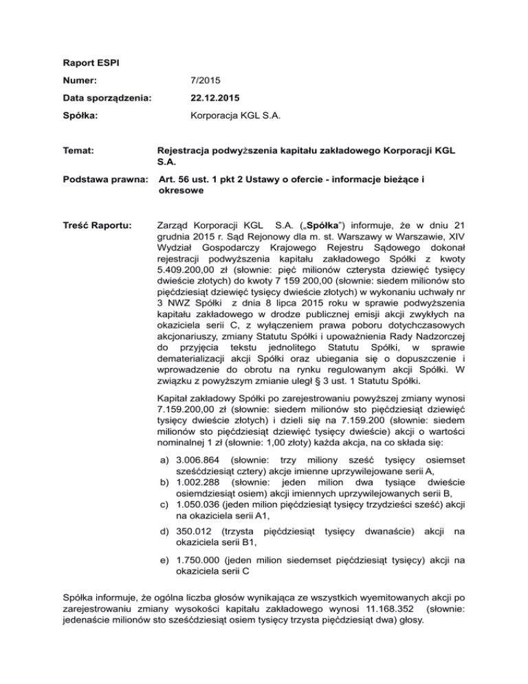 Raport ESPI Numer: 7/2015 Data sporządzenia: 22.12.2015 Spółka: Korporacja KGL S.A. Temat: Rejestracja podwyższenia kapitału zakładowego Korporacji KGL S.A. Podstawa prawna: Art. 56 ust. 1 pkt 2 Ustawy o ofercie - informacje bieżące i okresowe Treść Raportu: Zarząd Korporacji KGL S.A. („Spółka”) informuje, że w dniu 21 grudnia 2015 r. Sąd Rejonowy dla m. st. Warszawy w Warszawie, XIV Wydział Gospodarczy Krajowego Rejestru Sądowego dokonał rejestracji podwyższenia kapitału zakładowego Spółki z kwoty 5.409.200,00 zł (słownie: pięć milionów czterysta dziewięć tysięcy dwieście złotych) do kwoty 7 159 200,00 (słownie: siedem milionów sto pięćdziesiąt dziewięć tysięcy dwieście złotych) w wykonaniu uchwały nr 3 NWZ Spółki z dnia 8 lipca 2015 roku w sprawie podwyższenia kapitału zakładowego w drodze publicznej emisji akcji zwykłych na okaziciela serii C, z wyłączeniem prawa poboru dotychczasowych akcjonariuszy, zmiany Statutu Spółki i upoważnienia Rady Nadzorczej do przyjęcia tekstu jednolitego Statutu Spółki, w sprawie dematerializacji akcji Spółki oraz ubiegania się o dopuszczenie i wprowadzenie do obrotu na rynku regulowanym akcji Spółki. W związku z powyższym zmianie uległ § 3 ust. 1 Statutu Spółki. Kapitał zakładowy Spółki po zarejestrowaniu powyższej zmiany wynosi 7.159.200,00 zł (słownie: siedem milionów sto pięćdziesiąt dziewięć tysięcy dwieście złotych) i dzieli się na 7.159.200 (słownie: siedem milionów sto pięćdziesiąt dziewięć tysięcy dwieście) akcji o wartości nominalnej 1 zł (słownie: 1,00 złoty) każda akcja, na co składa się: a) 3.006.864 (słownie: trzy miliony sześć tysięcy osiemset sześćdziesiąt cztery) akcje imienne uprzywilejowane serii A, b) 1.002.288 (słownie: jeden milion dwa tysiące dwieście osiemdziesiąt osiem) akcji imiennych uprzywilejowanych serii B, c) 1.050.036 (jeden milion pięćdziesiąt tysięcy trzydzieści sześć) akcji na okaziciela serii A1, d) 350.012 (trzysta pięćdziesiąt okaziciela serii B1, tysięcy dwanaście) akcji na e) 1.750.000 (jeden milion siedemset pięćdziesiąt tysięcy) akcji na okaziciela serii C Spółka informuje, że ogólna liczba głosów wynikająca ze wszystkich wyemitowanych akcji po zarejestrowaniu zmiany wysokości kapitału zakładowego wynosi 11.168.352 (słownie: jedenaście milionów sto sześćdziesiąt osiem tysięcy trzysta pięćdziesiąt dwa) głosy. Zarejestrowana zmiana Statutu Spółki związana jest z opisaną powyżej zmianą wysokości kapitału zakładowego Spółki. Podpisy osób reprezentujących Spółkę 22.12.2015 r. Krzysztof Gromkowski Prezes Zarządu Lech Skibiński Wiceprezes Zarządu