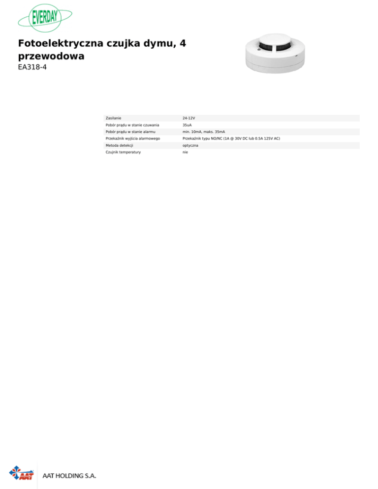 Fotoelektryczna czujka dymu, 4 przewodowa EA318-4 Zasilanie 24-12V Pobór prądu w stanie czuwania 35uA Pobór prądu w stanie alarmu min. 10mA, maks. 35mA Przekaźnik wyjścia alarmowego Przekaźnik typu NO/NC (1A @ 30V DC lub 0.5A 125V AC) Metoda detekcji optyczna Czujnik temperatury nie