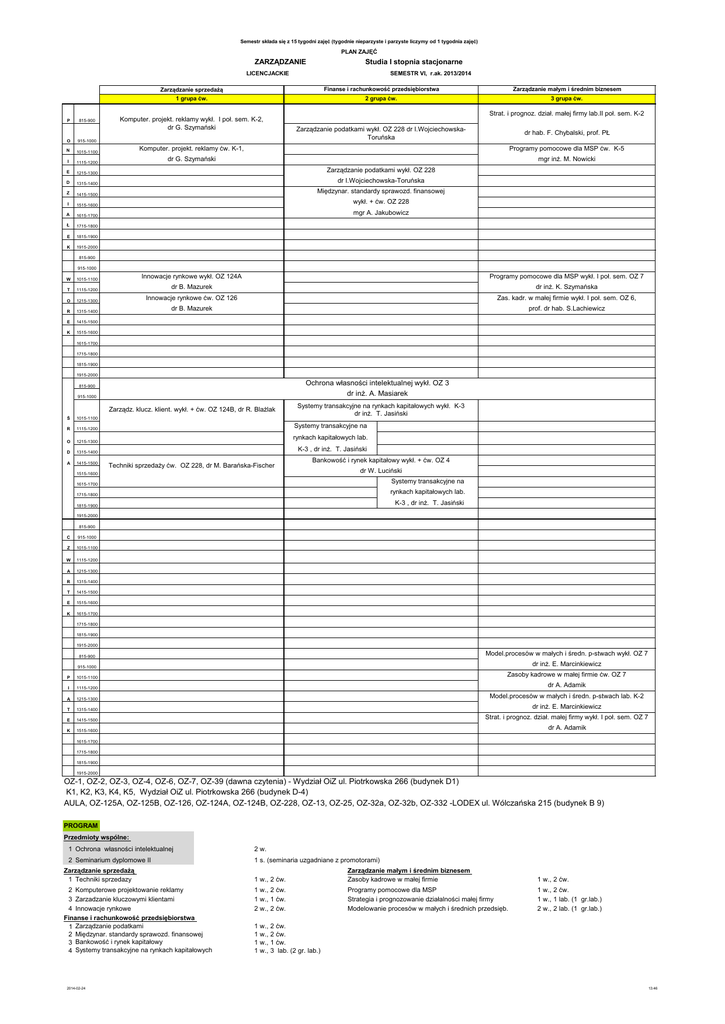 Semestr składa się z 15 tygodni zajęć (tygodnie nieparzyste i parzyste liczymy od 1 tygodnia zajęć) PLAN ZAJĘĆ ZARZĄDZANIE Studia I stopnia stacjonarne LICENCJACKIE SEMESTR VI, r.ak. 2013/2014 Zarządzanie sprzedażą Finanse i rachunkowość przedsiębiorstwa 1 grupa ćw. 2 grupa ćw. Komputer. projekt. reklamy wykł. I poł. sem. K-2, dr G. Szymański Zarządzanie małym i średnim biznesem 3 grupa ćw. Strat. i prognoz. dział. małej firmy lab.II poł. sem. K-2 P 815-900 O 915-1000 N 1015-1100 Komputer. projekt. reklamy ćw. K-1, I 1115-1200 dr G. Szymański E 1215-1300 D 1315-1400 dr I.Wojciechowska-Toruńska Z 1415-1500 Międzynar. standardy sprawozd. finansowej Zarządzanie podatkami wykł. OZ 228 dr I.WojciechowskaToruńska dr hab. F. Chybalski, prof. PŁ Programy pomocowe dla MSP ćw. K-5 mgr inż. M. Nowicki Zarządzanie podatkami wykł. OZ 228 I 1515-1600 wykł. + ćw. OZ 228 A 1615-1700 mgr A. Jakubowicz Ł 1715-1800 E 1815-1900 K 1915-2000 815-900 915-1000 W 1015-1100 Innowacje rynkowe wykł. OZ 124A T 1115-1200 dr B. Mazurek Programy pomocowe dla MSP wykł. I poł. sem. OZ 7 dr inż. K. Szymańska O 1215-1300 Innowacje rynkowe ćw. OZ 126 Zas. kadr. w małej firmie wykł. I poł. sem. OZ 6, R 1315-1400 dr B. Mazurek prof. dr hab. S.Lachiewicz E 1415-1500 K 1515-1600 1615-1700 1715-1800 1815-1900 1915-2000 Ochrona własności intelektualnej wykł. OZ 3 dr inż. A. Masiarek 815-900 915-1000 Zarządz. klucz. klient. wykł. + ćw. OZ 124B, dr R. Blażlak Ś 1015-1100 R 1115-1200 O 1215-1300 D 1315-1400 A 1415-1500 Systemy transakcyjne na rynkach kapitałowych wykł. K-3 dr inż. T. Jasiński Systemy transakcyjne na rynkach kapitałowych lab. K-3 , dr inż. T. Jasiński Techniki sprzedaży ćw. OZ 228, dr M. Barańska-Fischer Bankowość i rynek kapitałowy wykł. + ćw. OZ 4 1515-1600 dr W. Luciński 1615-1700 Systemy transakcyjne na 1715-1800 rynkach kapitałowych lab. 1815-1900 K-3 , dr inż. T. Jasiński 1915-2000 815-900 C 915-1000 Z 1015-1100 W 1115-1200 A 1215-1300 R 1315-1400 T 1415-1500 E 1515-1600 K 1615-1700 1715-1800 1815-1900 1915-2000 Model.procesów w małych i średn. p-stwach wykł. OZ 7 815-900 915-1000 dr inż. E. Marcinkiewicz P 1015-1100 Zasoby kadrowe w małej firmie ćw. OZ 7 I 1115-1200 dr A. Adamik Ą 1215-1300 Model.procesów w małych i średn. p-stwach lab. K-2 T 1315-1400 dr inż. E. Marcinkiewicz E 1415-1500 Strat. i prognoz. dział. małej firmy wykł. I poł. sem. OZ 7 K 1515-1600 dr A. Adamik 1615-1700 1715-1800 1815-1900 1915-2000 OZ-1, OZ-2, OZ-3, OZ-4, OZ-6, OZ-7, OZ-39 (dawna czytenia) - Wydział OiZ ul. Piotrkowska 266 (budynek D1) K1, K2, K3, K4, K5, Wydział OiZ ul. Piotrkowska 266 (budynek D-4) AULA, OZ-125A, OZ-125B, OZ-126, OZ-124A, OZ-124B, OZ-228, OZ-13, OZ-25, OZ-32a, OZ-32b, OZ-332 -LODEX ul. Wólczańska 215 (budynek B 9) PROGRAM Przedmioty wspólne: 1 Ochrona własności intelektualnej 2 w. 2 Seminarium dyplomowe II 1 s. (seminaria uzgadniane z promotorami) Zarządzanie sprzedażą 1 Techniki sprzedazy 2 Komputerowe projektowanie reklamy 3 Zarzadzanie kluczowymi klientami 4 Innowacje rynkowe Finanse i rachunkowość przedsiębiorstwa 1 Zarządzanie podatkami 2 Międzynar. standardy sprawozd. finansowej 3 Bankowość i rynek kapitałowy 4 Systemy transakcyjne na rynkach kapitałowych 2014-02-24 1 w., 2 ćw. Zarządzanie małym i średnim biznesem Zasoby kadrowe w małej firmie 1 w., 2 ćw. 1 w., 2 ćw. 1 w., 1 ćw. 2 w., 2 ćw. Programy pomocowe dla MSP Strategia i prognozowanie działalności małej firmy Modelowanie procesów w małych i średnich przedsięb. 1 w., 2 ćw. 1 w., 1 lab. (1 gr.lab.) 2 w., 2 lab. (1 gr.lab.) 1 w., 2 ćw. 1 w., 2 ćw. 1 w., 1 ćw. 1 w., 3 lab. (2 gr. lab.) 13:46