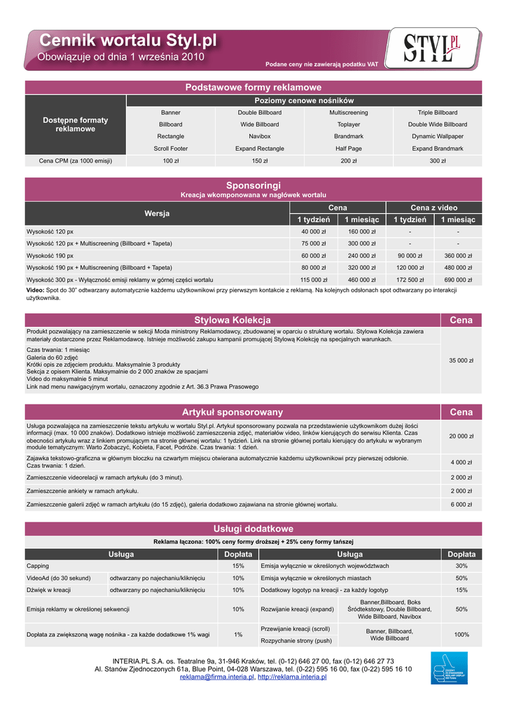 Cennik wortalu Styl.pl Obowiązuje od dnia 1 września 2010 Podane ceny nie zawierają podatku VAT Podstawowe formy reklamowe Poziomy cenowe nośników Dostępne formaty reklamowe Cena CPM (za 1000 emisji) Banner Double Billboard Multiscreening Triple Billboard Billboard Wide Billboard Toplayer Double Wide Billboard Rectangle Navibox Brandmark Dynamic Wallpaper Scroll Footer Expand Rectangle Half Page Expand Brandmark 100 zł 150 zł 200 zł 300 zł Sponsoringi Kreacja wkomponowana w nagłówek wortalu Cena Wersja Cena z video 1 tydzień 1 miesiąc 1 tydzień 1 miesiąc Wysokość 120 px 40 000 zł 160 000 zł - - Wysokość 120 px + Multiscreening (Billboard + Tapeta) 75 000 zł 300 000 zł - - Wysokość 190 px 60 000 zł 240 000 zł 90 000 zł 360 000 zł Wysokość 190 px + Multiscreening (Billboard + Tapeta) 80 000 zł 320 000 zł 120 000 zł 480 000 zł Wysokość 300 px - Wyłączność emisji reklamy w górnej części wortalu 115 000 zł 460 000 zł 172 500 zł 690 000 zł Video: Spot do 30” odtwarzany automatycznie każdemu użytkownikowi przy pierwszym kontakcie z reklamą. Na kolejnych odsłonach spot odtwarzany po interakcji użytkownika. Stylowa Kolekcja Cena Produkt pozwalający na zamieszczenie w sekcji Moda ministrony Reklamodawcy, zbudowanej w oparciu o strukturę wortalu. Stylowa Kolekcja zawiera materiały dostarczone przez Reklamodawcę. Istnieje możliwość zakupu kampanii promującej Stylową Kolekcję na specjalnych warunkach. Czas trwania: 1 miesiąc Galeria do 60 zdjęć Krótki opis ze zdjęciem produktu. Maksymalnie 3 produkty Sekcja z opisem Klienta. Maksymalnie do 2 000 znaków ze spacjami Video do maksymalnie 5 minut Link nad menu nawigacyjnym wortalu, oznaczony zgodnie z Art. 36.3 Prawa Prasowego 35 000 zł Artykuł sponsorowany Cena Usługa pozwalająca na zamieszczenie tekstu artykułu w wortalu Styl.pl. Artykuł sponsorowany pozwala na przedstawienie użytkownikom dużej ilości informacji (max. 10 000 znaków). Dodatkowo istnieje możliwość zamieszczenia zdjęć, materiałów video, linków kierujących do serwisu Klienta. Czas obecności artykułu wraz z linkiem promującym na stronie głównej wortalu: 1 tydzień. Link na stronie głównej portalu kierujący do artykułu w wybranym module tematycznym: Warto Zobaczyć, Kobieta, Facet, Podróże. Czas trwania: 1 dzień. 20 000 zł Zajawka tekstowo-graficzna w głównym bloczku na czwartym miejscu otwierana automatycznie każdemu użytkownikowi przy pierwszej odsłonie. Czas trwania: 1 dzień. 4 000 zł Zamieszczenie videorelacji w ramach artykułu (do 3 minut). 2 000 zł Zamieszczenie ankiety w ramach artykułu. 2 000 zł Zamieszczenie galerii zdjęć w ramach artykułu (do 15 zdjęć), galeria dodatkowo zajawiana na stronie głównej wortalu. 6 000 zł Usługi dodatkowe Reklama łączona: 100% ceny formy droższej + 25% ceny formy tańszej Usługa Capping Dopłata Usługa Dopłata 15% Emisja wyłącznie w określonych województwach 30% VideoAd (do 30 sekund) odtwarzany po najechaniu/kliknięciu 10% Emisja wyłącznie w określonych miastach 50% Dźwięk w kreacji odtwarzany po najechaniu/kliknięciu 10% Dodatkowy logotyp na kreacji - za każdy logotyp 15% Emisja reklamy w określonej sekwencji 10% Rozwijanie kreacji (expand) Dopłata za zwiększoną wagę nośnika - za każde dodatkowe 1% wagi 1% Przewijanie kreacji (scroll) Rozpychanie strony (push) Banner,Billboard, Boks Śródtekstowy, Double Billboard, Wide Billboard, Navibox 50% Banner, Billboard, Wide Billboard 100% INTERIA.PL S.A. os. Teatralne 9a, 31-946 Kraków, tel. (0-12) 646 27 00, fax (0-12) 646 27 73 Al. Stanów Zjednoczonych 61a, Blue Point, 04-028 Warszawa, tel. (0-22) 595 16 00, fax (0-22) 595 16 10 [email protected], http://reklama.interia.pl