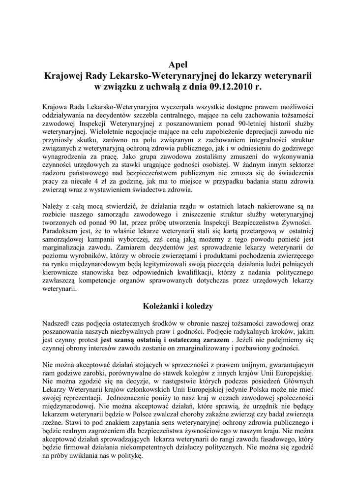 Apel Krajowej Rady Lekarsko-Weterynaryjnej do lekarzy weterynarii w związku z uchwałą z dnia 09.12.2010 r. Krajowa Rada Lekarsko-Weterynaryjna wyczerpała wszystkie dostępne prawem możliwości oddziaływania na decydentów szczebla centralnego, mające na celu zachowania tożsamości zawodowej Inspekcji Weterynaryjnej z poszanowaniem ponad 90-letniej historii służby weterynaryjnej. Wieloletnie negocjacje mające na celu zapobieżenie deprecjacji zawodu nie przyniosły skutku, zarówno na polu związanym z zachowaniem integralności struktur związanych z weterynaryjną ochroną zdrowia publicznego, jak i w odniesieniu do godziwego wynagrodzenia za pracę. Jako grupa zawodowa zostaliśmy zmuszeni do wykonywania czynności urzędowych za stawki urągające godności osobistej. W żadnym innym sektorze nadzoru państwowego nad bezpieczeństwem publicznym nie zmusza się do świadczenia pracy za niecałe 4 zł za godzinę, jak ma to miejsce w przypadku badania stanu zdrowia zwierząt wraz z wystawieniem świadectwa zdrowia. Należy z całą mocą stwierdzić, że działania rządu w ostatnich latach nakierowane są na rozbicie naszego samorządu zawodowego i zniszczenie struktur służby weterynaryjnej tworzonych od ponad 90 lat, przez próbę utworzenia Inspekcji Bezpieczeństwa Żywności. Paradoksem jest, że to właśnie lekarze weterynarii stali się kartą przetargową w ostatniej samorządowej kampanii wyborczej, zaś ceną jaką możemy z tego powodu ponieść jest marginalizacja zawodu. Zamiarem decydentów jest sprowadzenie lekarzy weterynarii do poziomu wyrobników, którzy w obrocie zwierzętami i produktami pochodzenia zwierzęcego na rynku międzynarodowym będą legitymizowali swoją pieczęcią działania ludzi pełniących kierownicze stanowiska bez odpowiednich kwalifikacji, którzy z nadania politycznego zawłaszczą kompetencje organów sprawowanych dotychczas przez urzędowych lekarzy weterynarii. Koleżanki i koledzy Nadszedł czas podjęcia ostatecznych środków w obronie naszej tożsamości zawodowej oraz poszanowania naszych niezbywalnych praw i godności. Podjęcie radykalnych kroków, jakim jest czynny protest jest szansą ostatnią i ostateczną zarazem . Jeżeli nie podejmiemy się czynnej obrony interesów zawodu zostanie on zmarginalizowany i pozbawiony godności. Nie można akceptować działań stojących w sprzeczności z prawem unijnym, gwarantującym nam godziwe zarobki, porównywalne do stawek kolegów z innych krajów Unii Europejskiej. Nie można zgodzić się na decyzje, w następstwie których podczas posiedzeń Głównych Lekarzy Weterynarii krajów członkowskich Unii Europejskiej jedynie Polska może nie mieć swojej reprezentacji. Jednoznacznie poniży to nasz kraj w oczach zawodowej społeczności międzynarodowej. Nie można akceptować działań, które sprawią, że urzędnik nie będący lekarzem weterynarii będzie w Polsce zwalczał choroby zakaźne zwierząt czy badał zwierzęta rzeźne. Stawi to pod znakiem zapytania sens weterynaryjnej ochrony zdrowia publicznego i będzie realnym zagrożeniem dla bezpieczeństwa żywnościowego w naszym kraju. Nie można akceptować działań sprowadzających lekarza weterynarii do rangi zawodu fasadowego, który będzie firmował działania niekompetentnych działaczy politycznych. Nie można się zgodzić na próby uwikłania nas w politykę. My lekarze weterynarii, jesteśmy pełnoprawnymi obywatelami Rzeczpospolitej Polskiej, jak przedstawiciele innych zawodów i domagamy się prawa do godnego życia w państwie demokratycznym. Nie zgadzamy się być kartą przetargową w rozmowach pomiędzy rolnikami i branżowymi związkami przemysłu rolniczego, a Ministrem Rolnictwa i Rozwoju Wsi. Niepodwyższanie od 7 lat wynagrodzeń urzędowych lekarzy weterynarii jest wyzyskiem. Czujemy się poniżani i pozbawieni jakichkolwiek praw, z prawami człowieka włącznie. Goryczą napawa nas fakt, że zmiana rozporządzenia w sprawie opłat, obniżającego stawki ponoszone przez hodowców od 50 do 80%, była elementem kampanii wyborczej prowadzonej przez Ministra Rolnictwa i Rozwoju Wsi na potrzeby wyborów samorządowych. Za dobry wynik wyborczy Polskiego Stronnictwa Ludowego zapłaci polski lekarz weterynarii pracujący od 2003 r. Jednocześnie z populistycznymi działaniami nakierowanymi na efekt wśród producentów rolnych kosztem lekarzy weterynarii od 2007 r. w Ministerstwie Rolnictwa i Rozwoju Wsi dokonywano podwyżek płac. Były one najwyższe wśród innych resortów i wynosiły 70,76% ( vide Aleksandra Kurowska: âNajlepiej płaci resort rolnictwaâ Rzeczpospolita z 07.07.2010). Jest to przejaw relatywizmu, nacechowanego chęcią poniżenia lekarzy weterynarii i złej woli decydentów. Jednocześnie Inspekcja Weterynaryjna jest wykorzystywana do ukrytego dotowania przemysłu mięsnego, jak w przypadku opłat za badanie bydła w kierunku BSE. Polska jest jedynym krajem w Europie, w którym badanie to jest przeprowadzone na koszt podatników, a nie producentów. Lekarze weterynarii pracujący w Inspekcji Weterynaryjnej od wielu lat nie otrzymali regulacji płacowych porównywalnych chociażby, z uzyskiwanymi przez ich kolegów z Rumunii czy Bułgarii . Koleżanki i Koledzy W historii naszego zawodu nie było momentu bardziej dramatycznego a zarazem donioślejszego niż obecny. Znaleźliśmy się w historycznej chwili i tylko od nas zależą dalsze losy zawodu lekarza weterynarii i jego kształt w następnych dziesięcioleciach. Albo zgodzimy się na dalsze poniżanie i traktowanie poniżej godności, albo z honorem podniesiemy głowy mówiąc â nie! Od solidarnej postawy w trakcie protestu zależy nasz dalszy los. Dla dobra zawodu, z szacunku dla wielu pokoleń naszych poprzedników, dbając o interesy tych, którzy przyjdą po nas, musimy zrobić to, co do nas należy. Następnej takiej okazji już nie będzie. Nie zmarnujmy szansy obrony naszej godności naszego zawodu. Członkowie Krajowej R