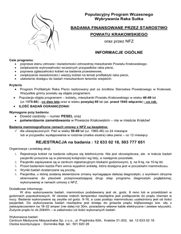 Populacyjny Program Wczesnego Wykrywania Raka Sutka BADANIA FINANSOWANE PRZEZ STAROSTWO POWIATU KRAKOWSKIEGO oraz przez NFZ INFORMACJE OGÓLNE Cele programu: poprawa stanu zdrowia i świadomości zdrowotnej mieszkanek Powiatu Krakowskiego. zwiększenie wykrywalności wczesnych przypadków raka piersi, poprawa zgłaszalności kobiet na badania przesiewowe, zwiększenie świadomości i wiedzy kobiet na temat profilaktyki raka piersi, ułatwienie dostępu do badań mieszkankom terenów wiejskich. Kryteria Program Profilaktyki Raka Piersi realizowany jest ze środków Starostwa Powiatowego w Krakowie. Wszystkie gminy powiatu są objęte programem. Populacja objęta programem – kobiety, mieszkanki Powiatu Krakowskiego w wieku 40-49 lat (ur.1975-66) - co dwa lata oraz w wieku powyżej 69 lat (ur. przed 1945 włącznie) - co rok. ILOŚĆ BADAŃ OGRANICZONA! Wymagane przy badaniu: Dowód osobisty – numer PESEL oraz potwierdzenie zameldowania w Powiecie Krakowskim – nie w mieście Kraków! Badania mammograficzne ramach umowy z NFZ są bezpłatne: dla ubezpieczonych Pań w wieku 50-69 lat (ur. 1965-46) co 24 miesiące lub w przypadku występowania w rodzinie (matka siostra) raka piersi – co 12 miesięcy REJESTRACJA na badania : 12 633 02 18, 503 777 651 Organizacja i przebieg akcji. 1. Rejestracja kobiet na badanie odbywa się telefonicznie. Nie jest obowiązkowa, ale w trakcie badań pacjentki proszone są w pierwszej kolejności wg listy, a następnie pozostałe. 2. Pacjentki zapisywane są w centrum rejestracyjnym blokami godzinowymi, tj. na 9-tą, na 10-tą itd. 3. Przed badaniem każda Pani winna wypełnić ankietę, która dostępna jest w poczekalni mammobusu. 4. Wyniki badań dostarczane są pocztą. 5. Pacjentka, u której zostaną stwierdzone zmiany wymagające dalszej diagnostyki, z wynikiem otrzyma skierowanie do placówki przeprowadzającej drugi etap programu diagnostyki pogłębionej, wykonywanej w ramach umowy z NFZ. Dodatkowe informacje. W dniu wykonywania badań, mammobus podstawiany jest ok. godz. 8 rano lub w przeddzień w godzinach popołudniowych. W okresie niskich temperatur niezbędne jest podłączenie do prądu również w nocy. Badania wykonywane są zwykle od godz. 9-16, a czas postoju mammobusu uzależniony jest od ilości pacjentek. Do wykonywania badań niezbędne jest dostęp do gniazda prądu trójfazowego tzw. siły z zabezpieczeniem na 16-32 amper (nie dalej niż 30m, posiadamy własne kable elektryczne i zestaw wtyczek). Zużycie prądu to ok.20kWh – w zależności od ilości wykonanych badań. Wykonawca badań: Centrum Medyczne Maszachaba Sp. z o.o., ul. Prądnicka 50A, Kraków 31-202, tel. 12 633 02 18 Osoba koordynująca : Dominika Bąk tel.: 501 620 28